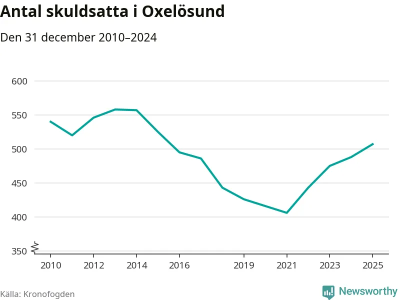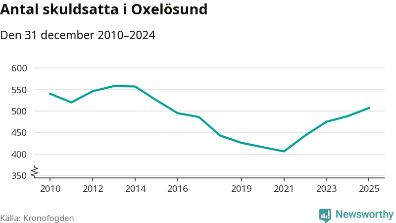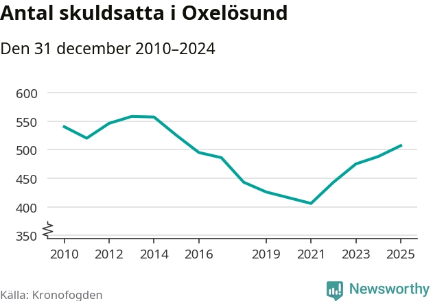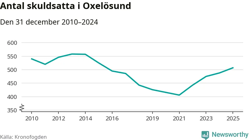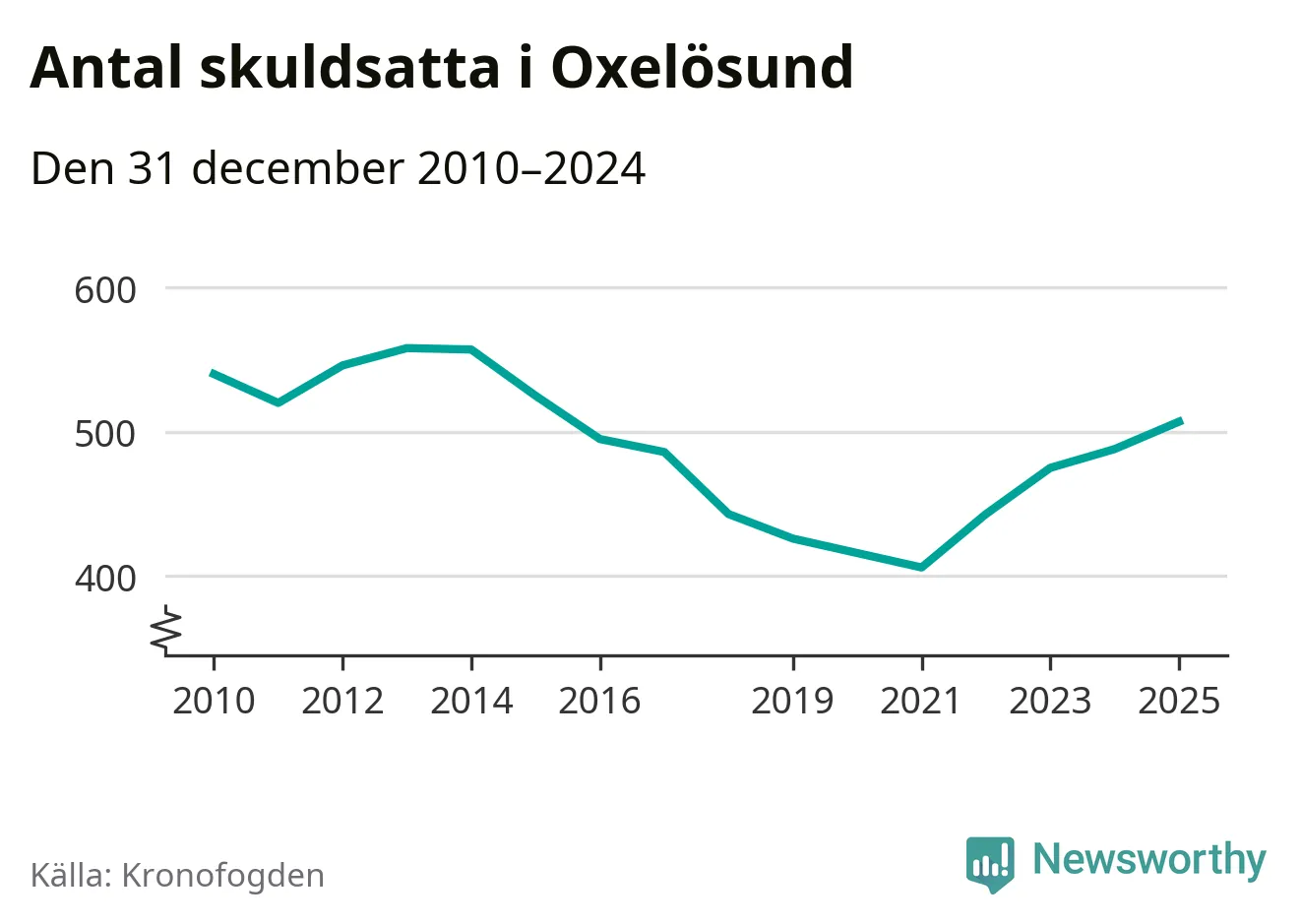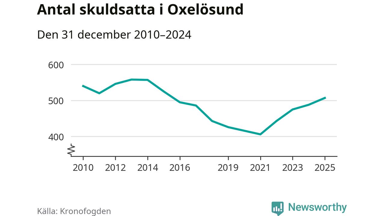 Allt fler Oxelösunds­bor hamnar hos Kronofogden. Vid årskiftet var 507 invånare i kommunen skyldiga totalt 152,9 miljoner kronor. Det är en ökning med 19 personer – eller 4 procent – jämfört med året innan. Det är det högsta antalet sedan 2015.