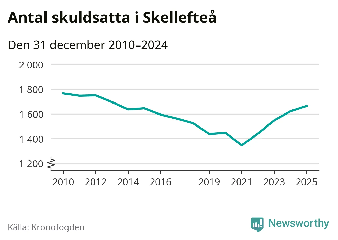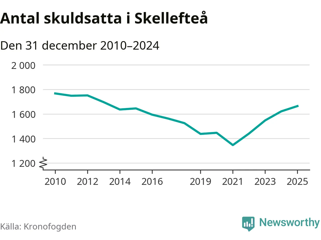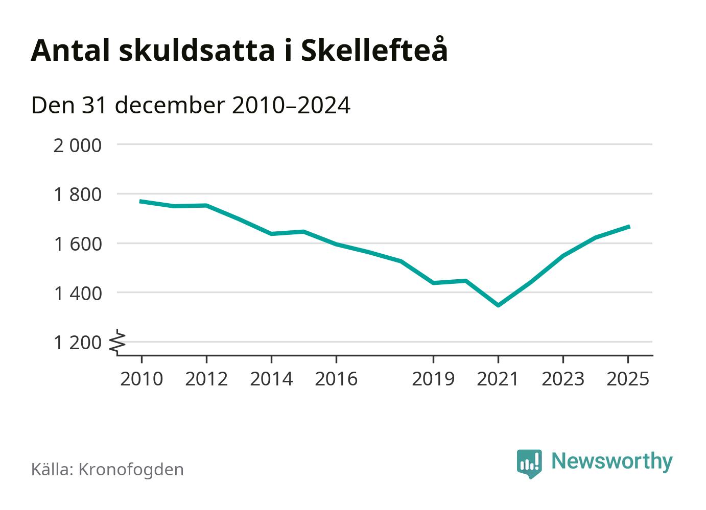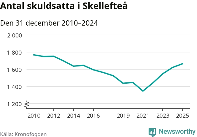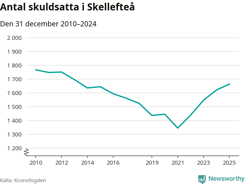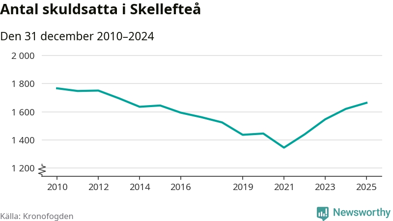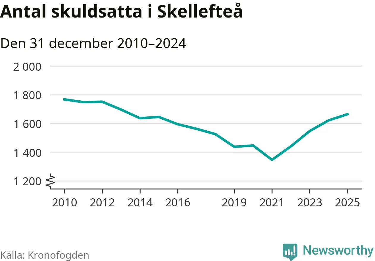 Allt fler Skellefteåbor hamnar hos Kronofogden. Vid årskiftet var 1 664 invånare i kommunen skyldiga totalt 474 miljoner kronor. Det är en ökning med 43 personer – eller 3 procent – jämfört med året innan. Det är det högsta antalet sedan 2013.