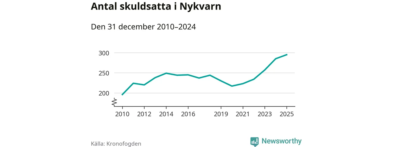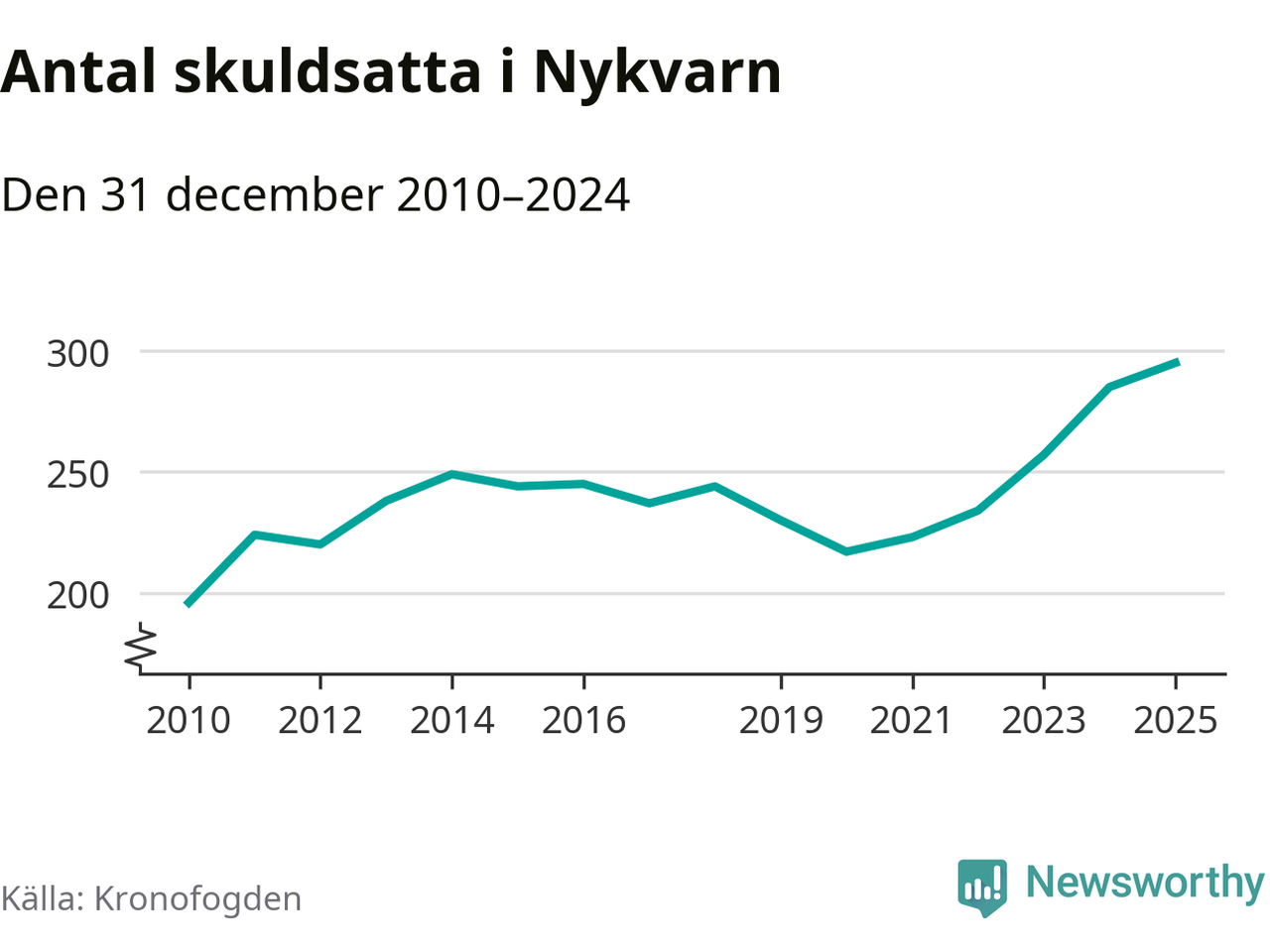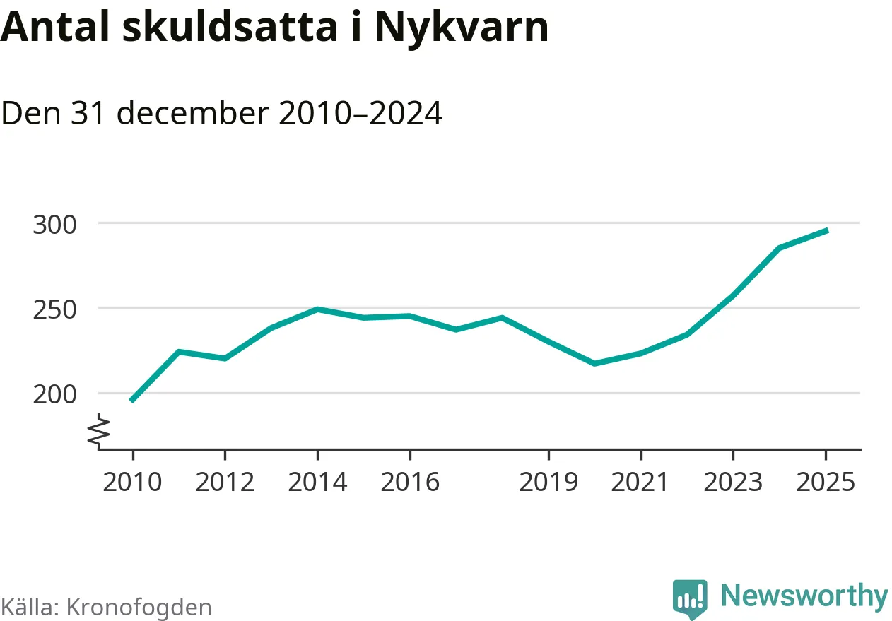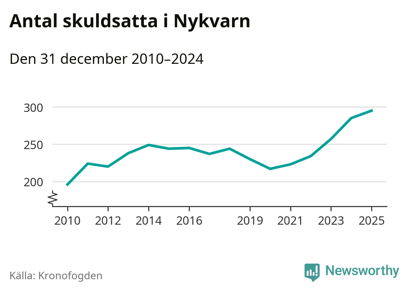 Inte sedan åtminstone 2010 har så många Nykvarns­bor hamnat hos Kronofogden. Vid årskiftet var 295 invånare i kommunen skyldiga totalt 96,4 miljoner kronor. Det är en ökning med tio personer jämfört med året innan.