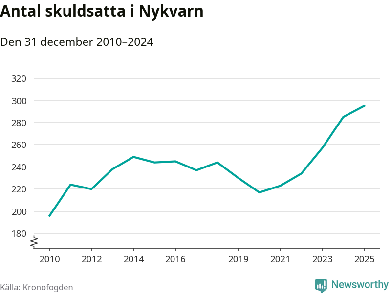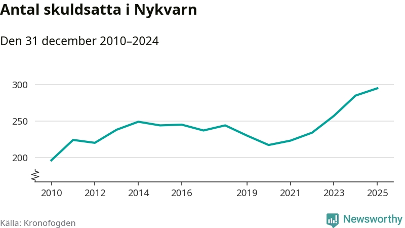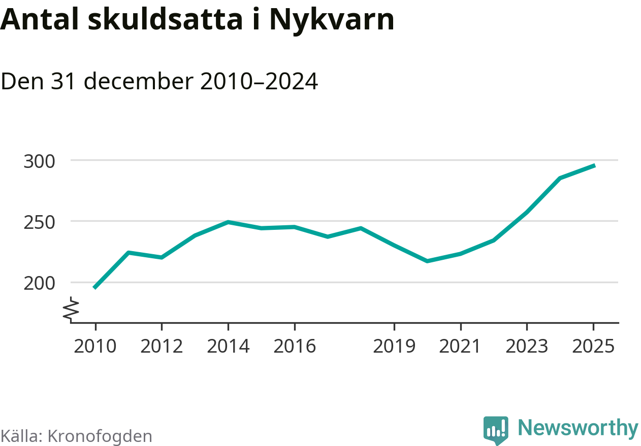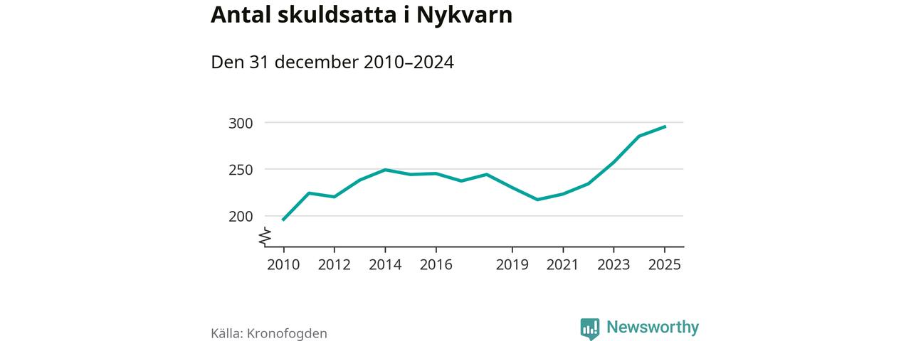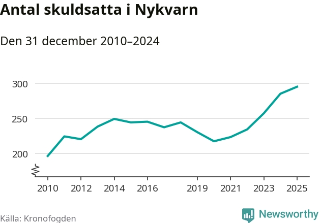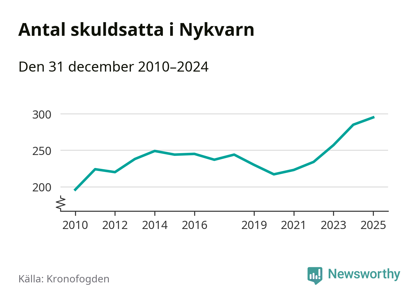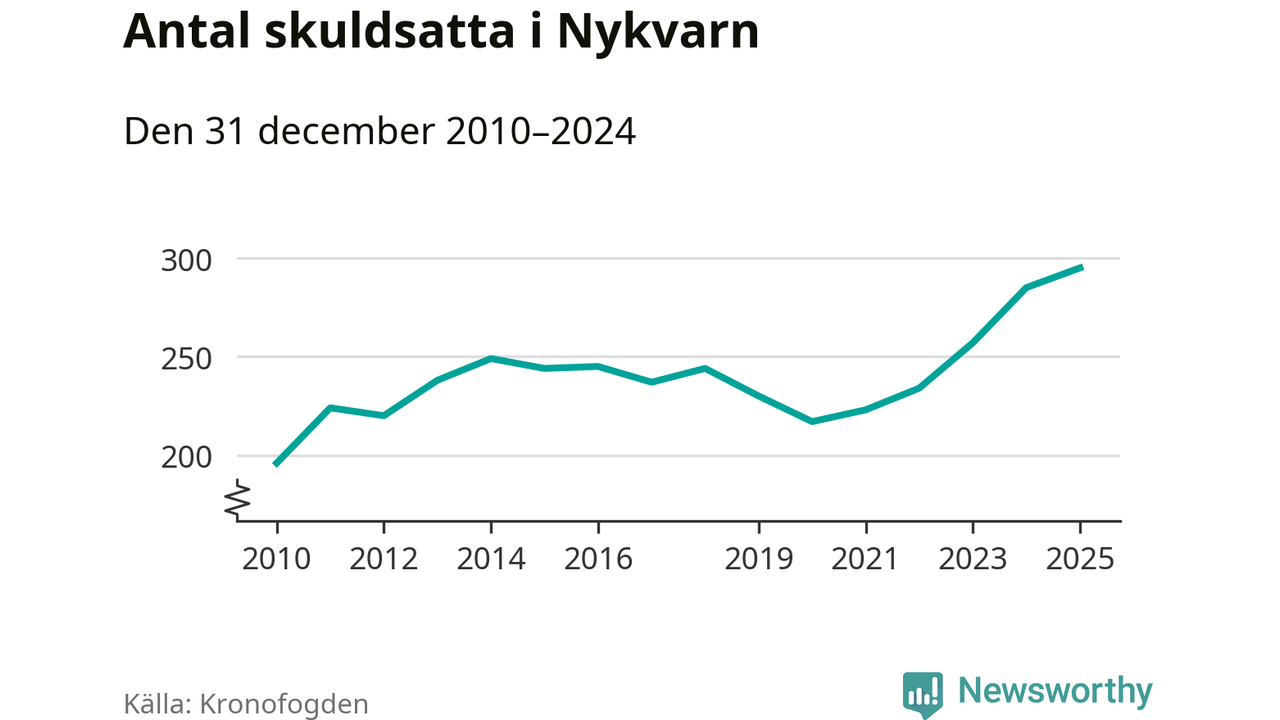 Inte sedan åtminstone 2010 har så många Nykvarns­bor hamnat hos Kronofogden. Vid årskiftet var 295 invånare i kommunen skyldiga totalt 96,4 miljoner kronor. Det är en ökning med tio personer jämfört med året innan.