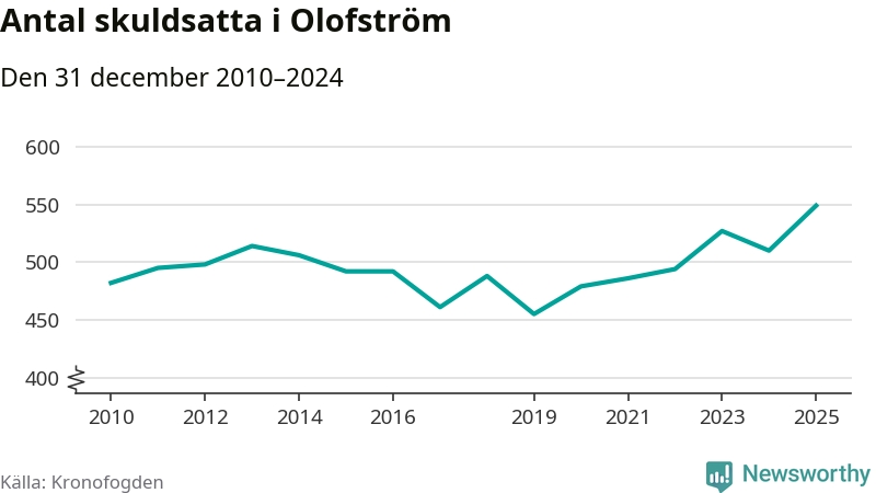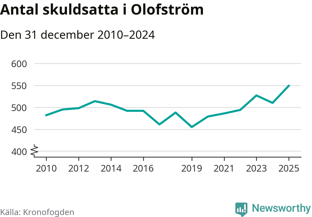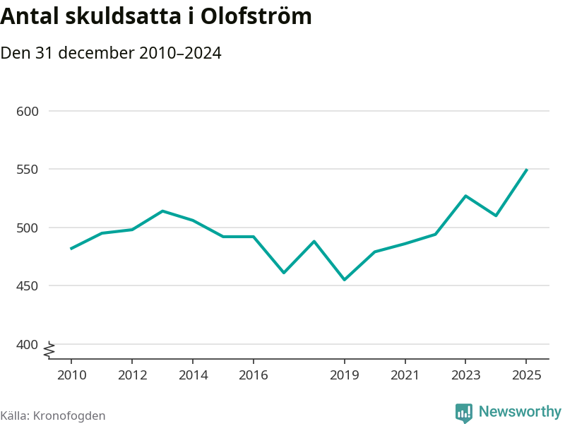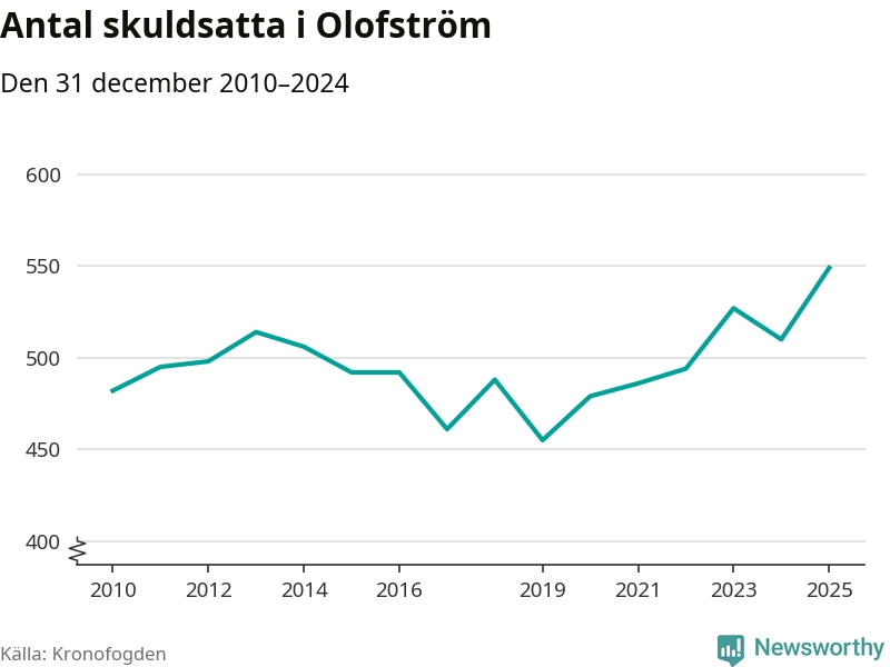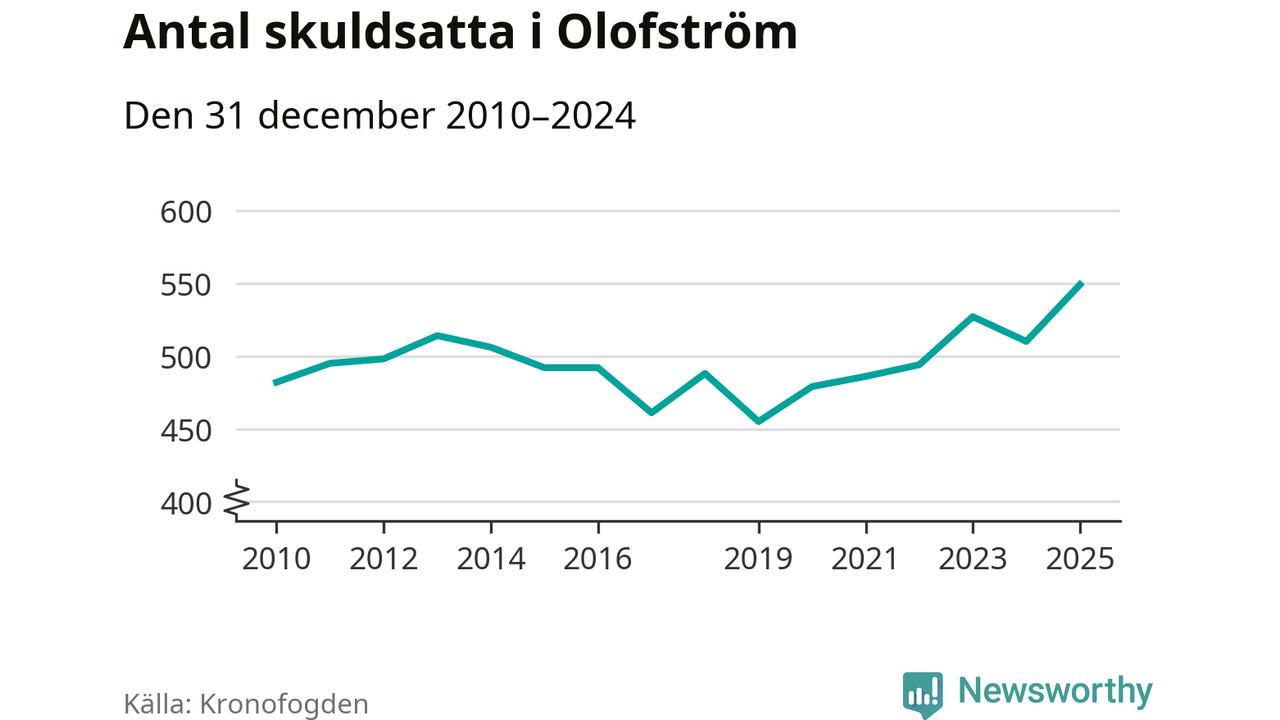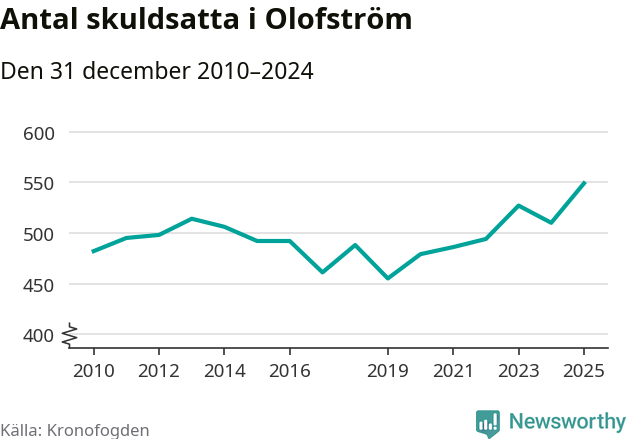 Inte sedan åtminstone 2010 har så många Olofströmsbor hamnat hos Kronofogden. Vid årskiftet var 549 invånare i kommunen skyldiga totalt 235,7 miljoner kronor. Det är en ökning med 39 personer – eller 8 procent – jämfört med året innan.