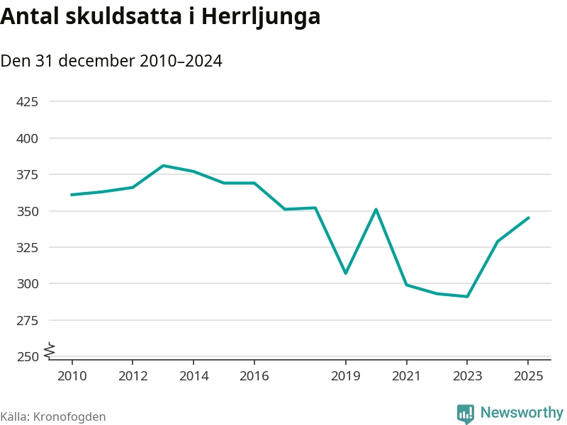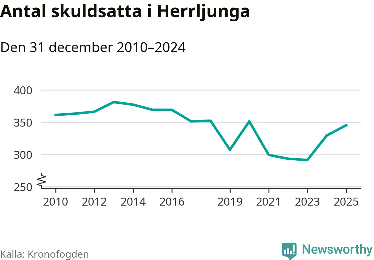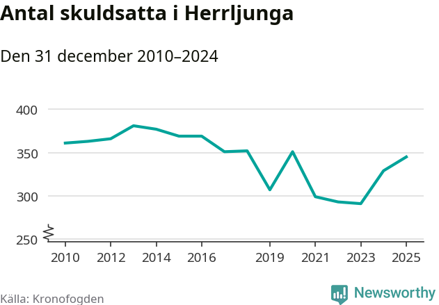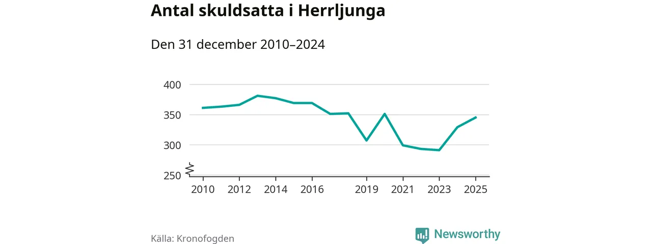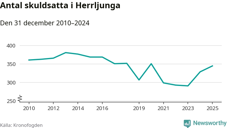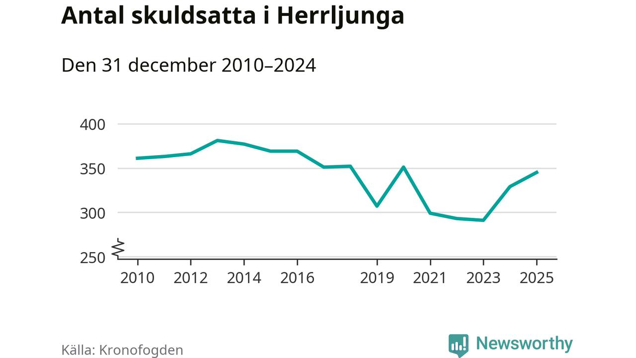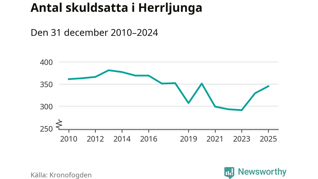 Allt fler Herrljungabor hamnar hos Kronofogden. Vid årskiftet var 345 invånare i kommunen skyldiga totalt 96,7 miljoner kronor. Det är en ökning med 16 personer – eller 5 procent – jämfört med året innan. Det är det högsta antalet sedan 2020.