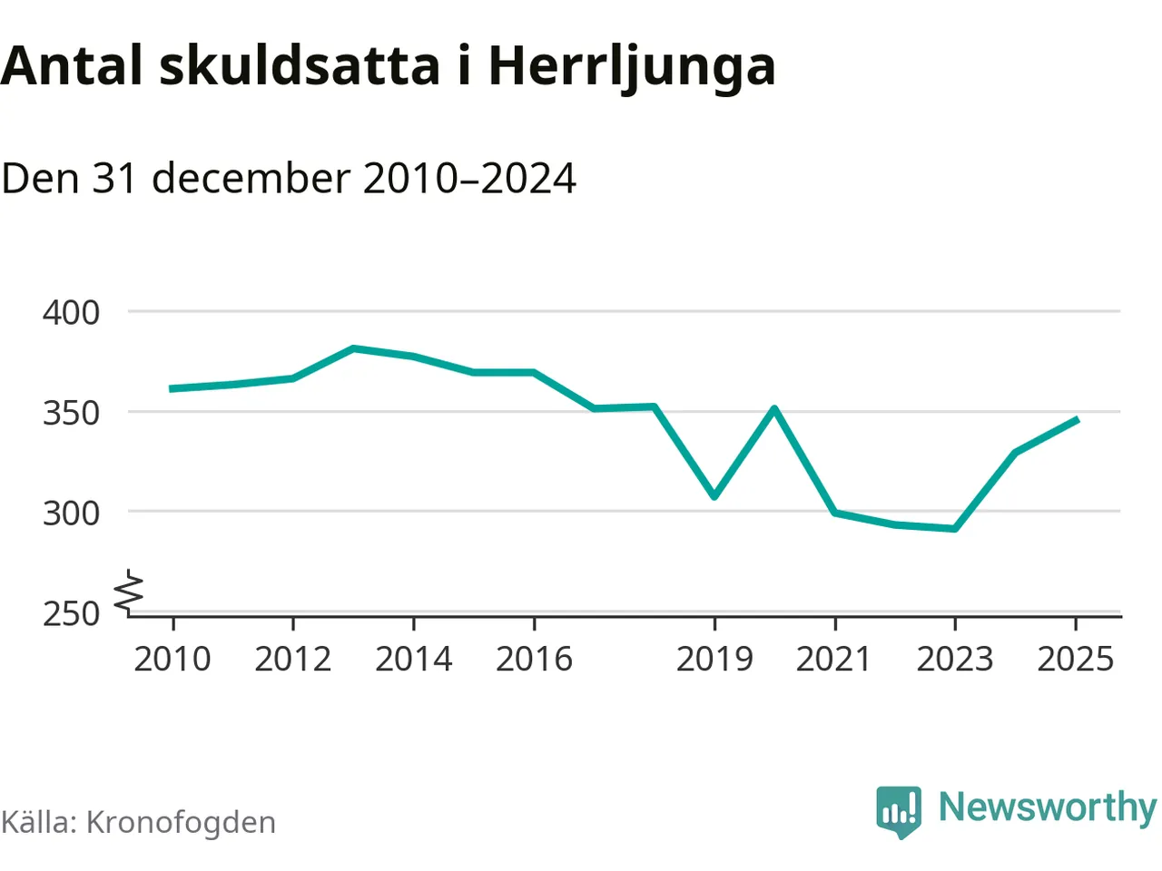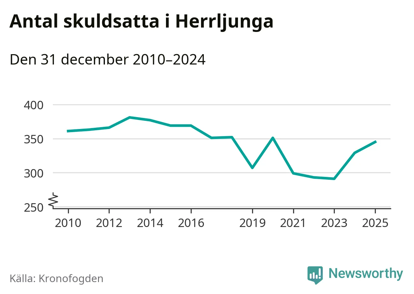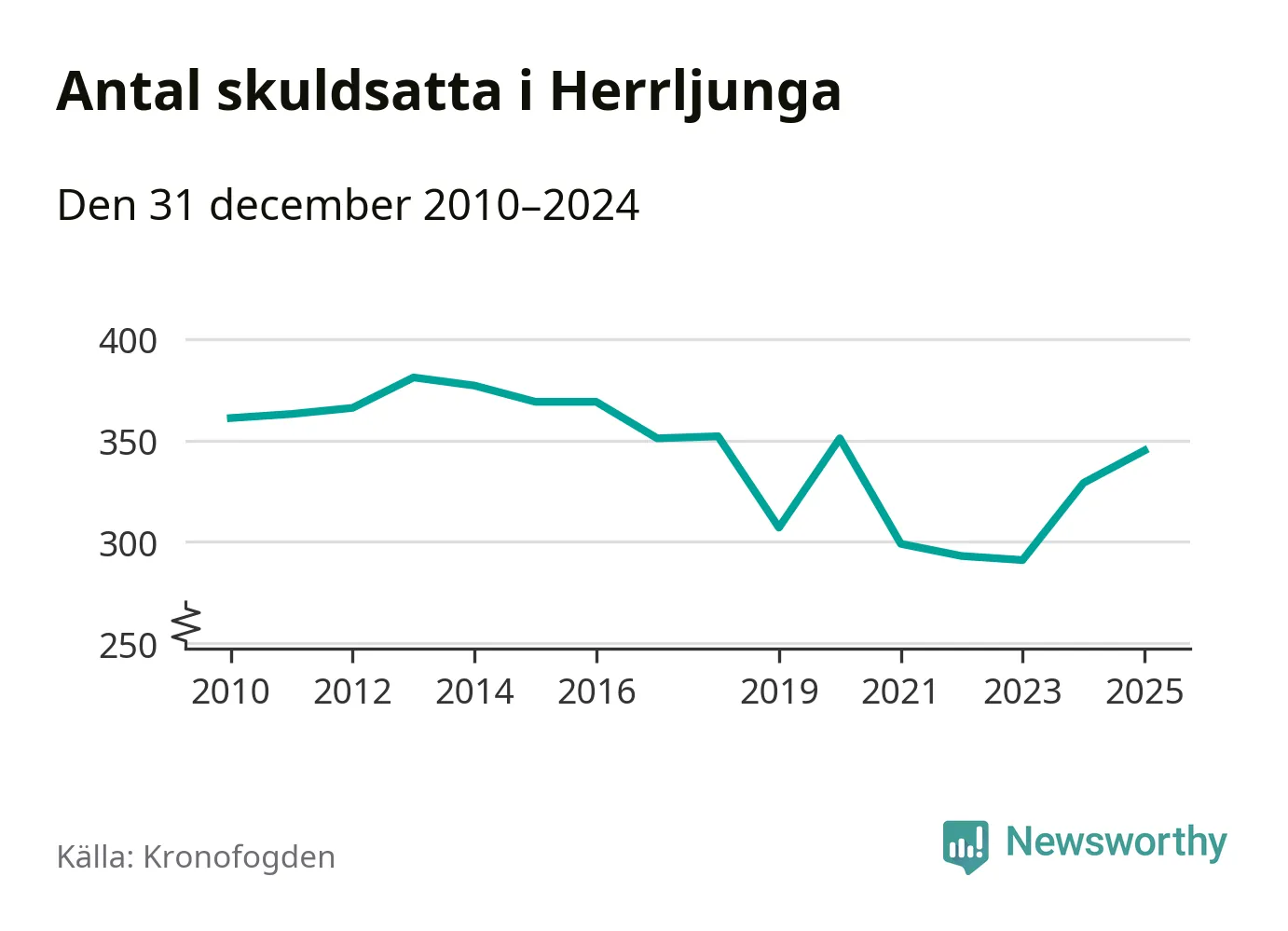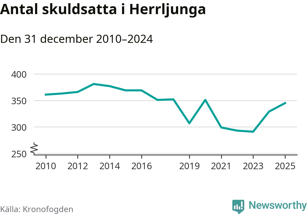 Allt fler Herrljungabor hamnar hos Kronofogden. Vid årskiftet var 345 invånare i kommunen skyldiga totalt 96,7 miljoner kronor. Det är en ökning med 16 personer – eller 5 procent – jämfört med året innan. Det är det högsta antalet sedan 2020.