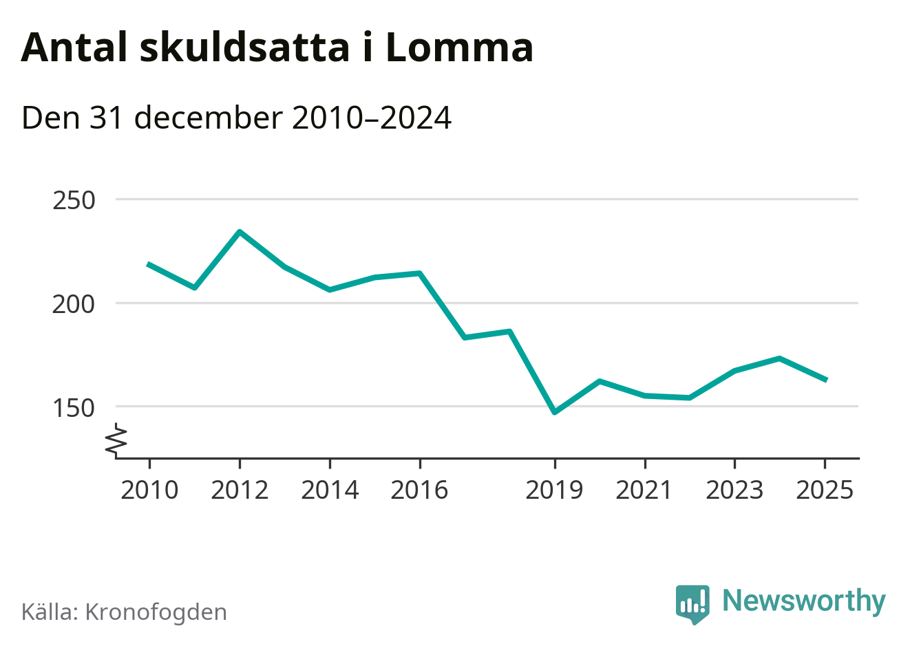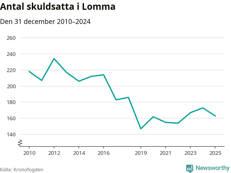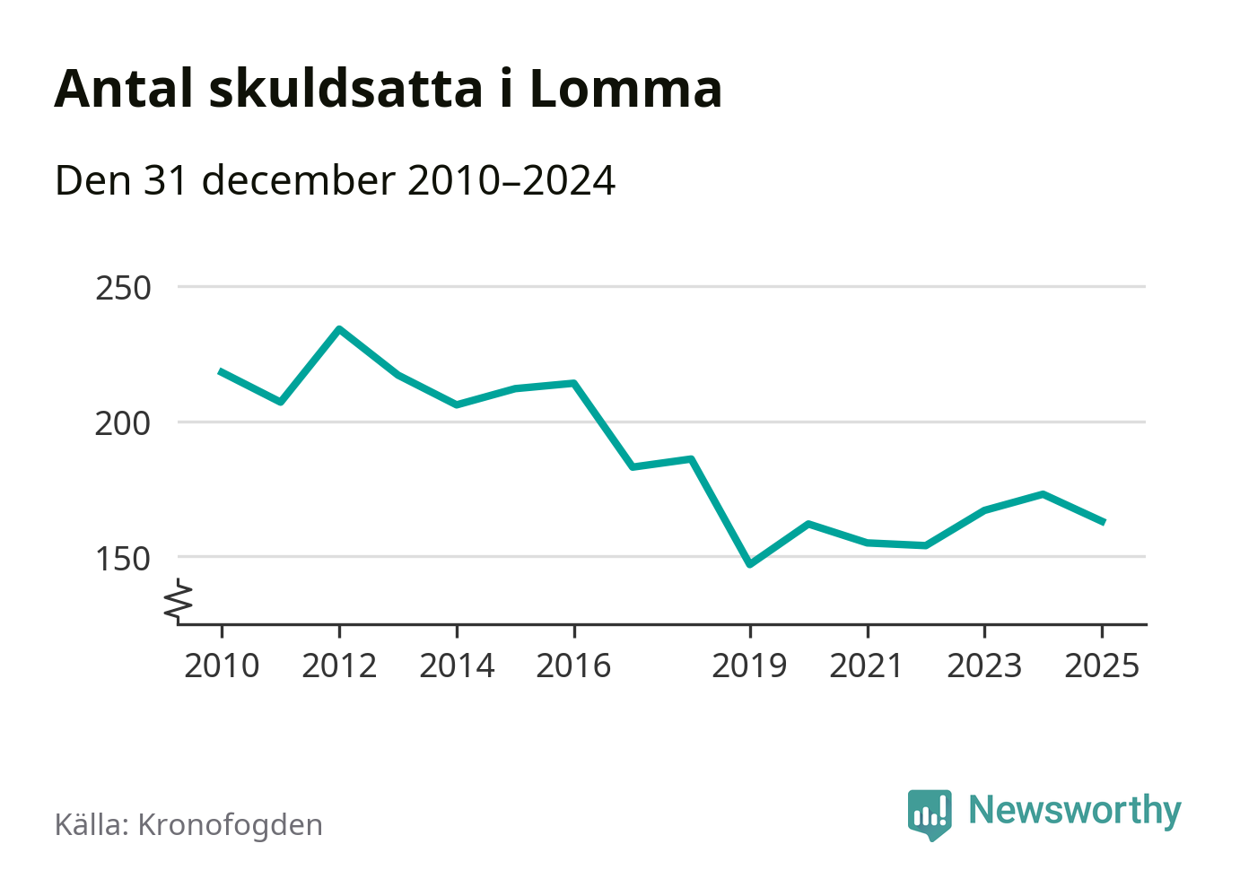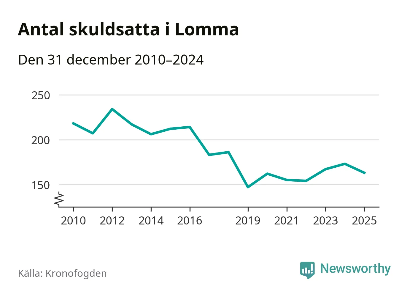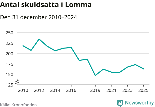 Antalet Lommabor hos Kronofogden minskade i fjol. Vid årskiftet var 163 invånare i kommunen skyldiga totalt 49,1 miljoner kronor. Det är en minskning med tio personer jämfört med året innan.