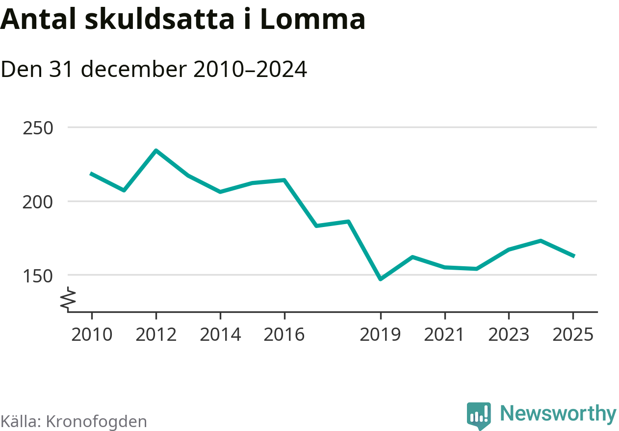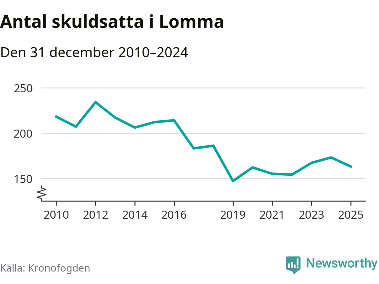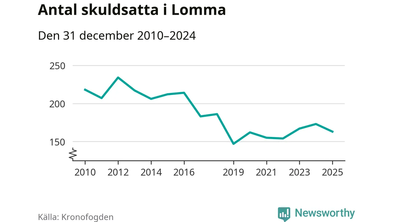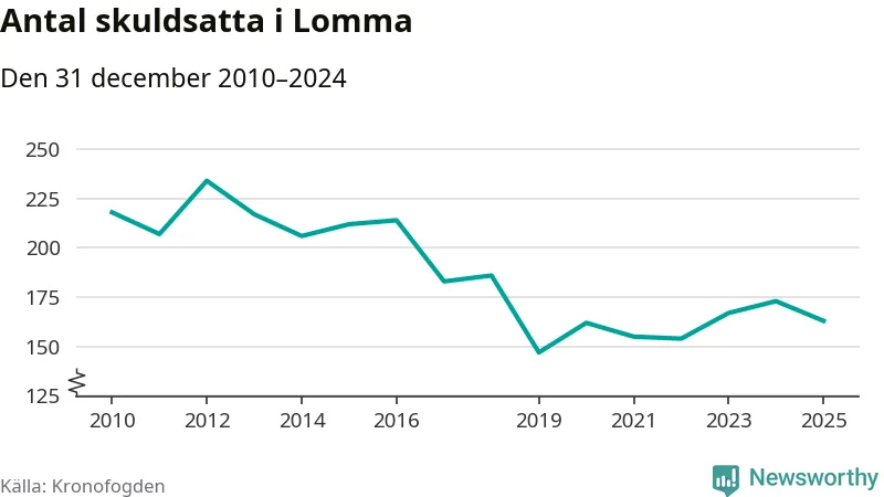 Antalet Lommabor hos Kronofogden minskade i fjol. Vid årskiftet var 163 invånare i kommunen skyldiga totalt 49,1 miljoner kronor. Det är en minskning med tio personer jämfört med året innan.