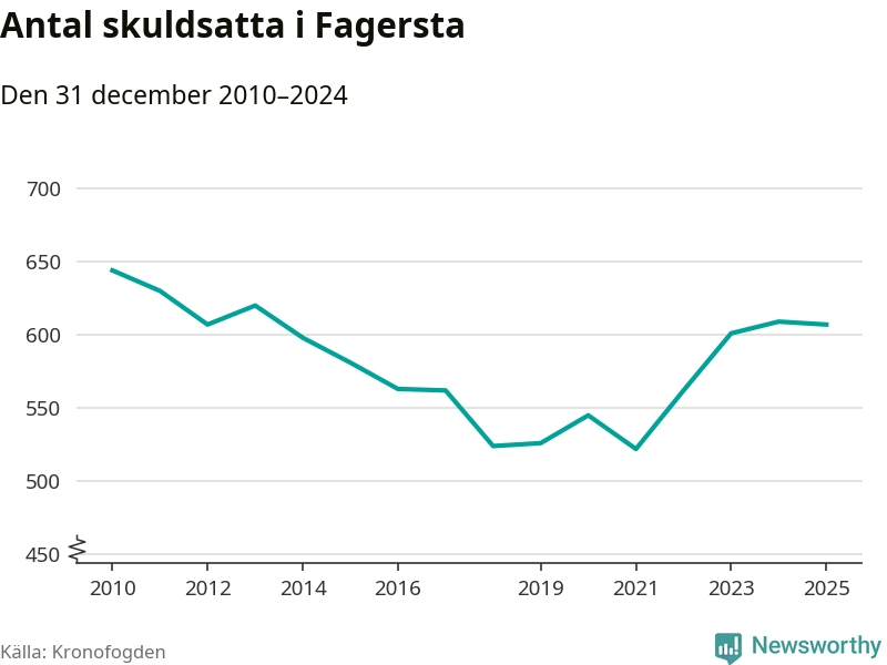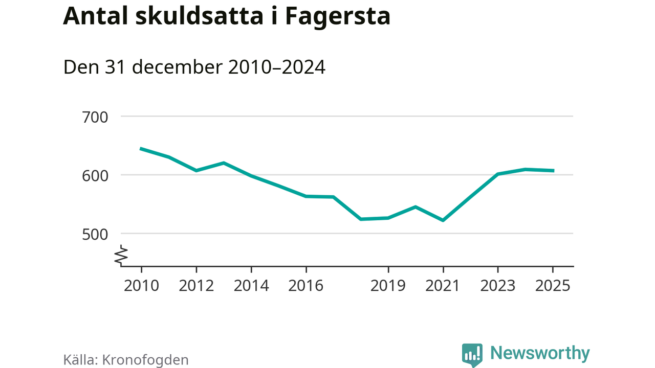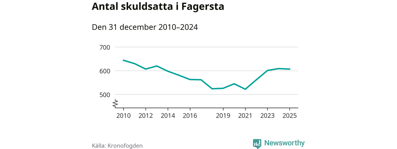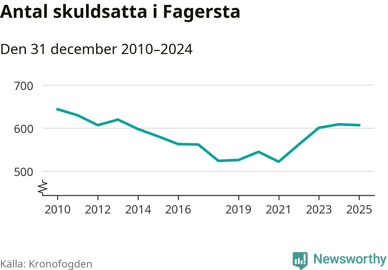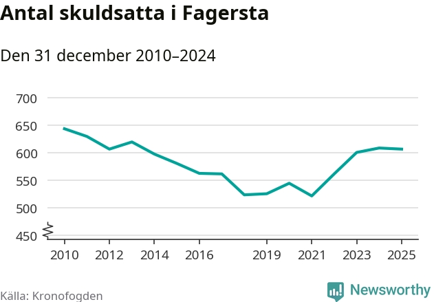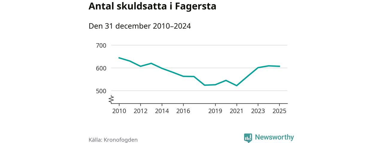 Antalet Fagerstabor hos Kronofogden är relativt oförändrat jämfört med i fjol. Vid årskiftet var 607 invånare i kommunen skyldiga totalt 166,5 miljoner kronor.