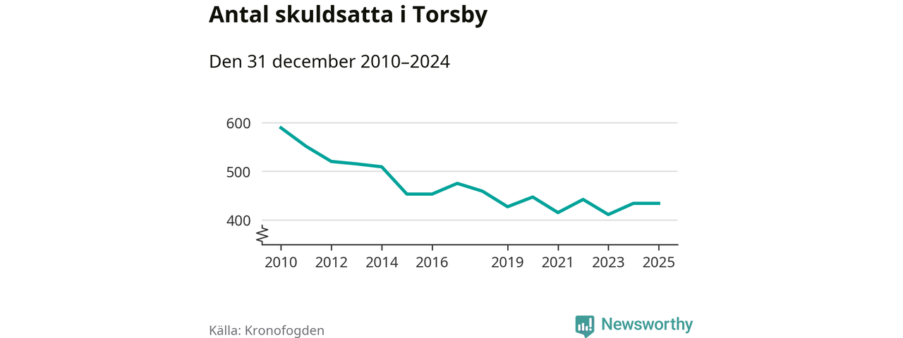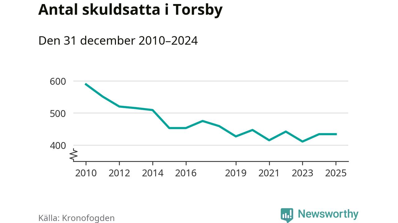 Vid årskiftet var 5 procent av alla Torsby­bor över 18 år registrerade hos Kronofogden. Störst andel skuldsatta i länet finns i Filipstad (8 procent), medan den lägsta andelen finns på Hammarö (2 procent).