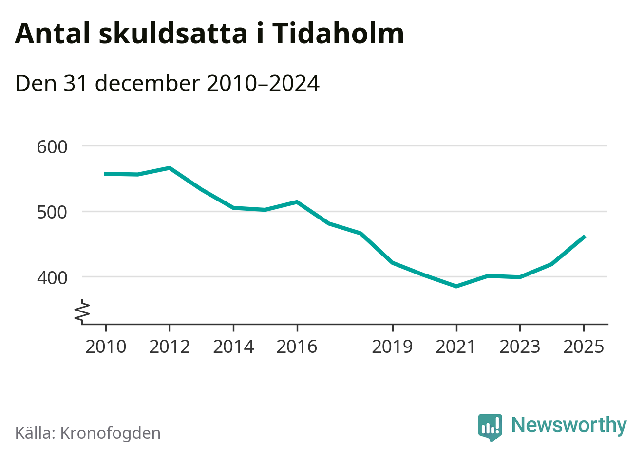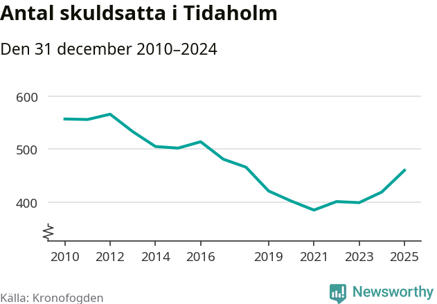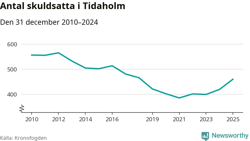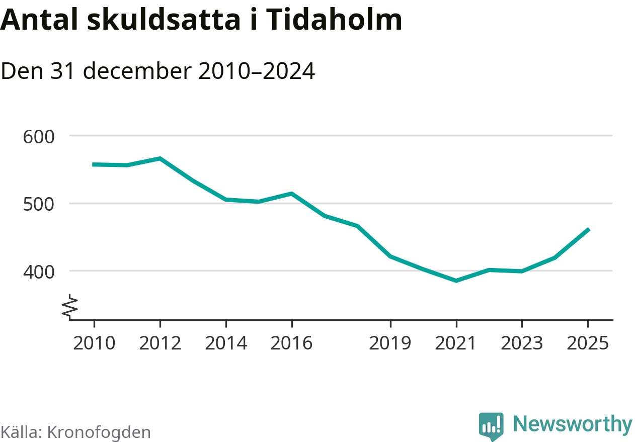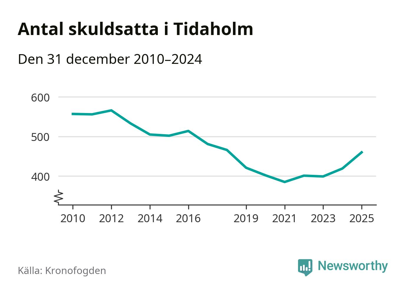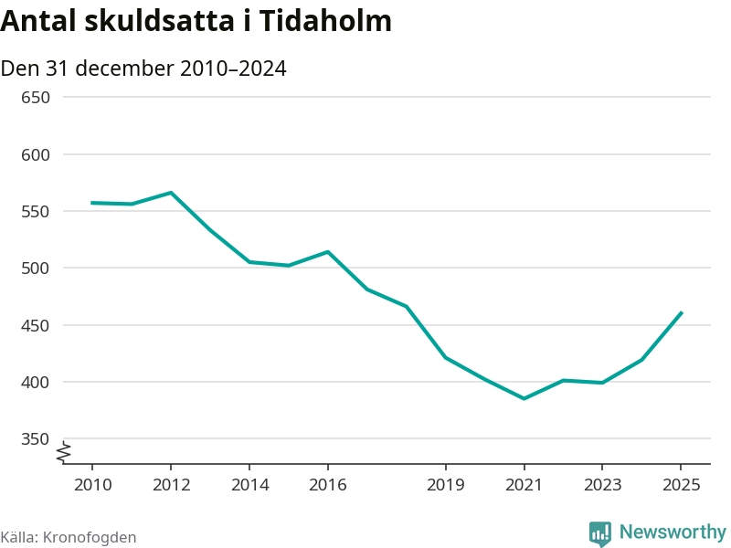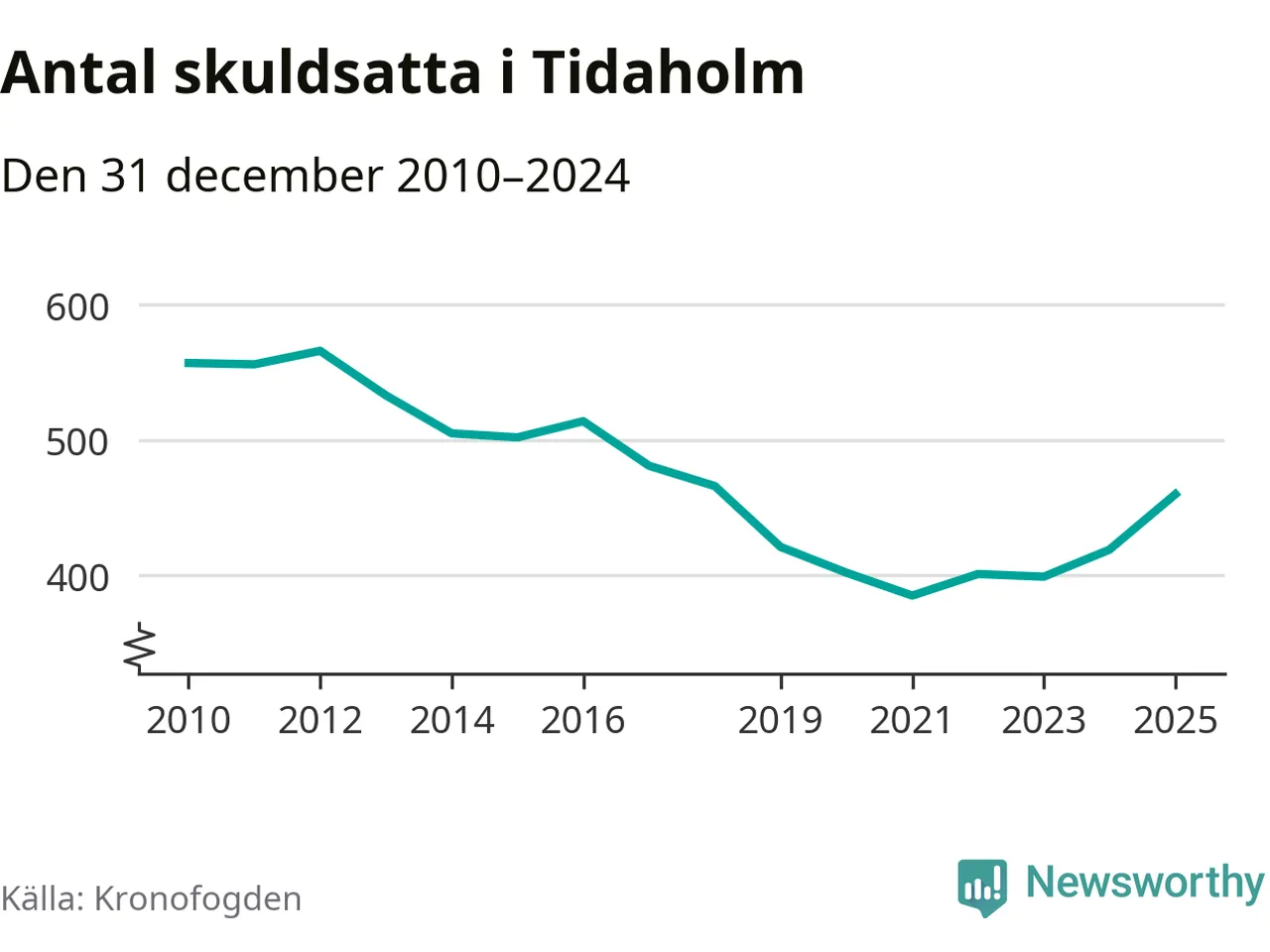 Allt fler tidaholmare hamnar hos Kronofogden. Vid årskiftet var 460 invånare i kommunen skyldiga totalt 117,5 miljoner kronor. Det är en ökning med 41 personer – eller 10 procent – jämfört med året innan. Det är det högsta antalet sedan 2018.
