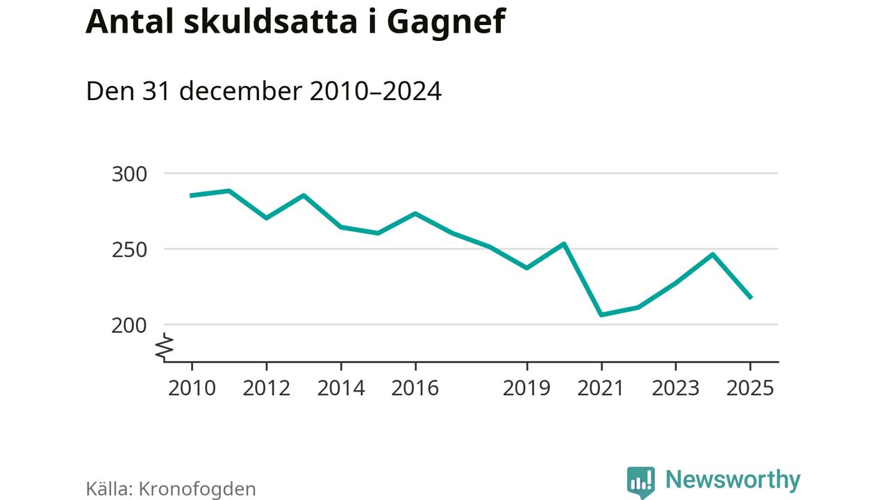 Vid årskiftet var 3 procent av alla Gagnefsbor över 18 år registrerade hos Kronofogden. Det är den lägsta andelen av alla kommuner i Dalarna. Störst andel skuldsatta i länet finns i Hedemora (5 procent).