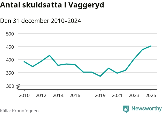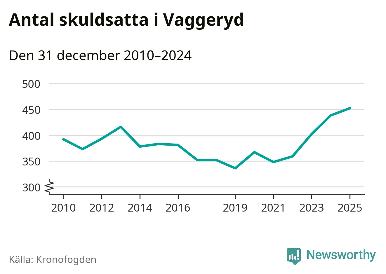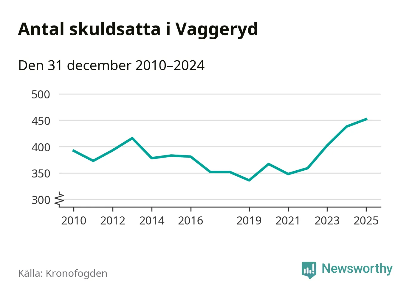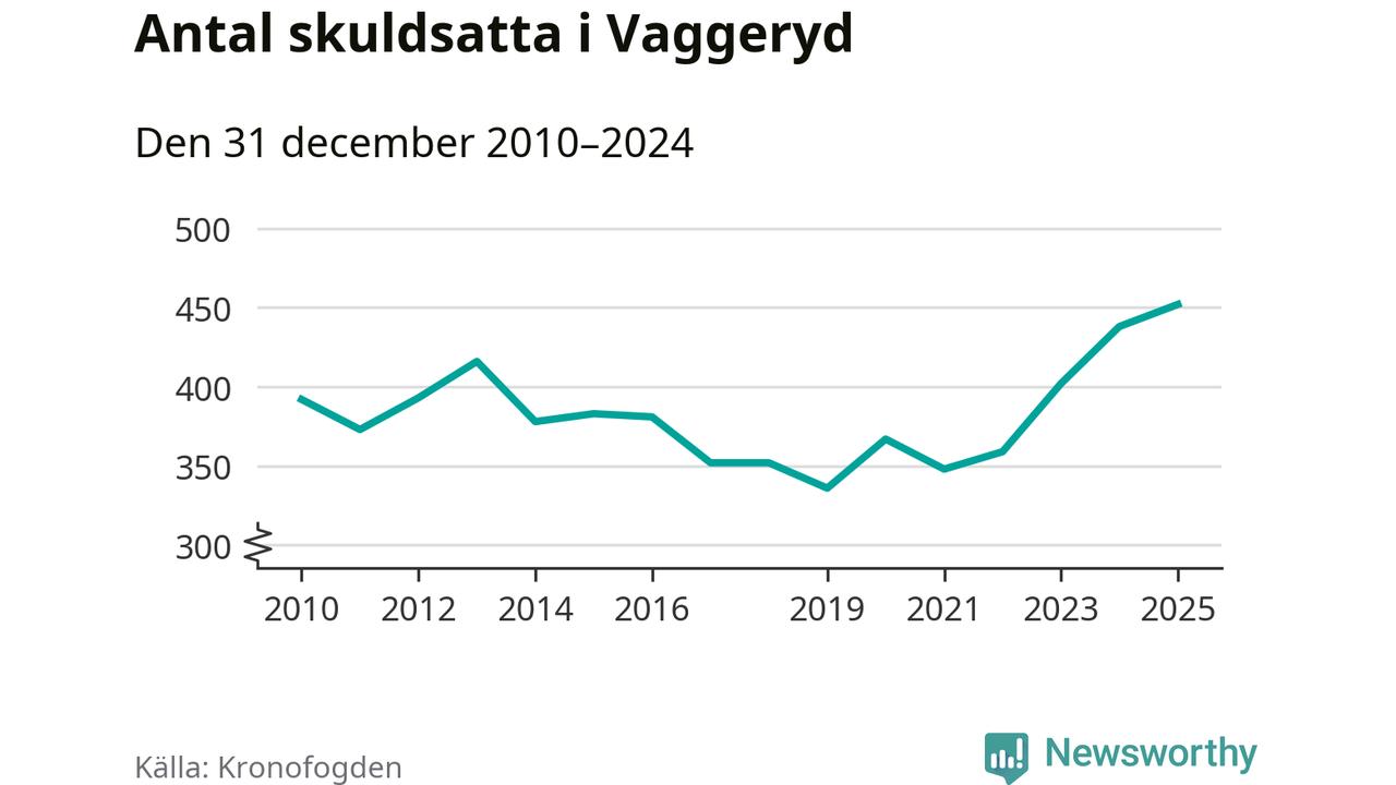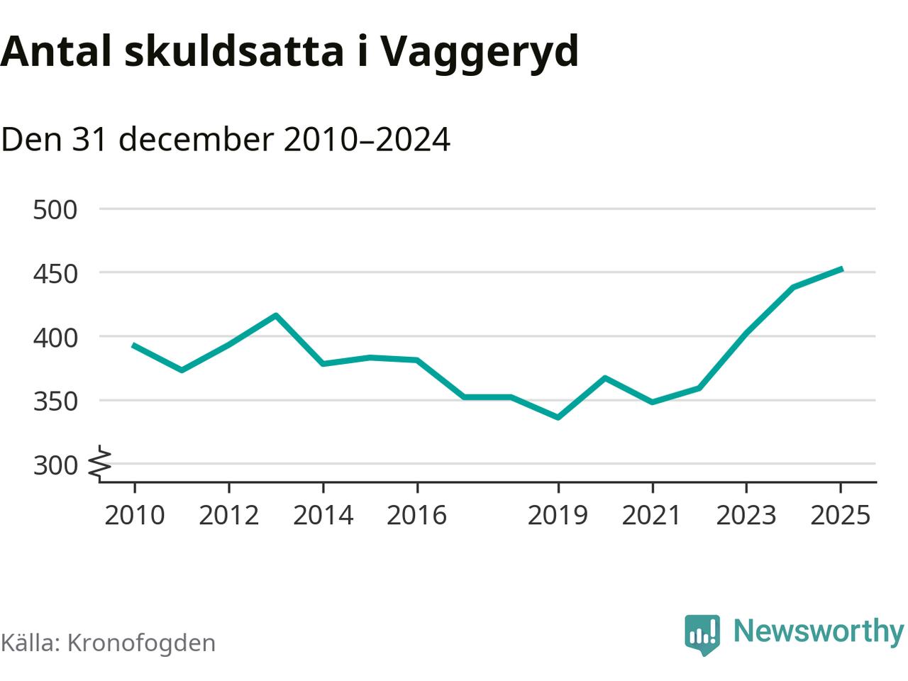 Inte sedan åtminstone 2010 har så många Vaggeryds­bor hamnat hos Kronofogden. Vid årskiftet var 452 invånare i kommunen skyldiga totalt 148,9 miljoner kronor. Det är en ökning med 14 personer – eller 3 procent – jämfört med året innan.
