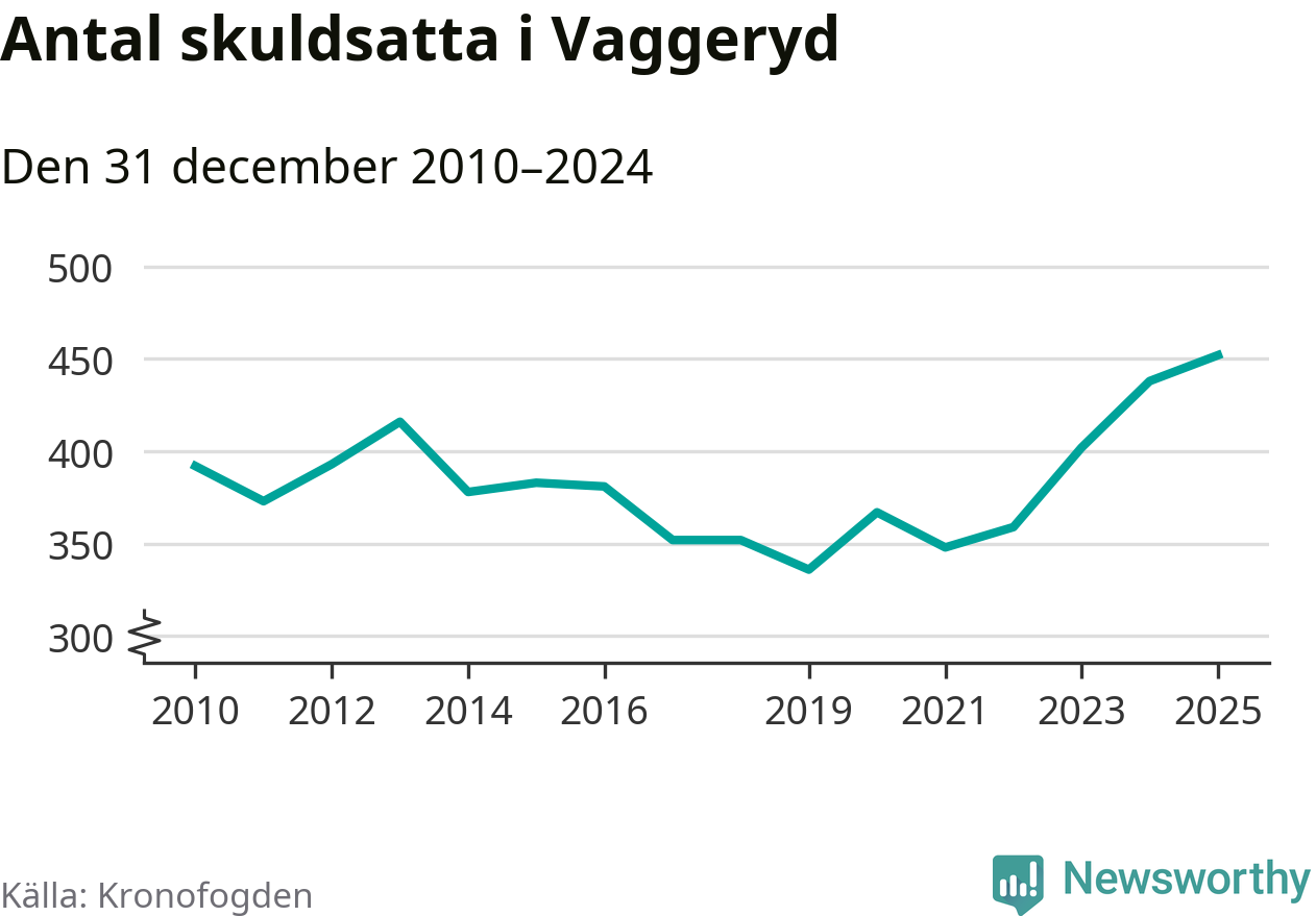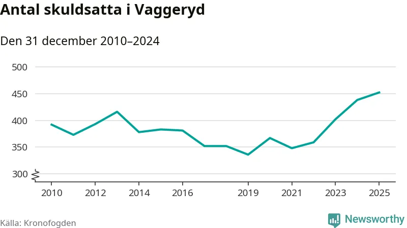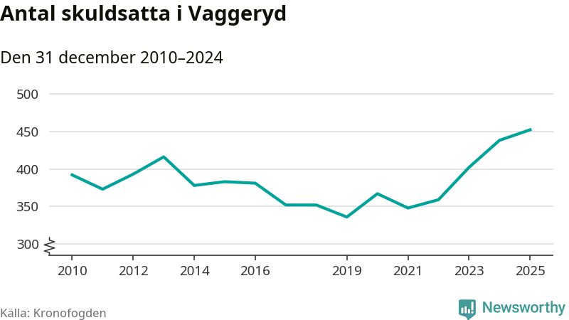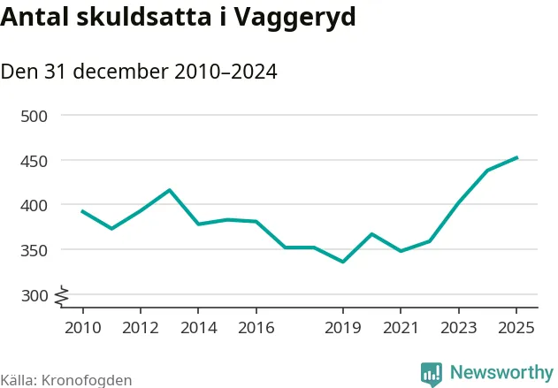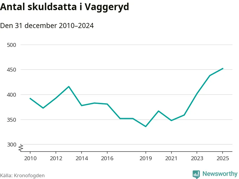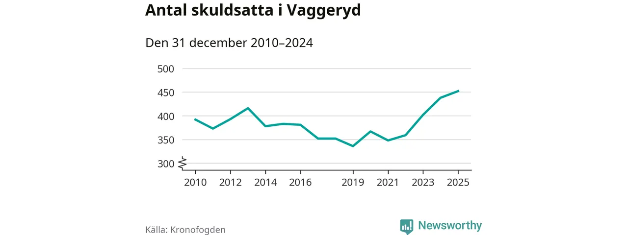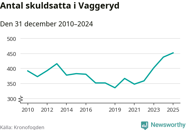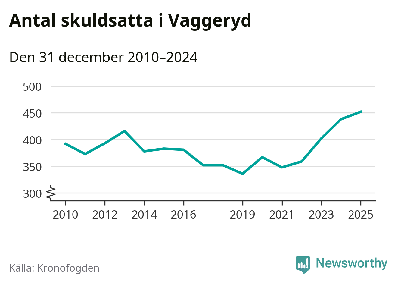 Inte sedan åtminstone 2010 har så många Vaggeryds­bor hamnat hos Kronofogden. Vid årskiftet var 452 invånare i kommunen skyldiga totalt 148,9 miljoner kronor. Det är en ökning med 14 personer – eller 3 procent – jämfört med året innan.