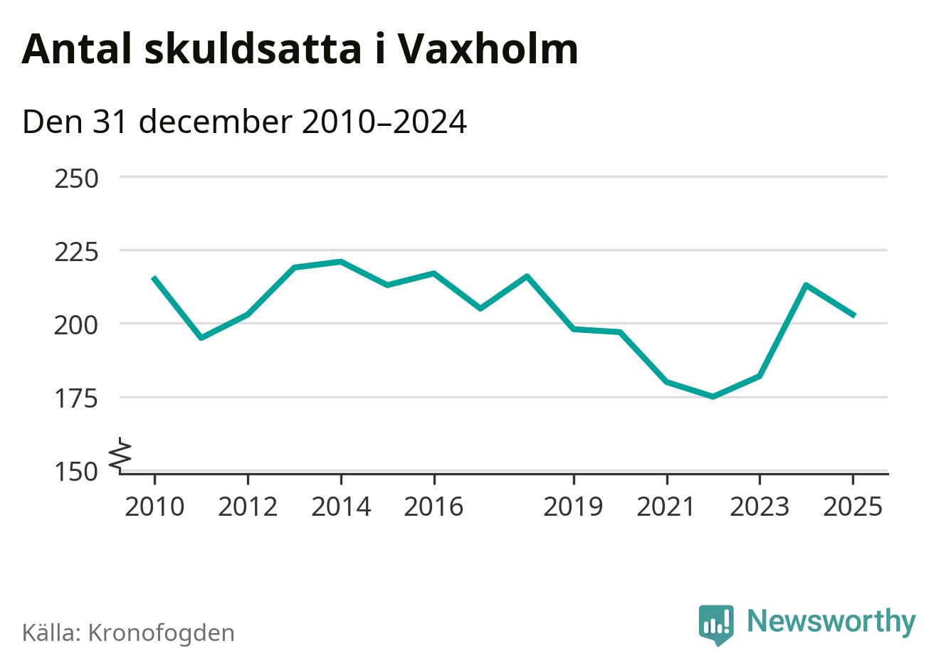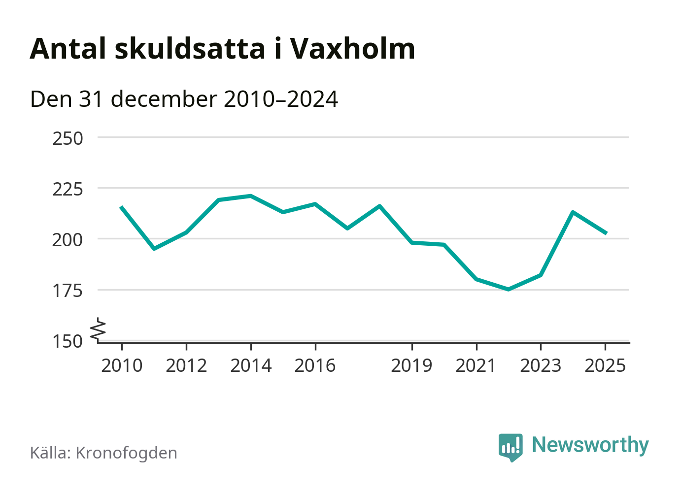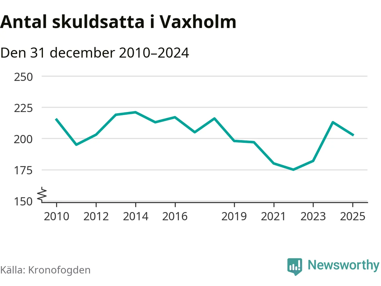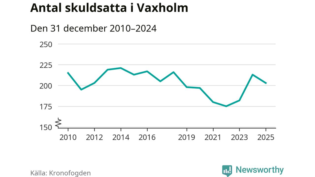 Vid årskiftet var 2 procent av alla Vaxholmsbor över 18 år registrerade hos Kronofogden. Störst andel skuldsatta i länet finns i Botkyrka (6 procent), medan den lägsta andelen finns i Danderyd (1 procent).