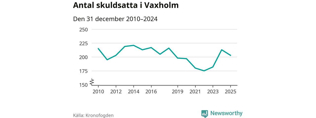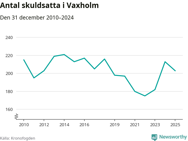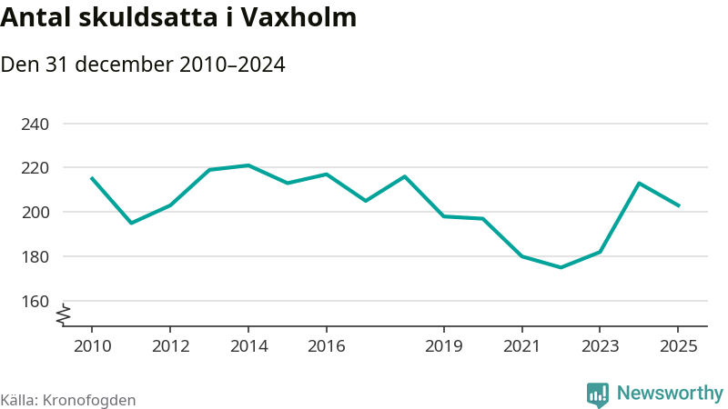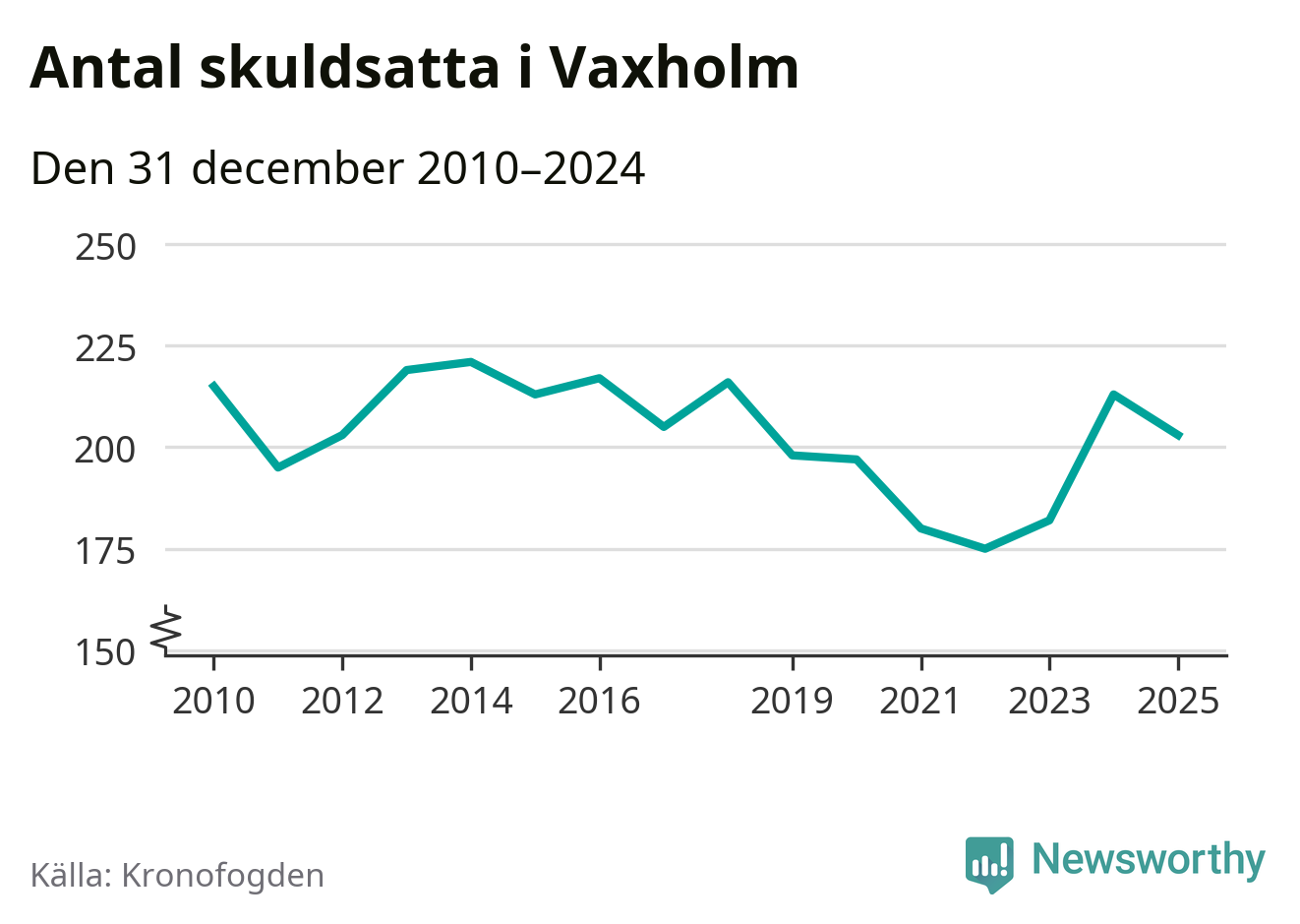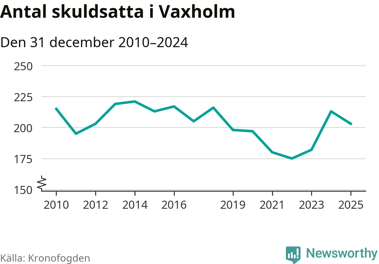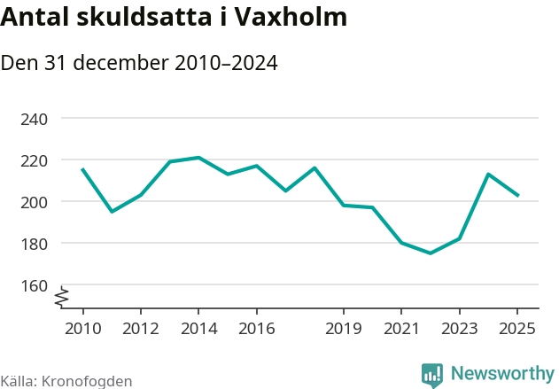 Vid årskiftet var 2 procent av alla Vaxholmsbor över 18 år registrerade hos Kronofogden. Störst andel skuldsatta i länet finns i Botkyrka (6 procent), medan den lägsta andelen finns i Danderyd (1 procent).