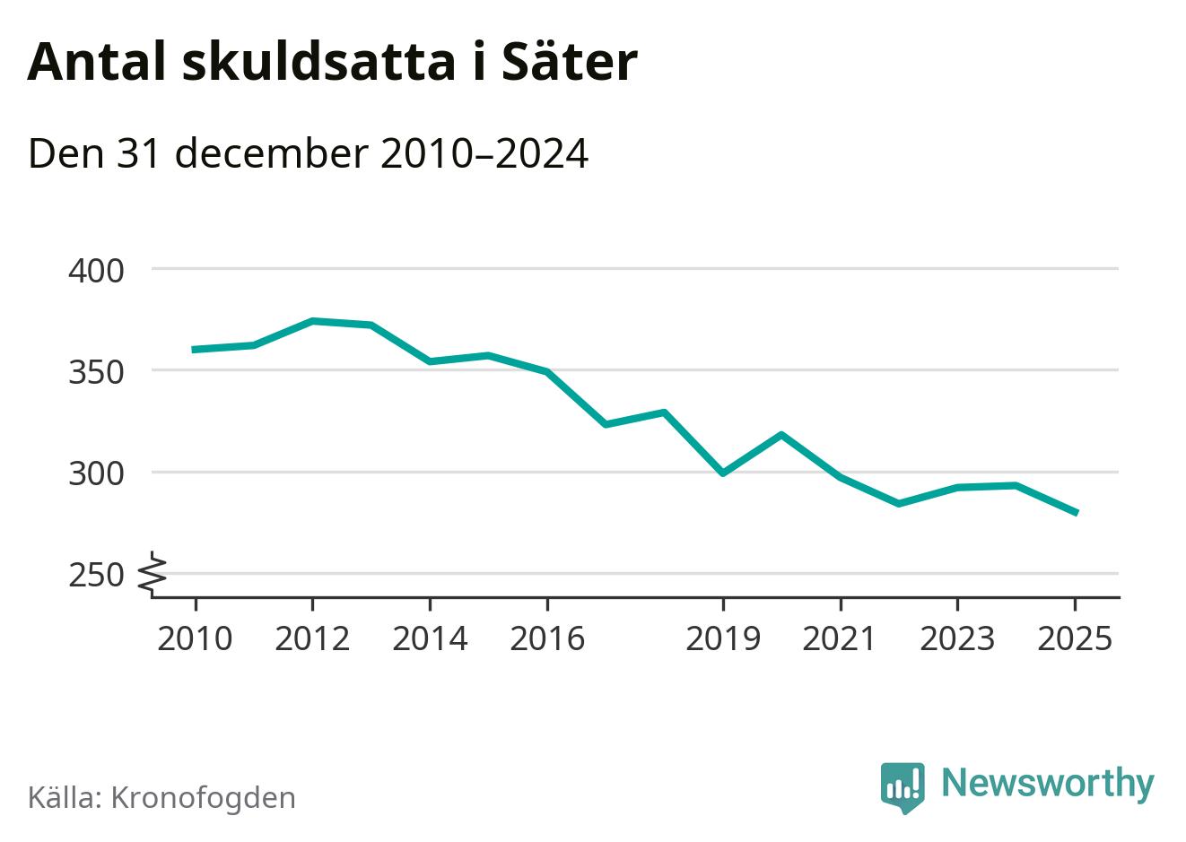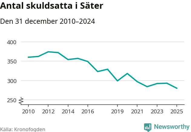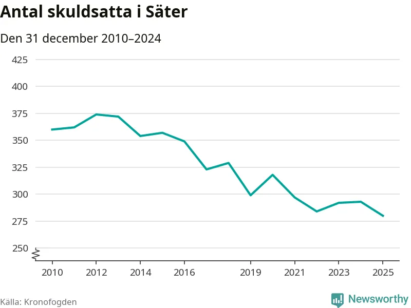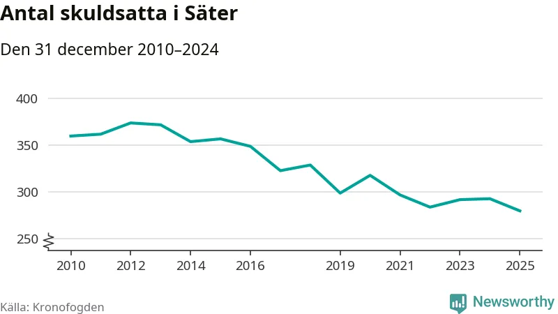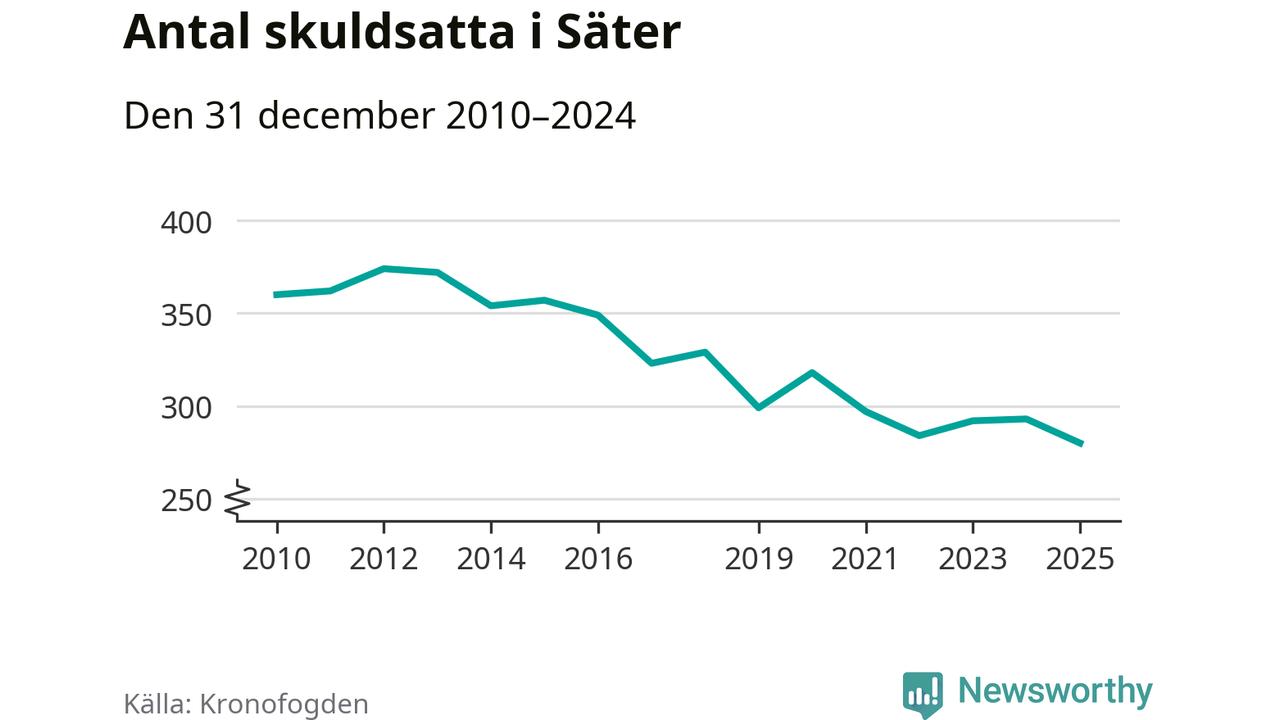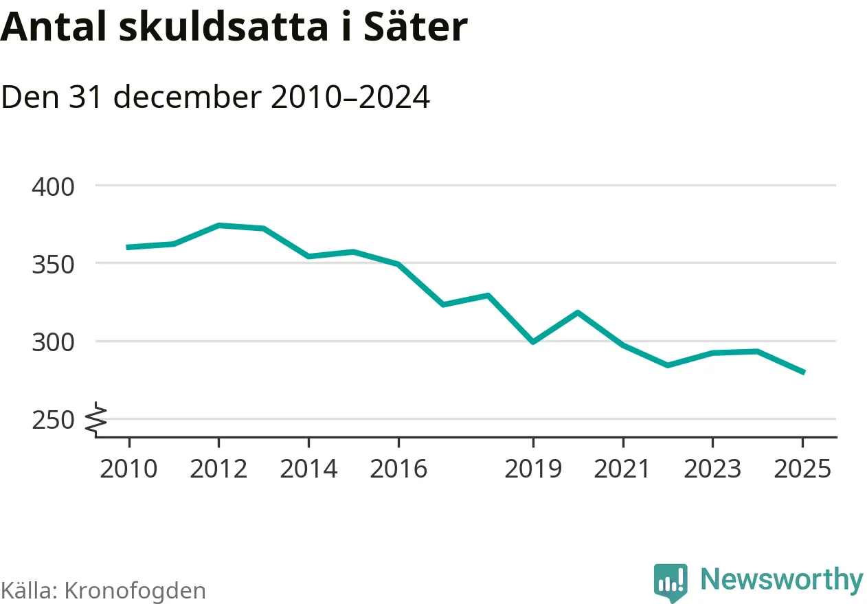 Inte sedan åtminstone 2010 har antalet registrerade hos Kronofogden i Säter varit så lågt. Vid årskiftet var 280 invånare i kommunen skyldiga totalt 86,6 miljoner kronor. Det är en minskning med 13 personer – eller 4 procent – jämfört med året innan.