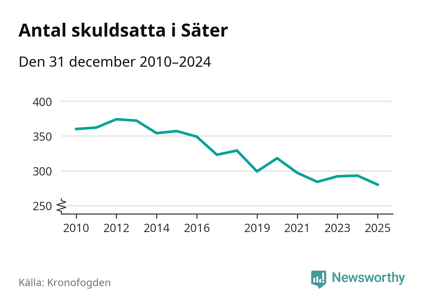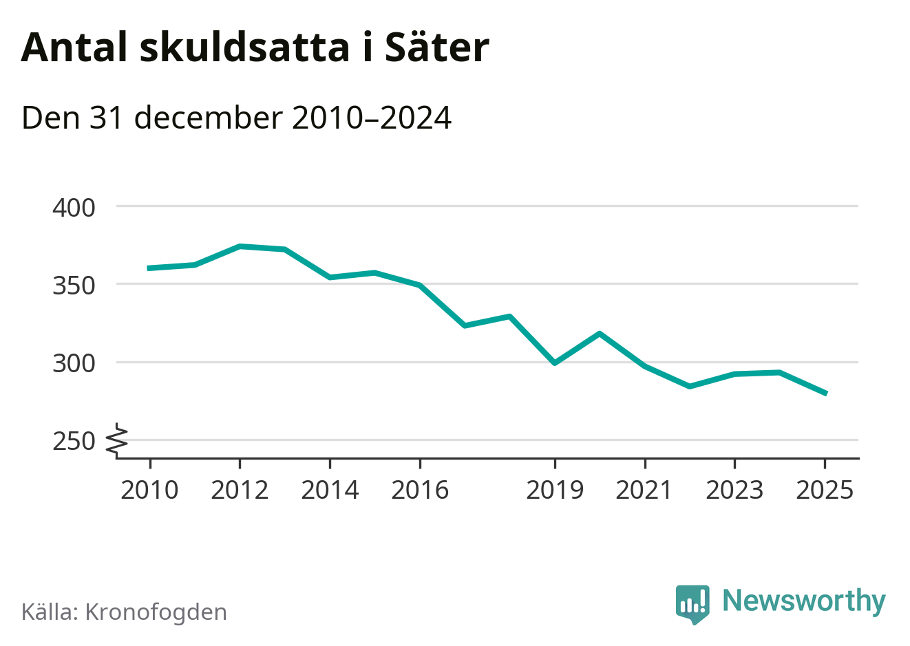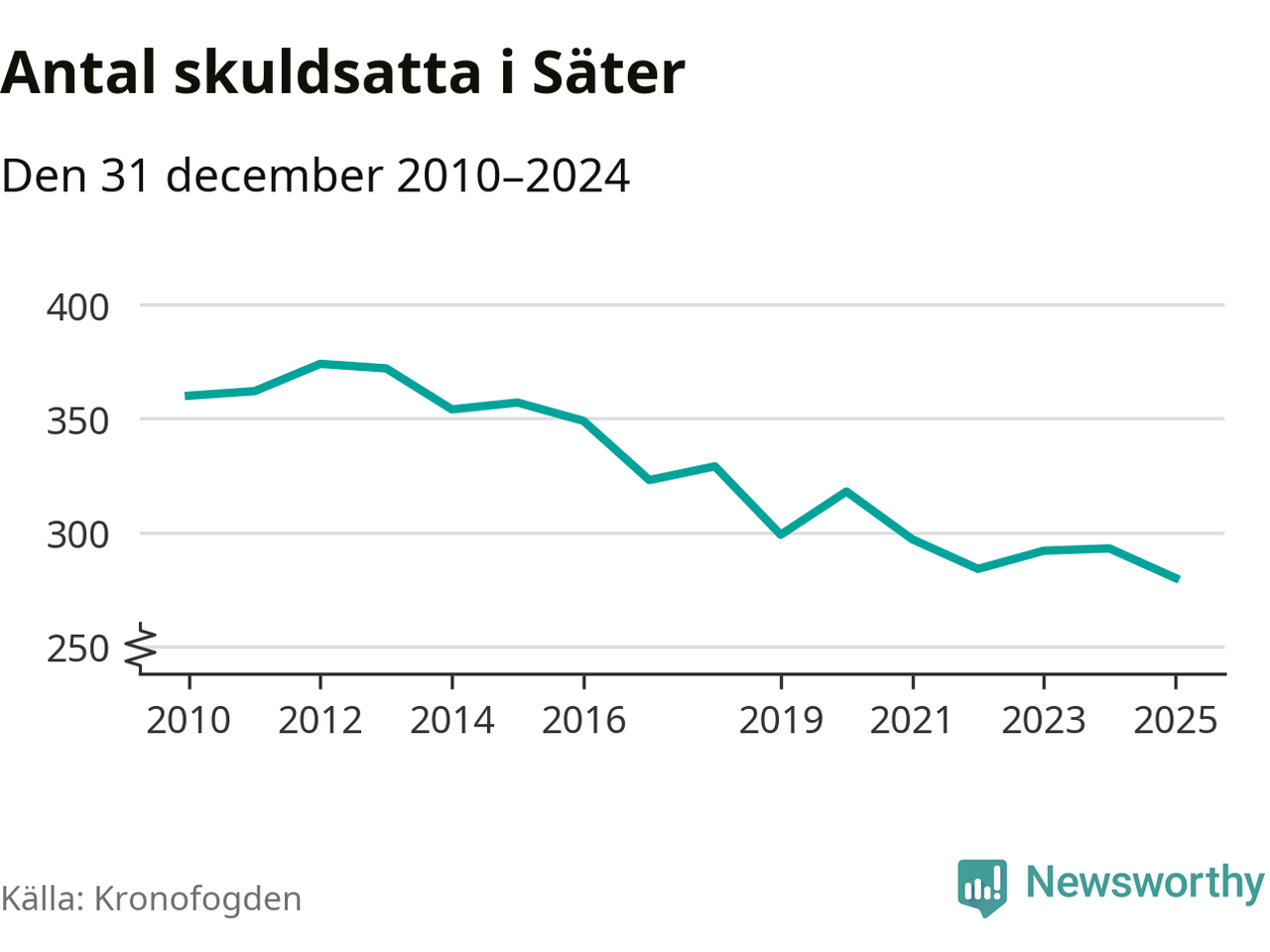 Inte sedan åtminstone 2010 har antalet registrerade hos Kronofogden i Säter varit så lågt. Vid årskiftet var 280 invånare i kommunen skyldiga totalt 86,6 miljoner kronor. Det är en minskning med 13 personer – eller 4 procent – jämfört med året innan.