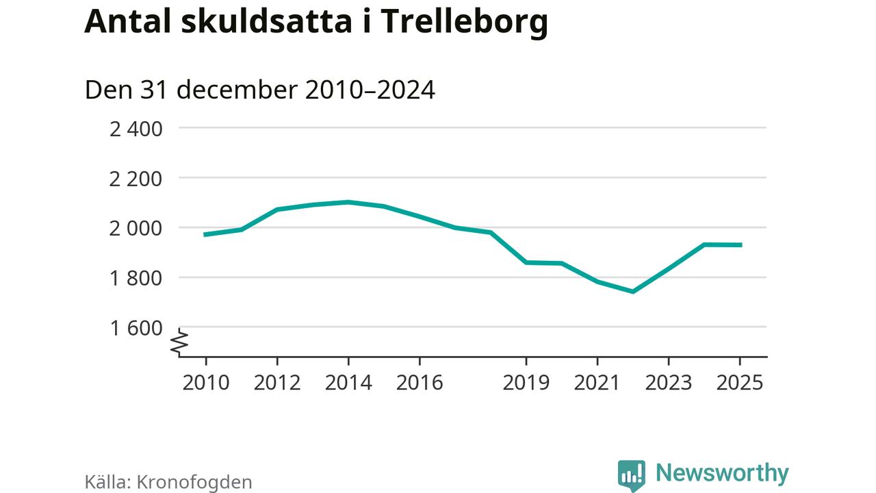 Vid årskiftet var 5 procent av alla Trelleborgs­bor över 18 år registrerade hos Kronofogden. Störst andel skuldsatta i länet finns i Perstorp (9 procent), medan den lägsta andelen finns i Lomma (1 procent).