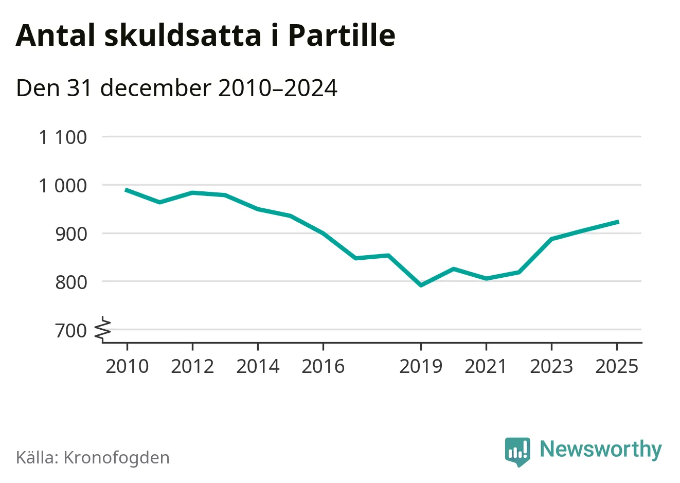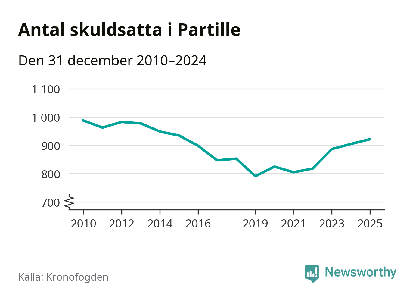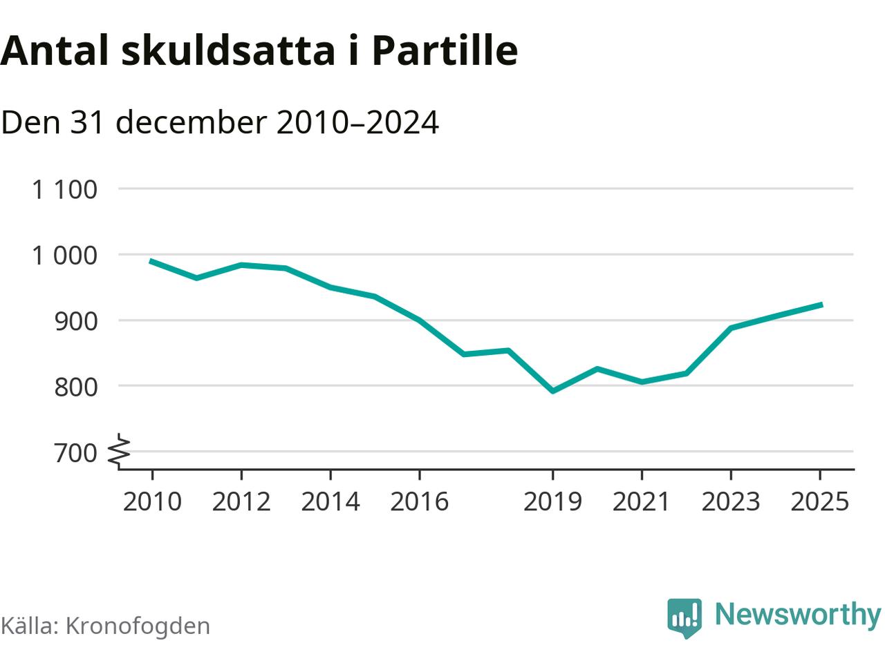Allt fler Partillebor hamnar hos Kronofogden. Vid årskiftet var 922 invånare i kommunen skyldiga totalt 324,7 miljoner kronor. Det är en ökning med 17 personer – eller 2 procent – jämfört med året innan. Det är det högsta antalet sedan 2015.