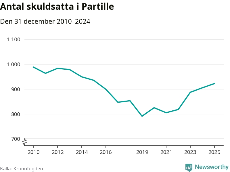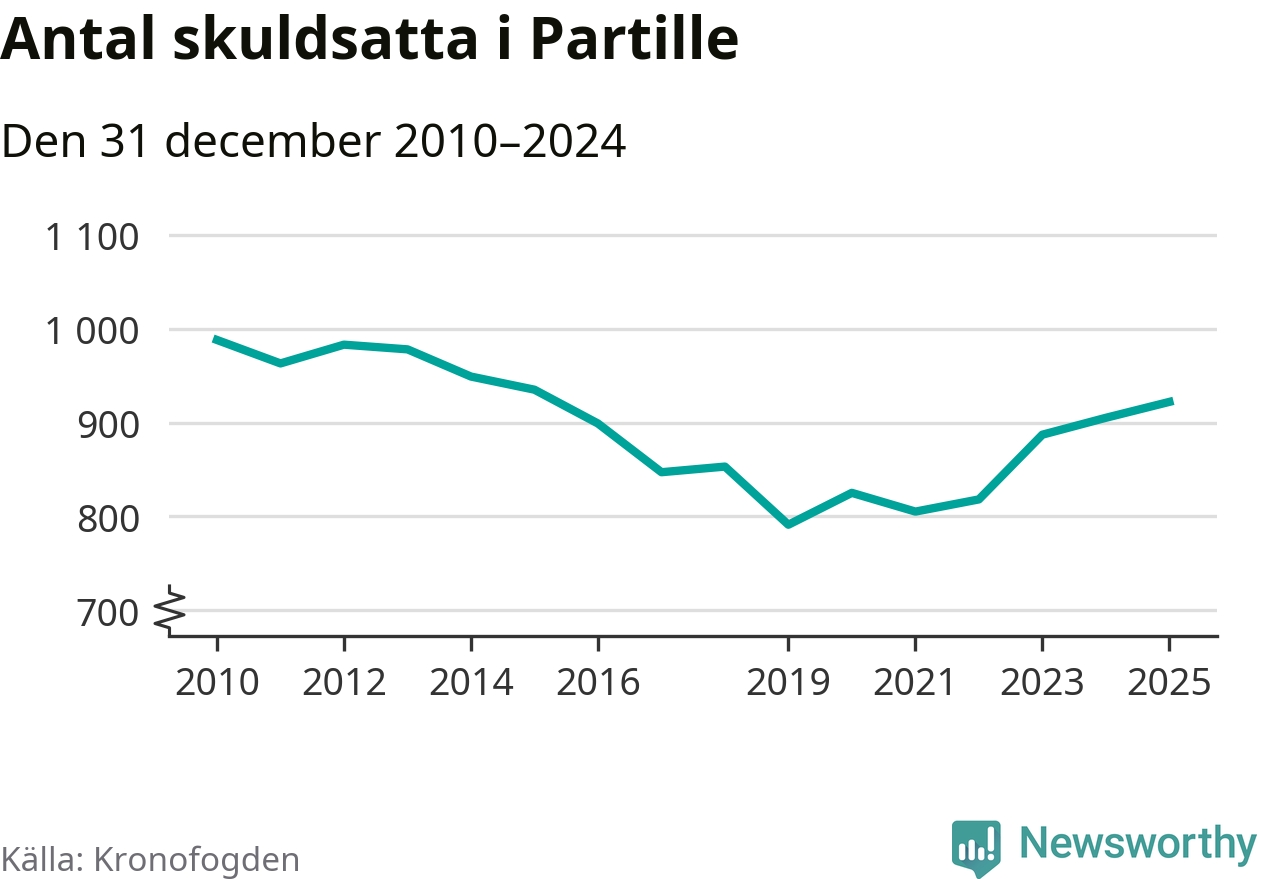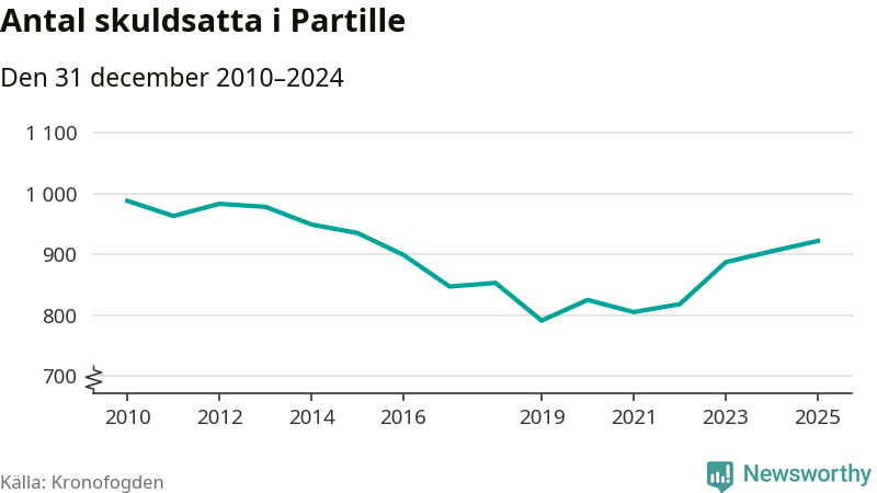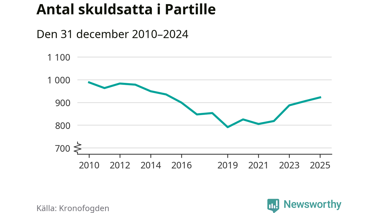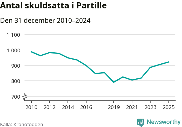 Allt fler Partillebor hamnar hos Kronofogden. Vid årskiftet var 922 invånare i kommunen skyldiga totalt 324,7 miljoner kronor. Det är en ökning med 17 personer – eller 2 procent – jämfört med året innan. Det är det högsta antalet sedan 2015.