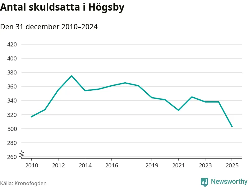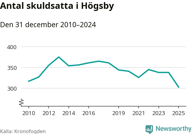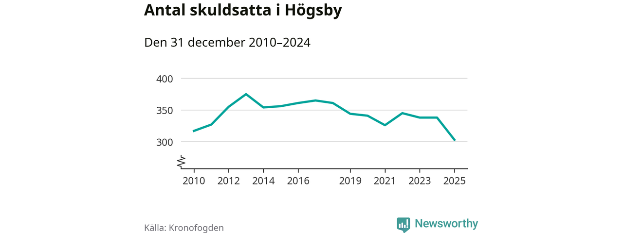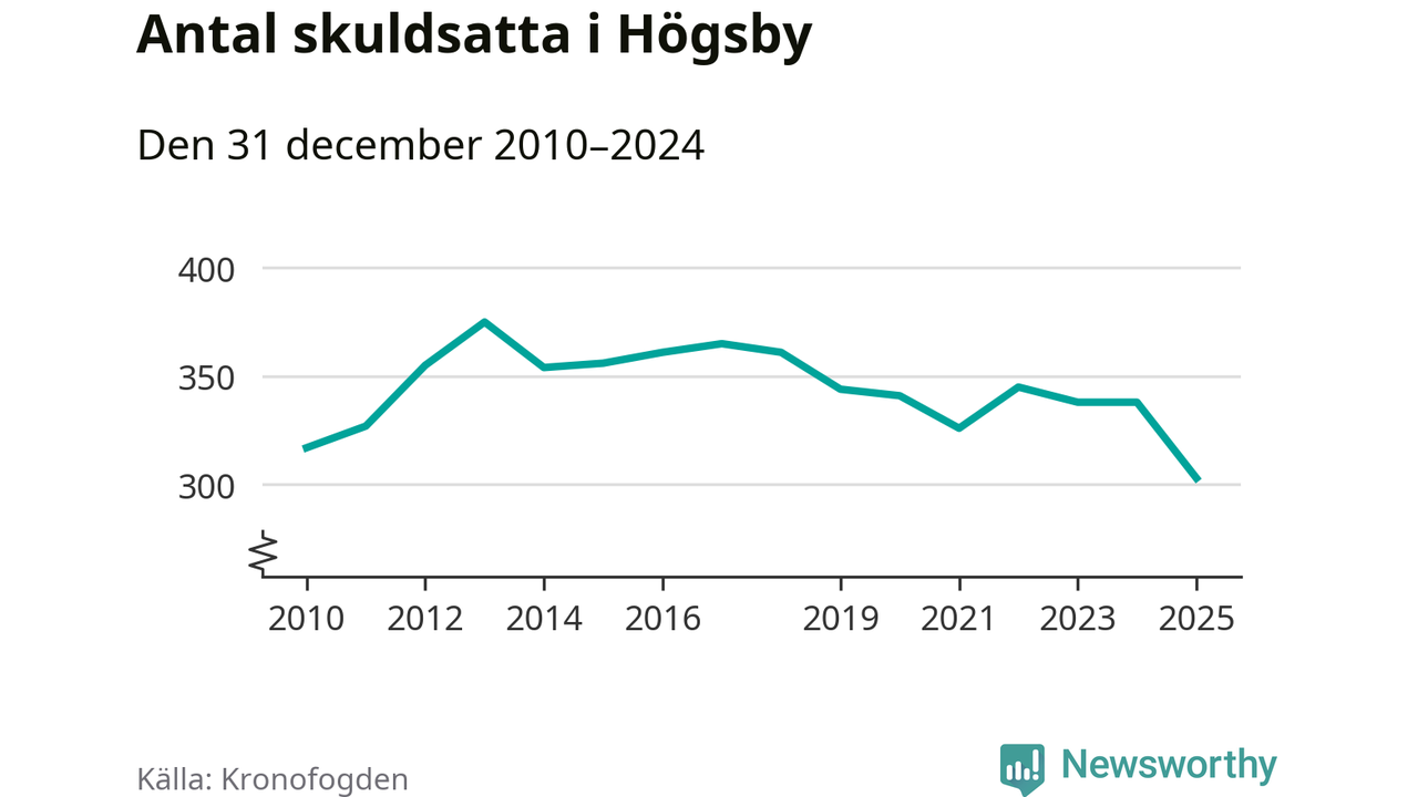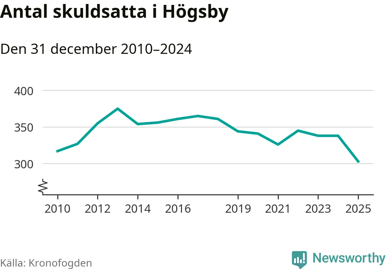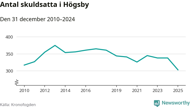 Inte sedan åtminstone 2010 har antalet registrerade hos Kronofogden i Högsby varit så lågt. Vid årskiftet var 303 invånare i kommunen skyldiga totalt 100,1 miljoner kronor. Det är en minskning med 35 personer – eller 10 procent – jämfört med året innan.