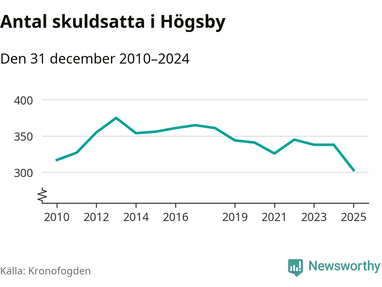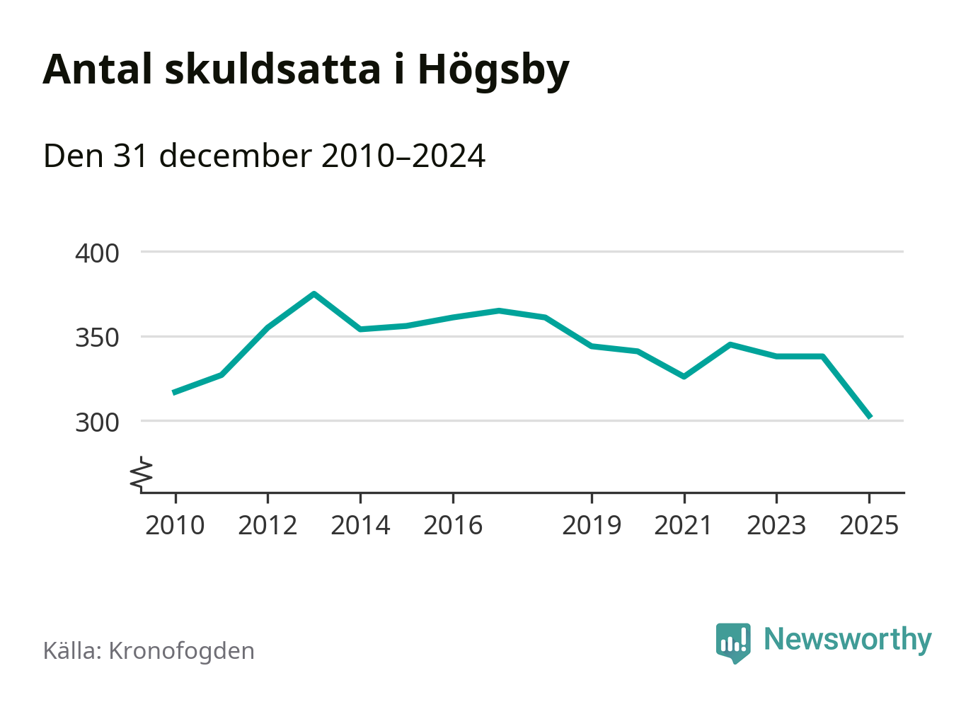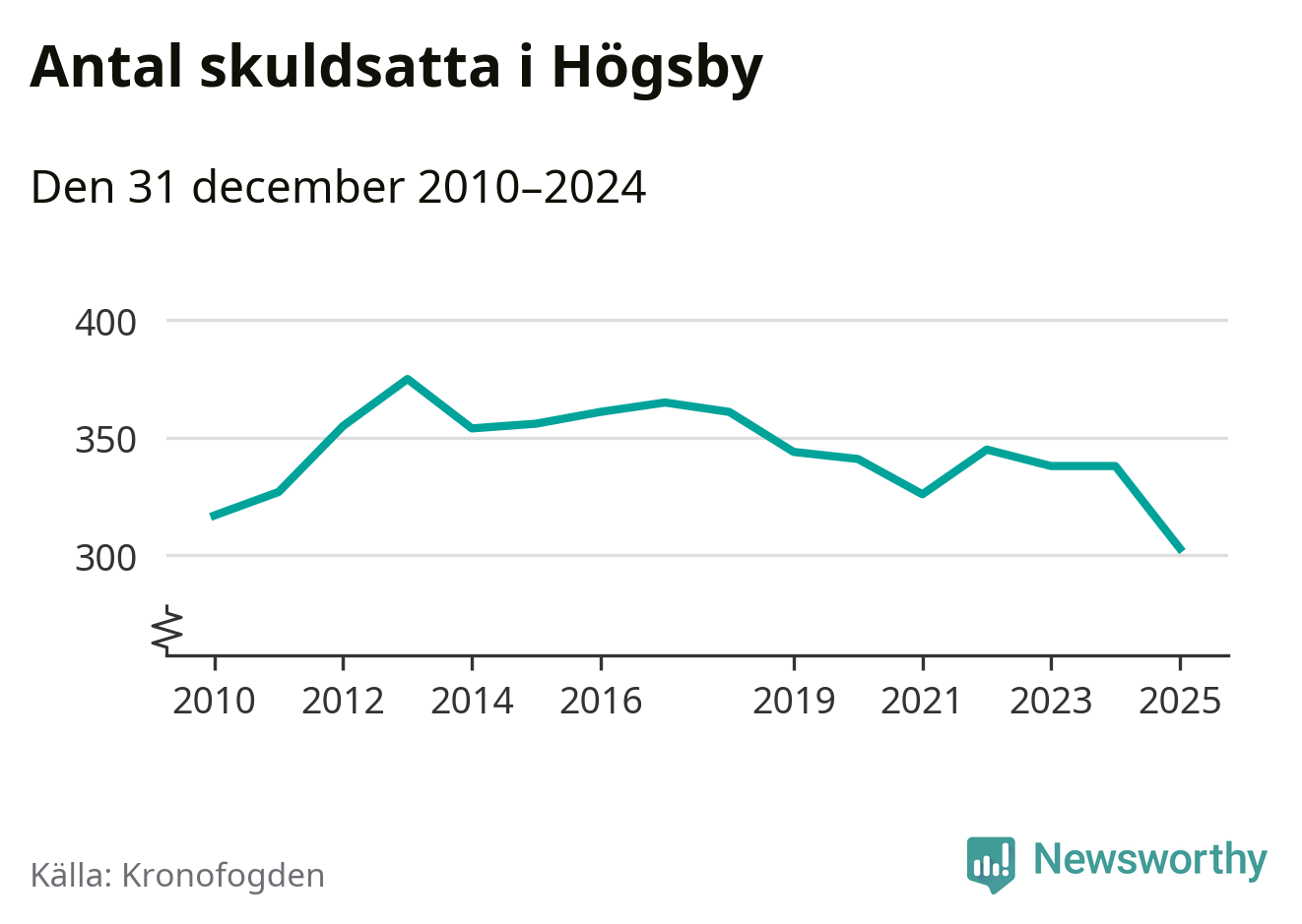 Inte sedan åtminstone 2010 har antalet registrerade hos Kronofogden i Högsby varit så lågt. Vid årskiftet var 303 invånare i kommunen skyldiga totalt 100,1 miljoner kronor. Det är en minskning med 35 personer – eller 10 procent – jämfört med året innan.