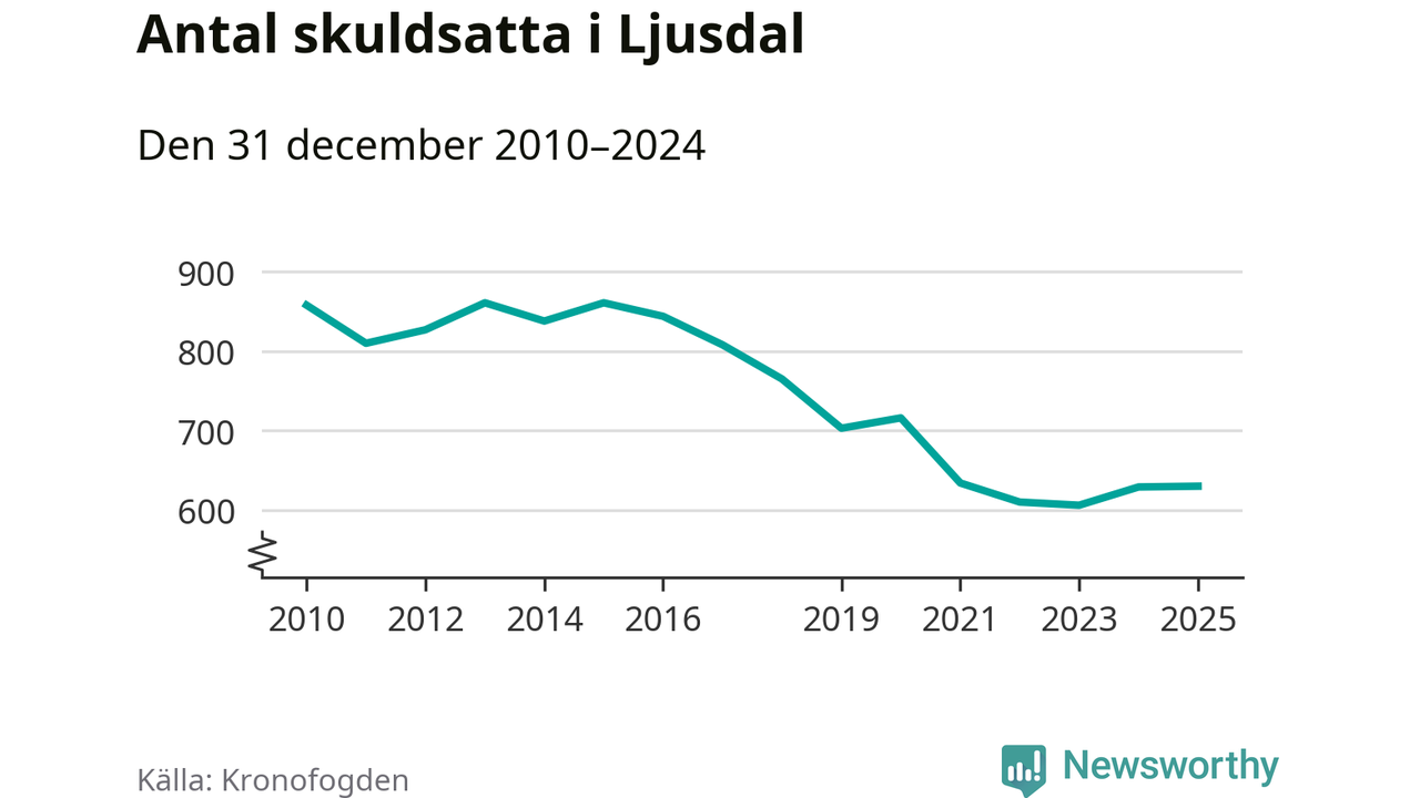 Vid årskiftet var 4 procent av alla Ljusdalsbor över 18 år registrerade hos Kronofogden. Det är den näst lägsta andelen av alla kommuner i Gävleborg. Störst andel skuldsatta i länet finns i Ockelbo (6 procent), medan den lägsta andelen finns i Ovanåker (4 procent).