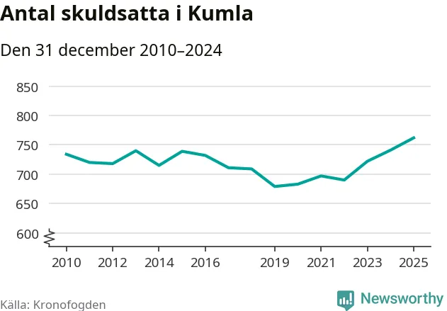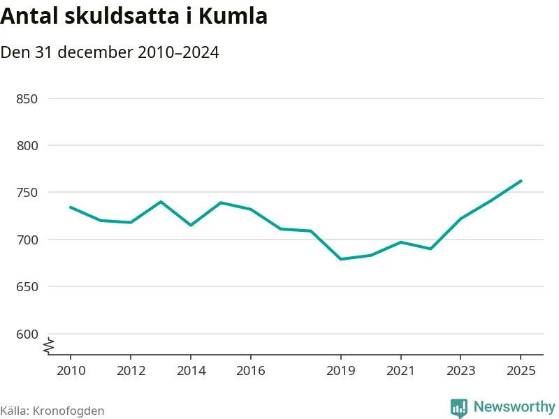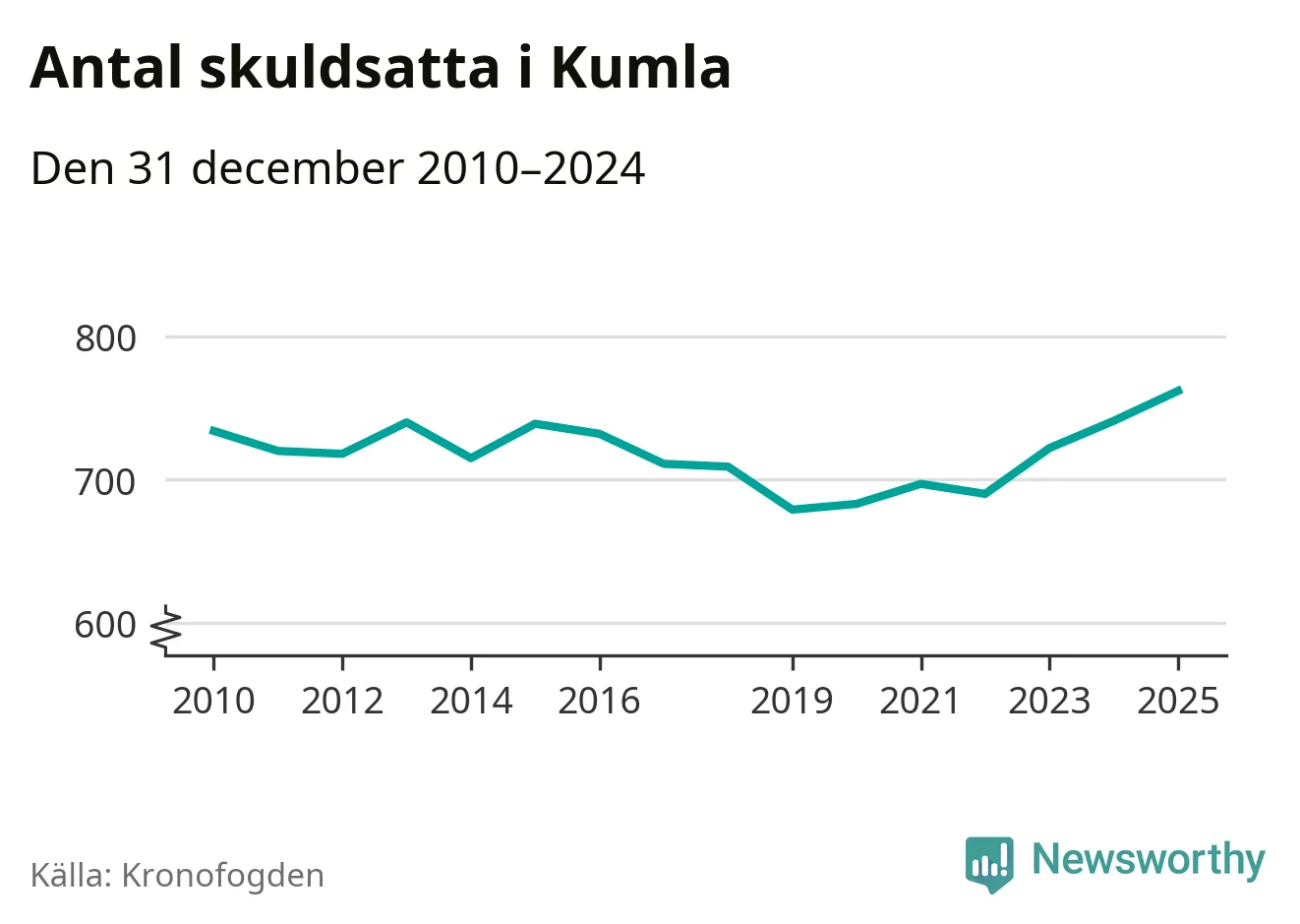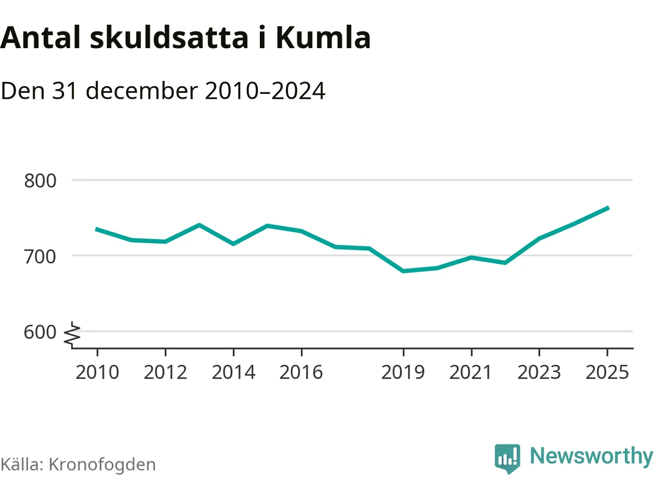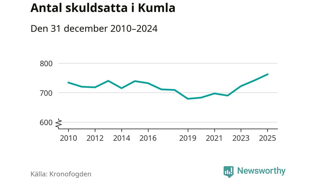 Inte sedan åtminstone 2010 har så många Kumlabor hamnat hos Kronofogden. Vid årskiftet var 762 invånare i kommunen skyldiga totalt 280,6 miljoner kronor. Det är en ökning med 21 personer – eller 3 procent – jämfört med året innan.