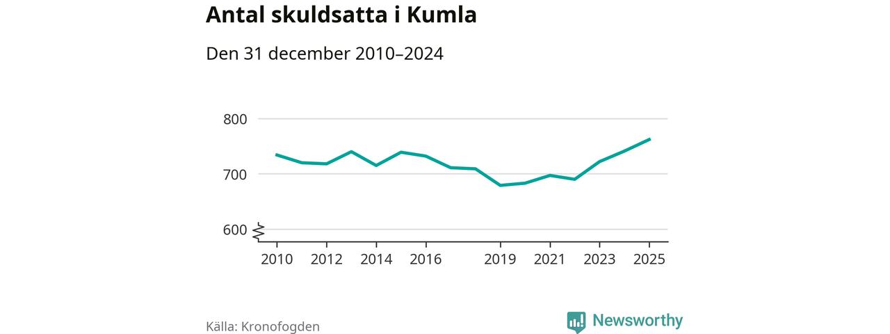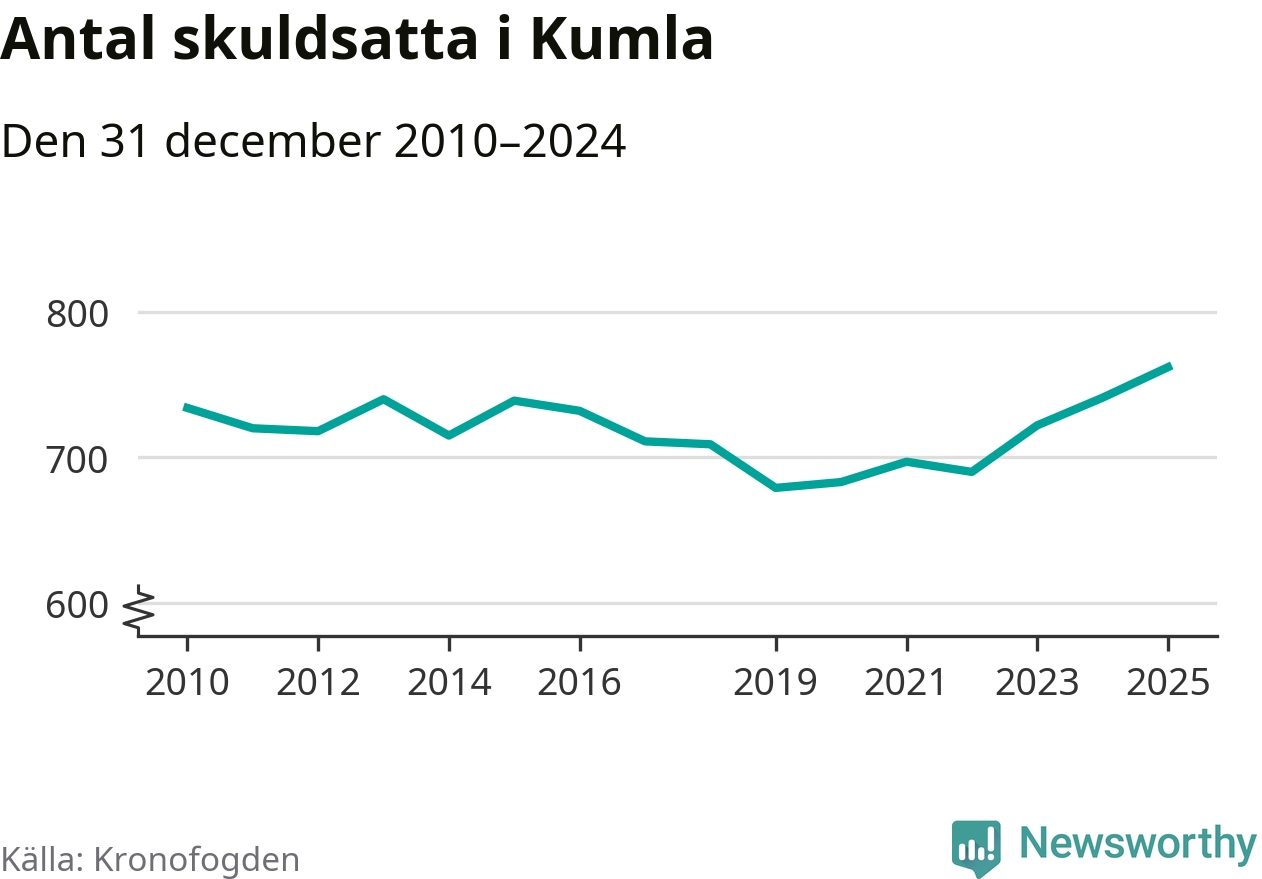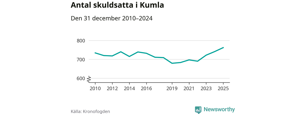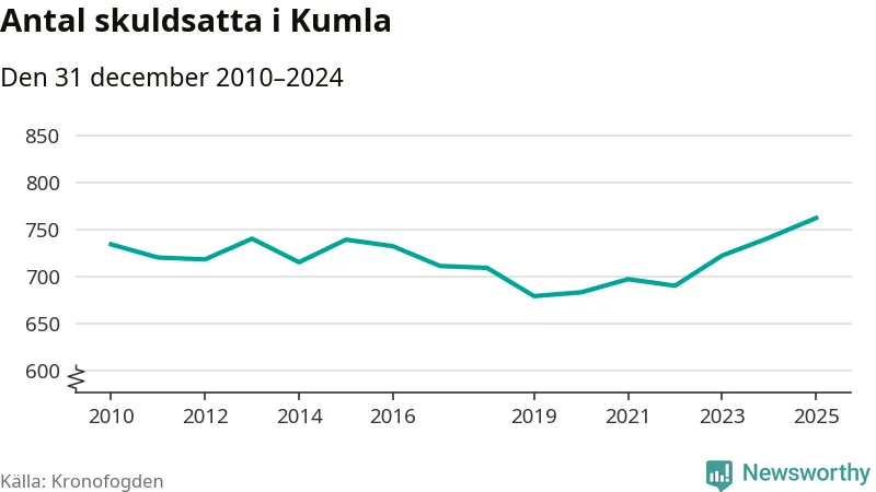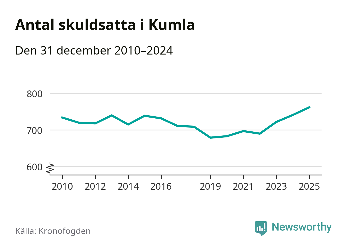 Inte sedan åtminstone 2010 har så många Kumlabor hamnat hos Kronofogden. Vid årskiftet var 762 invånare i kommunen skyldiga totalt 280,6 miljoner kronor. Det är en ökning med 21 personer – eller 3 procent – jämfört med året innan.