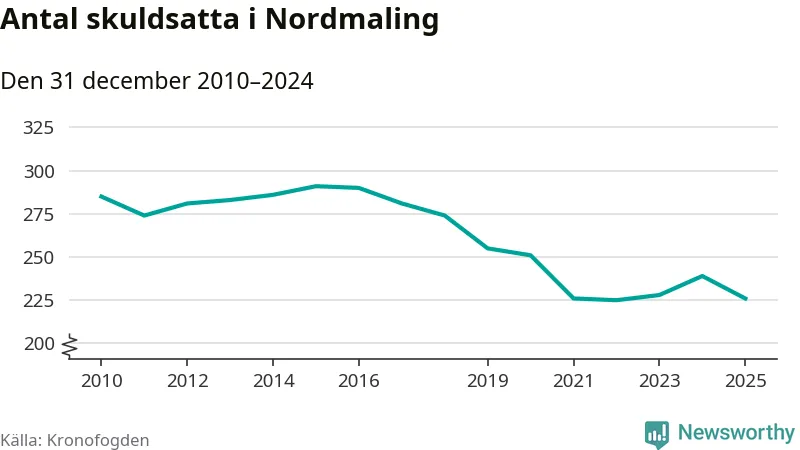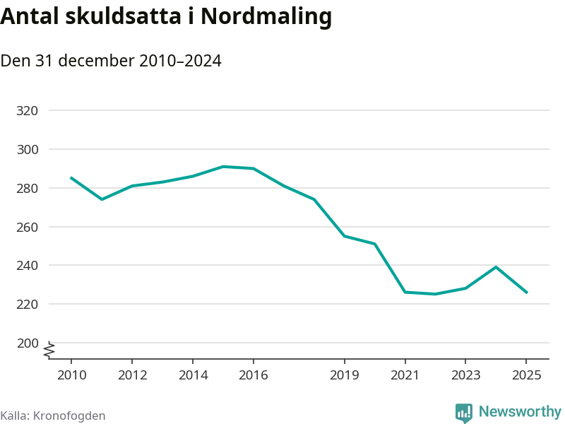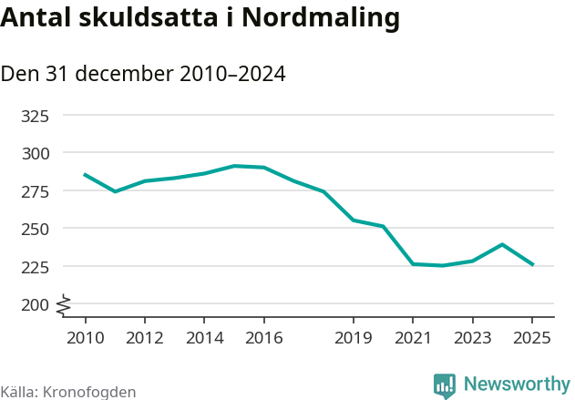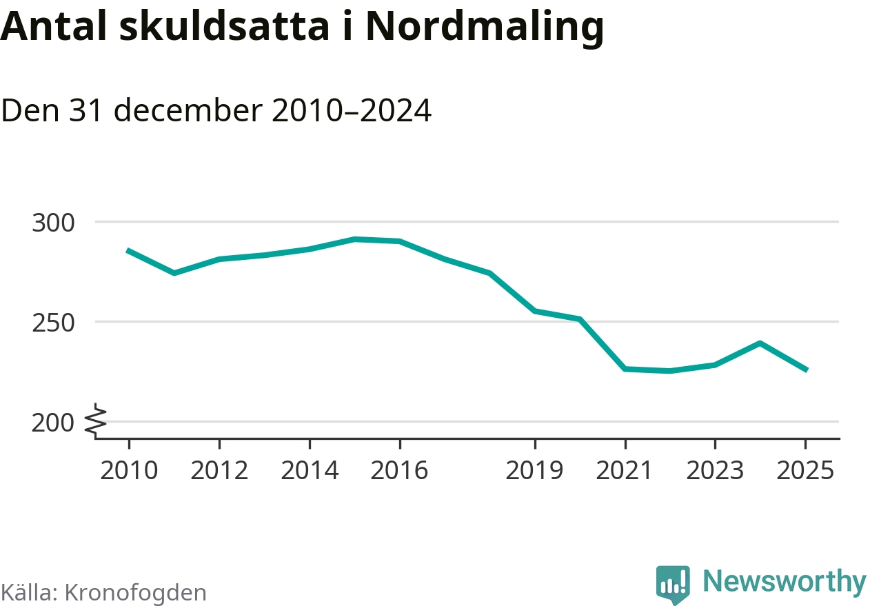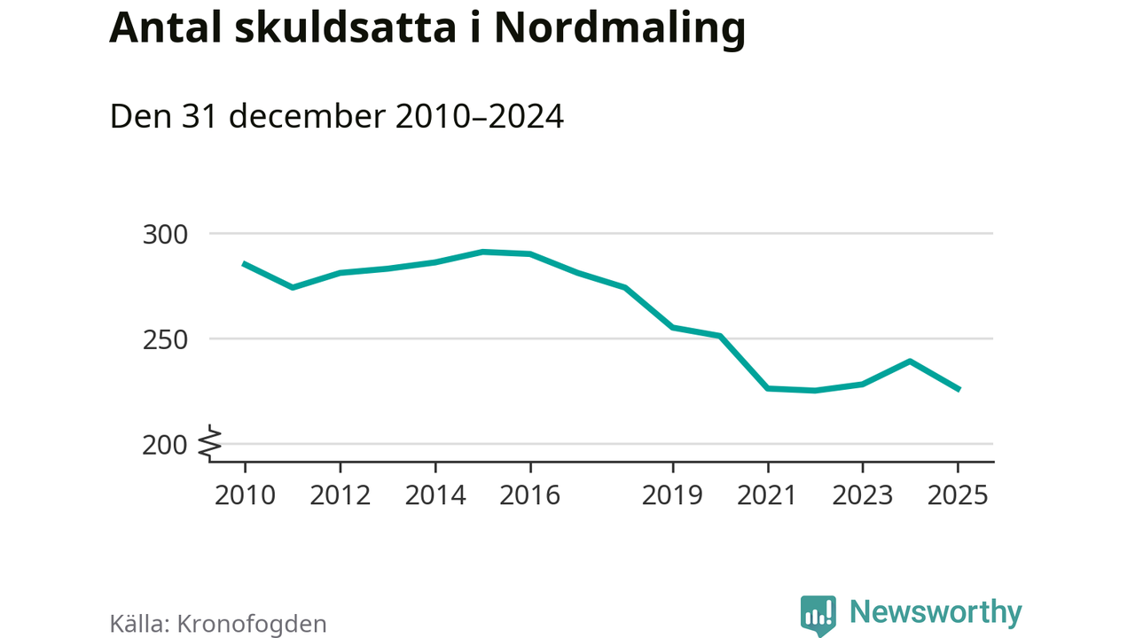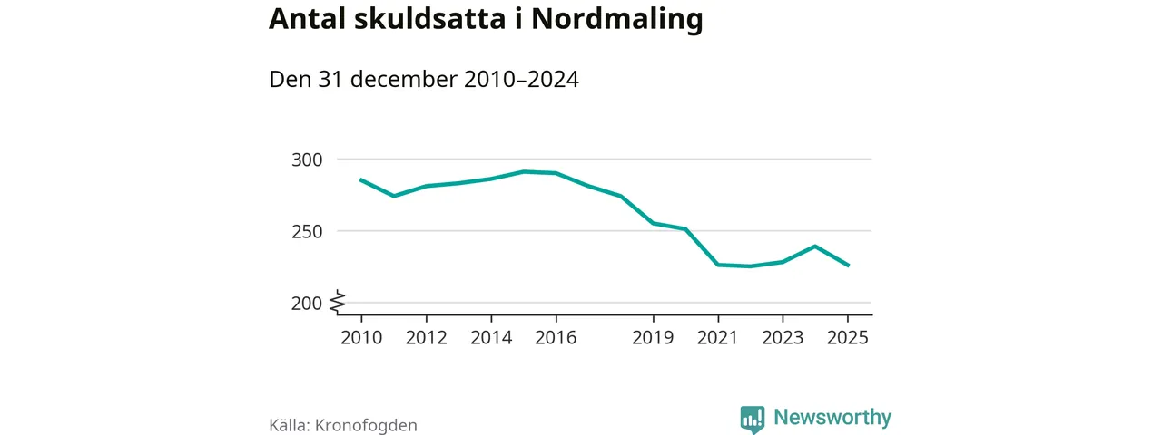 Antalet Nordmalings­bor hos Kronofogden minskade i fjol. Vid årskiftet var 226 invånare i kommunen skyldiga totalt 68,7 miljoner kronor. Det är en minskning med 13 personer – eller 5 procent – jämfört med året innan.