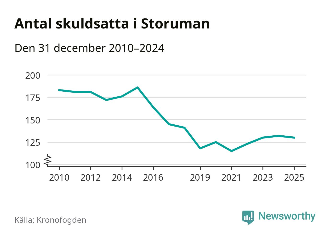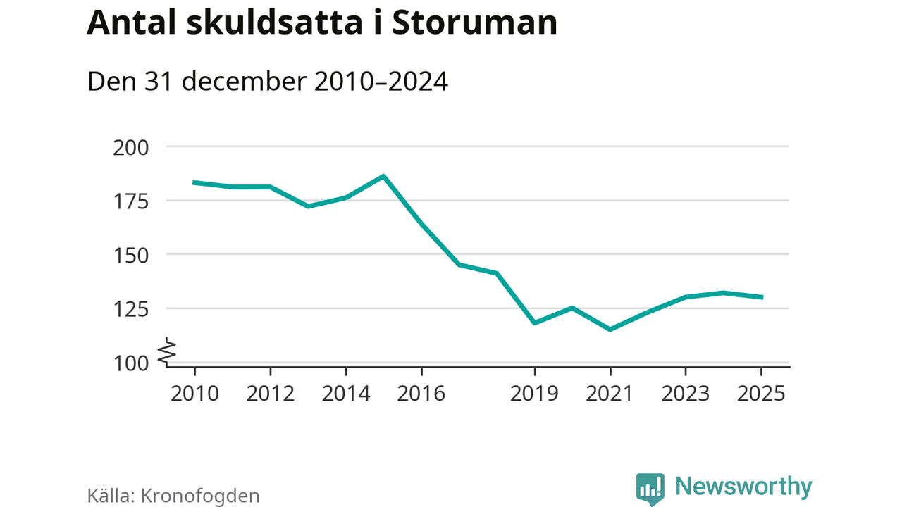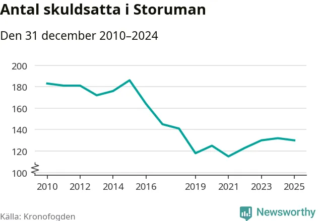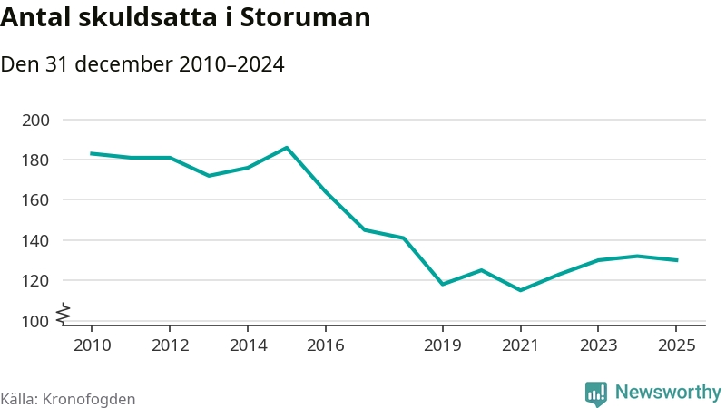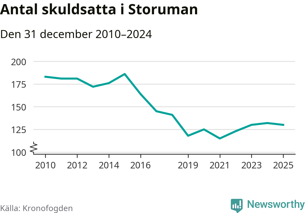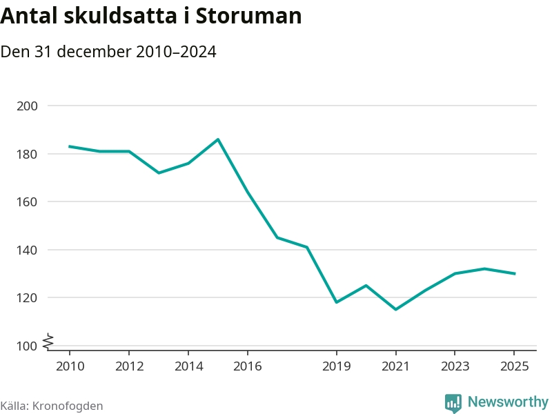 Antalet Storumanbor hos Kronofogden minskade i fjol. Vid årskiftet var 130 invånare i kommunen skyldiga totalt 34,2 miljoner kronor. Det är en minskning med två personer jämfört med året innan.