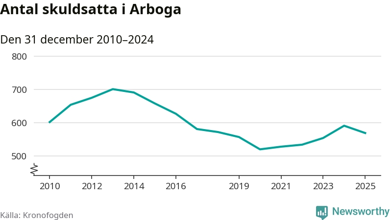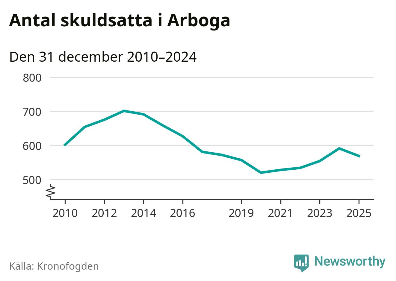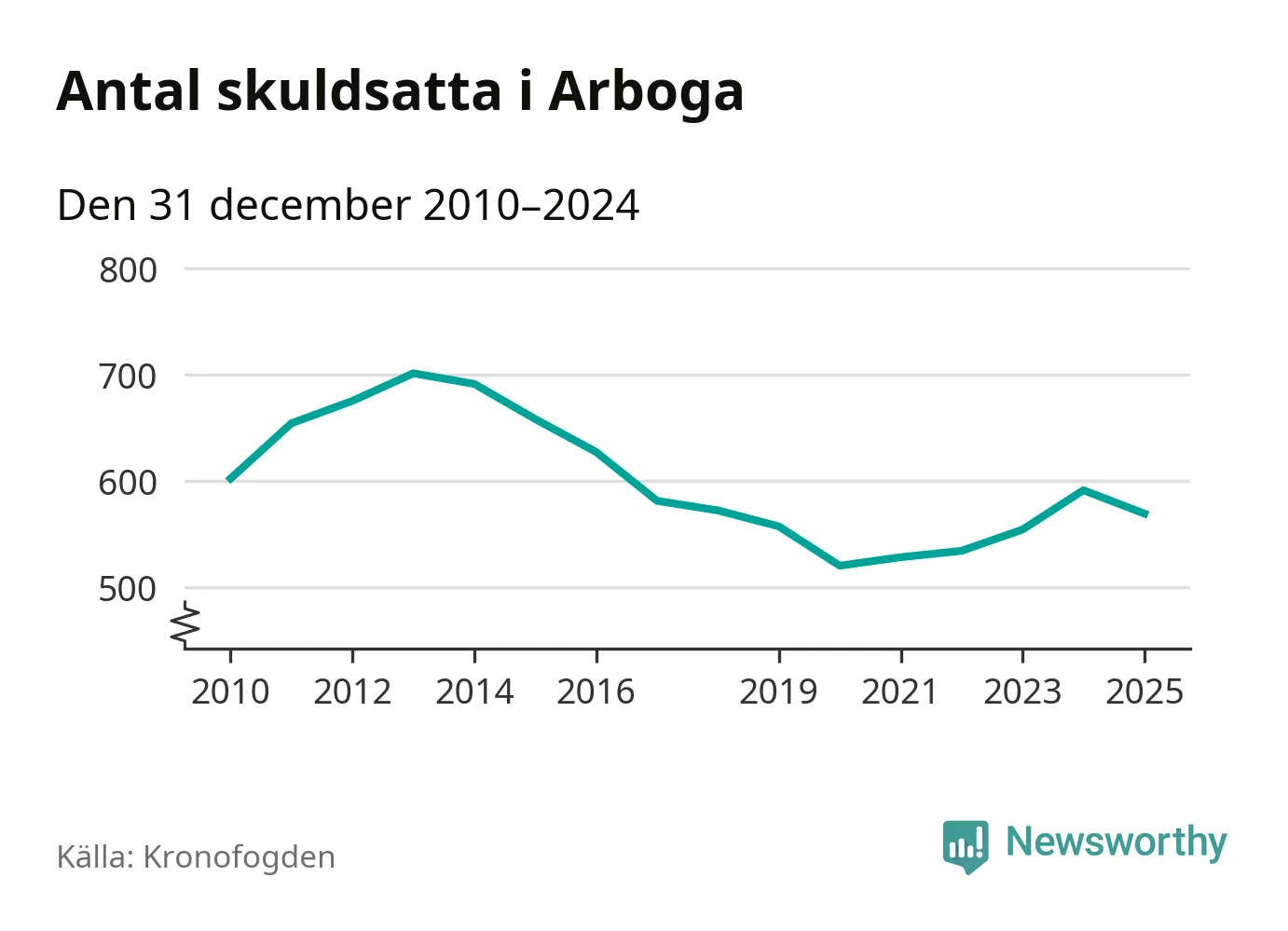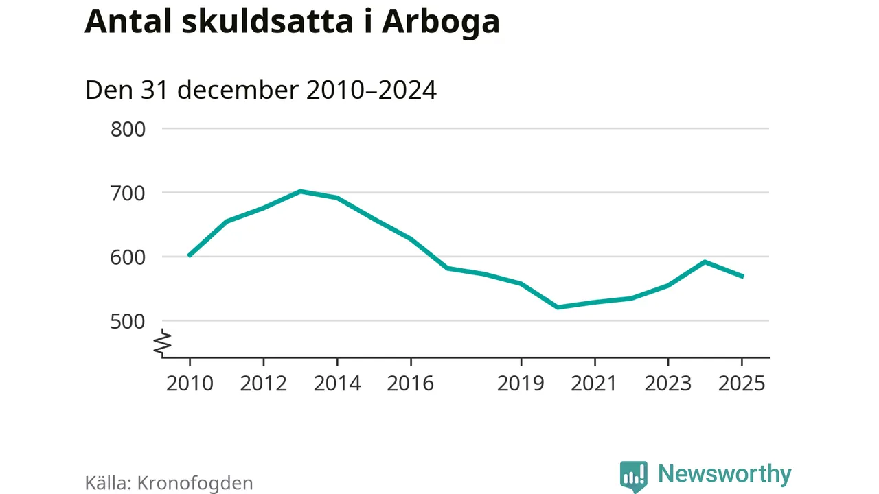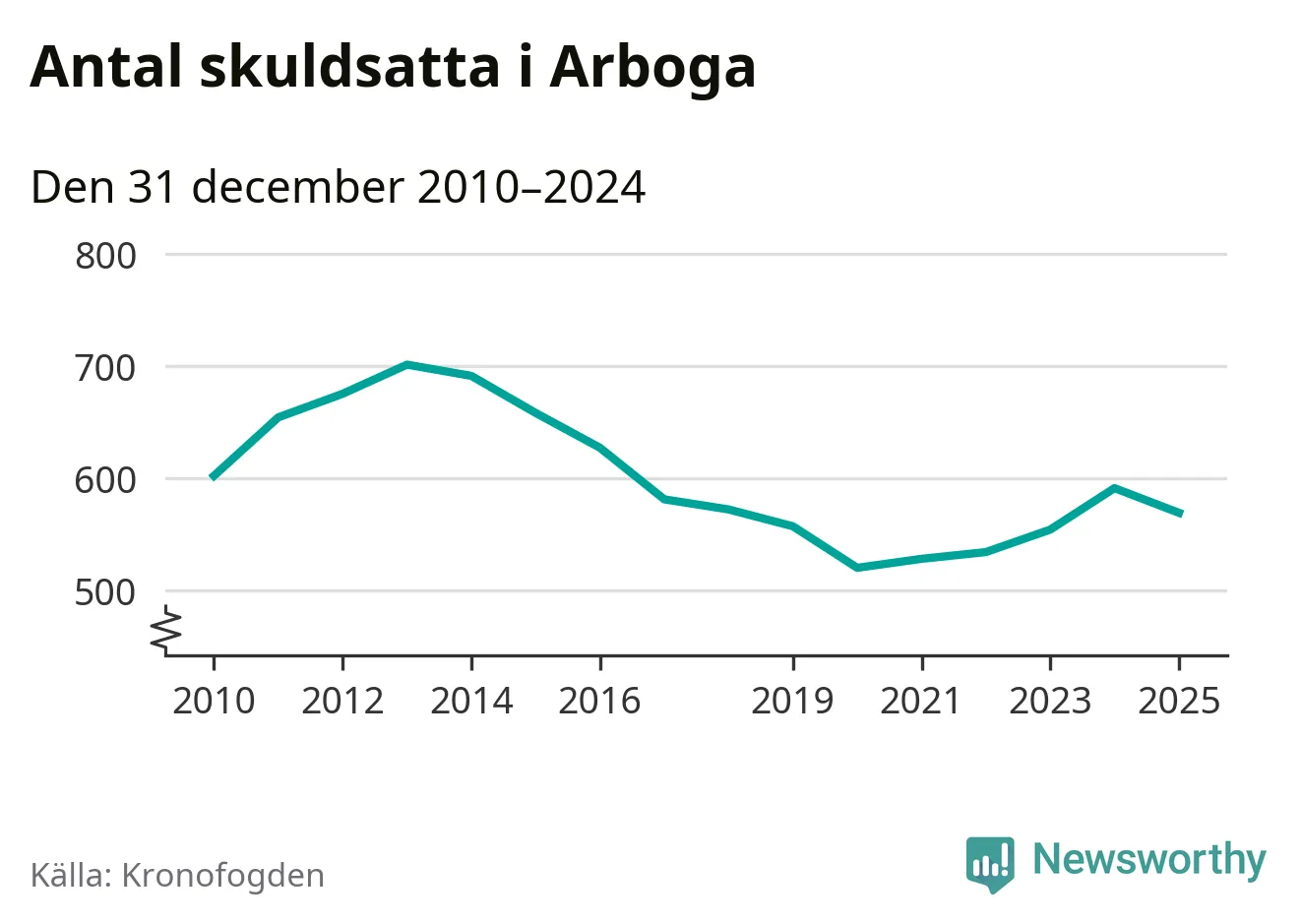Antalet Arbogabor hos Kronofogden minskade i fjol. Vid årskiftet var 569 invånare i kommunen skyldiga totalt 126,8 miljoner kronor. Det är en minskning med 22 personer – eller 4 procent – jämfört med året innan.