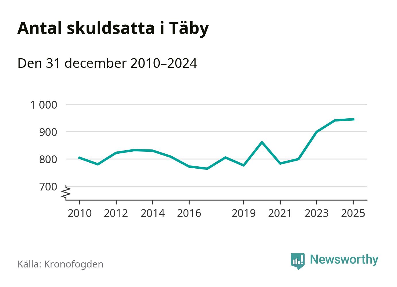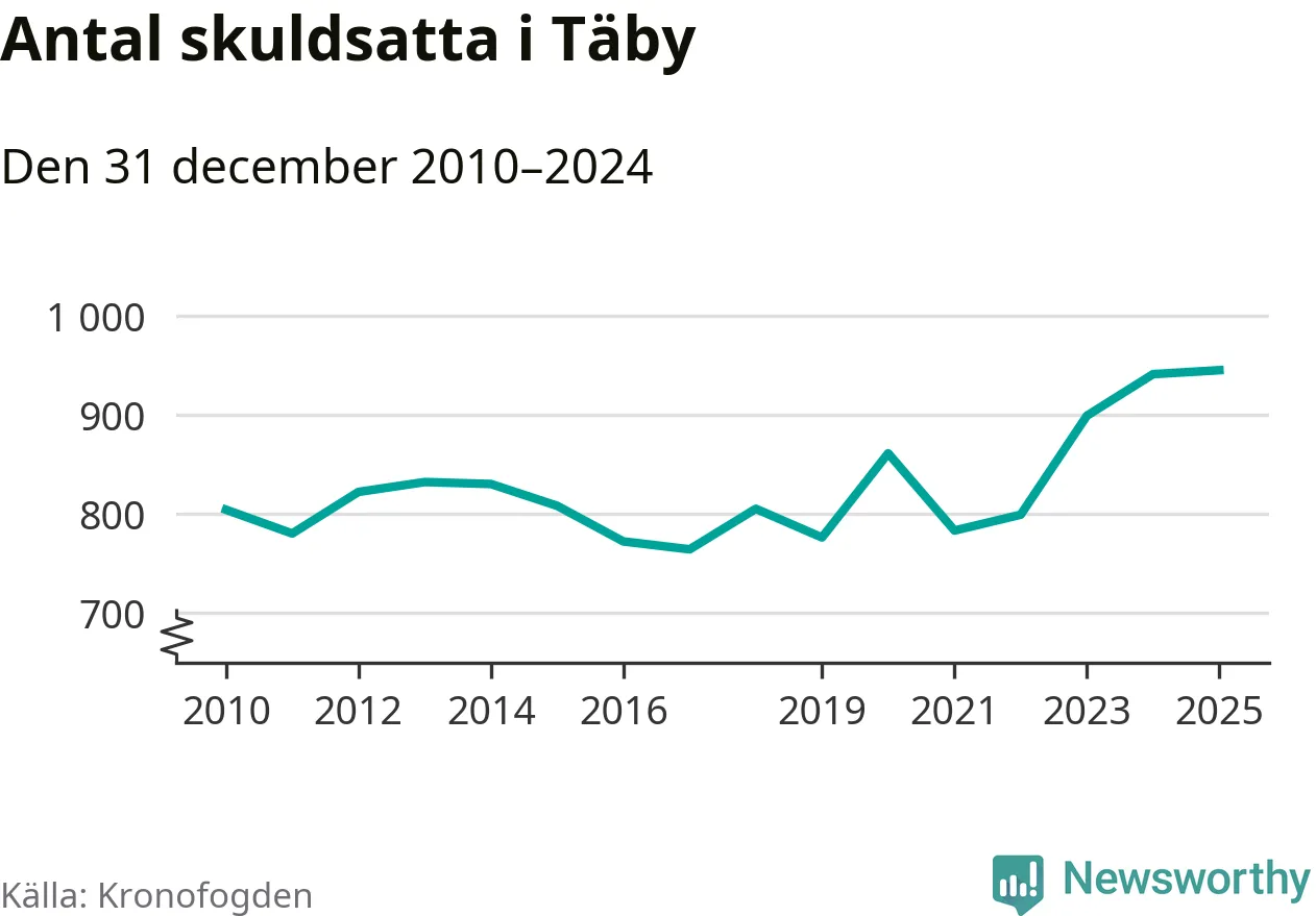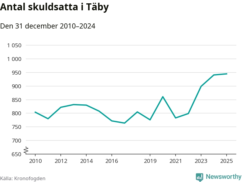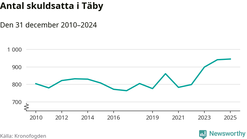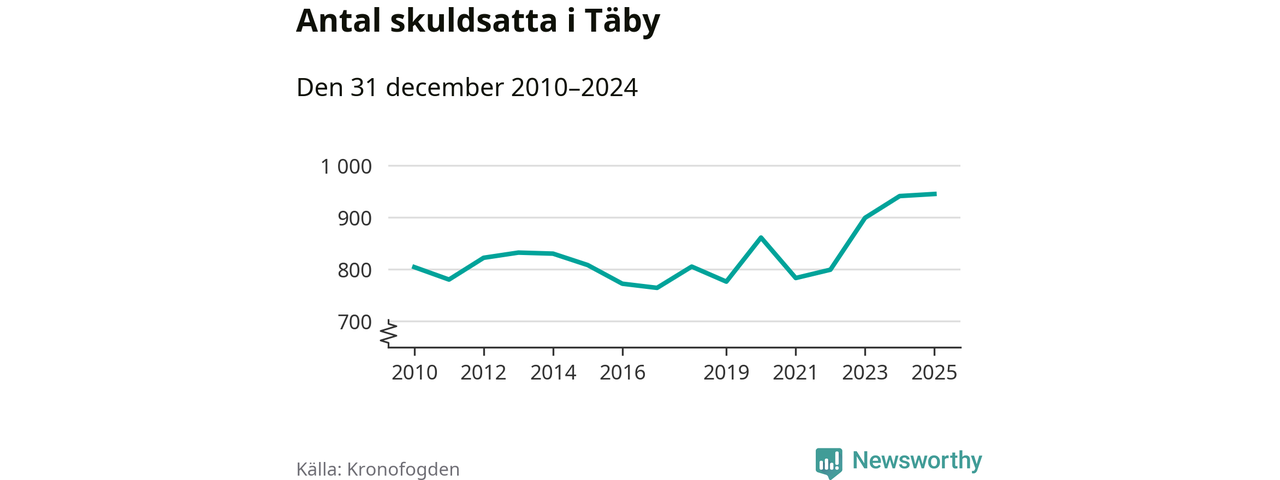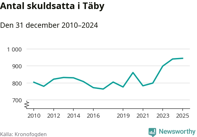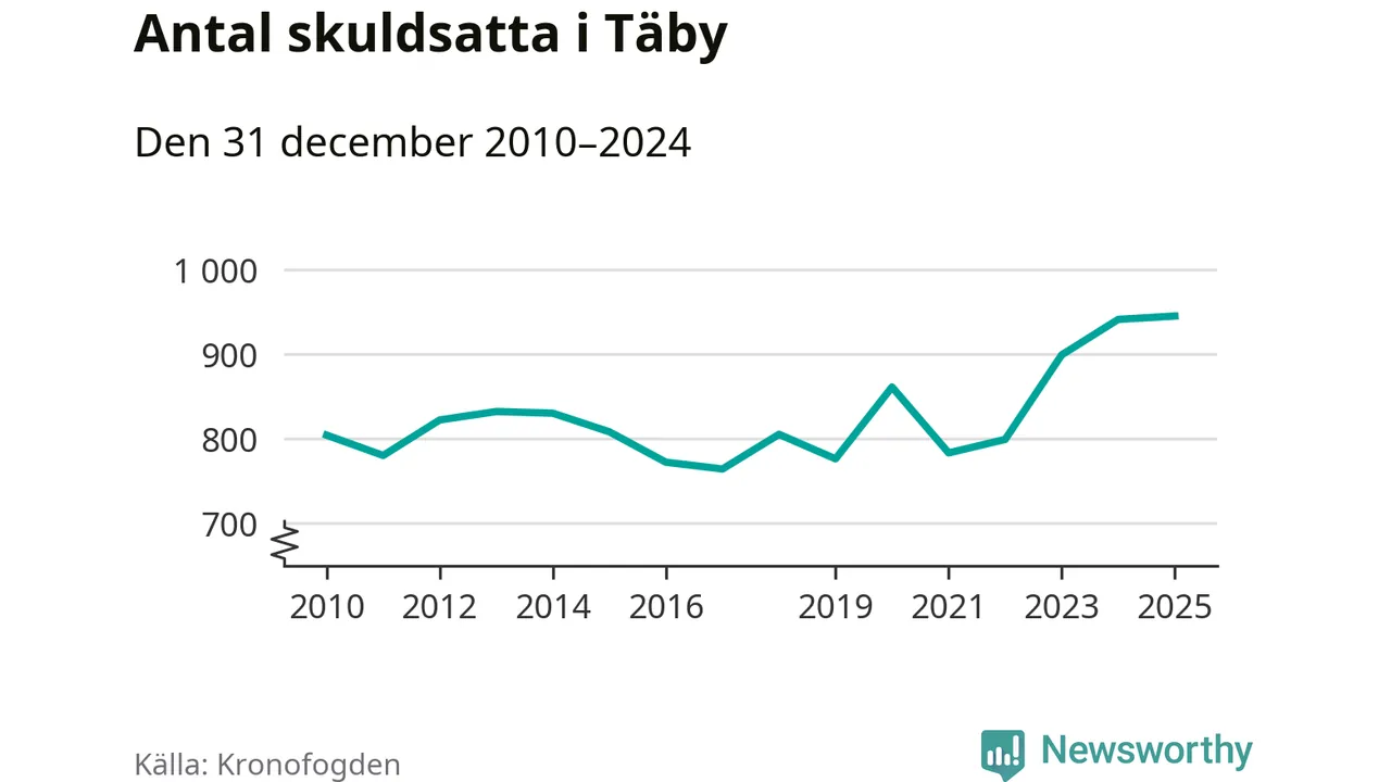 Inte sedan åtminstone 2010 har så många Täby­bor hamnat hos Kronofogden. Vid årskiftet var 945 invånare i kommunen skyldiga totalt 498,9 miljoner kronor.