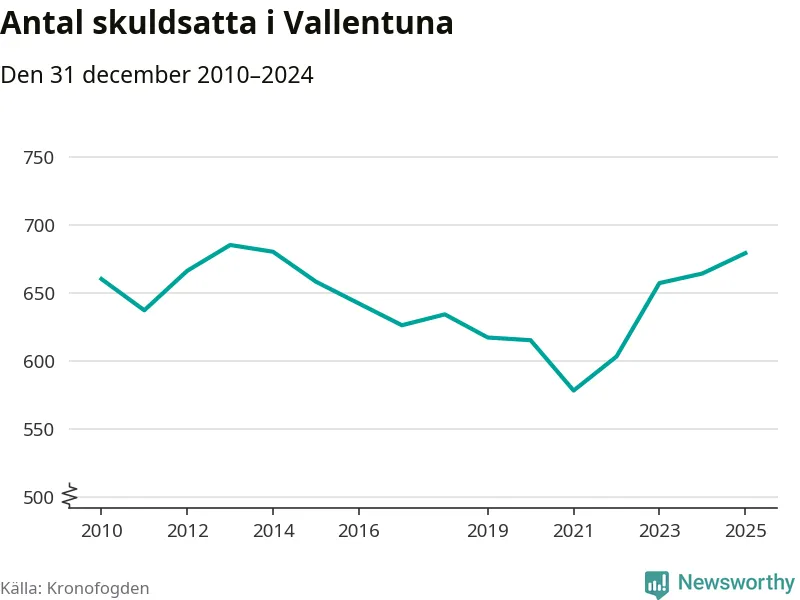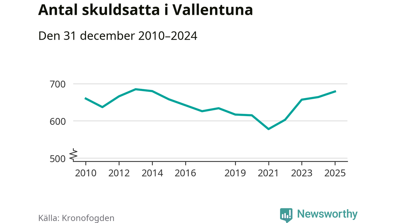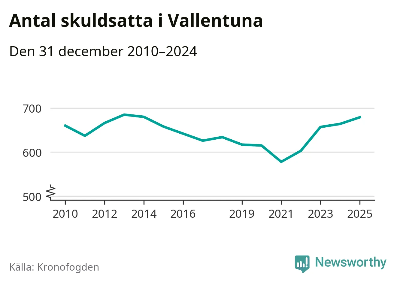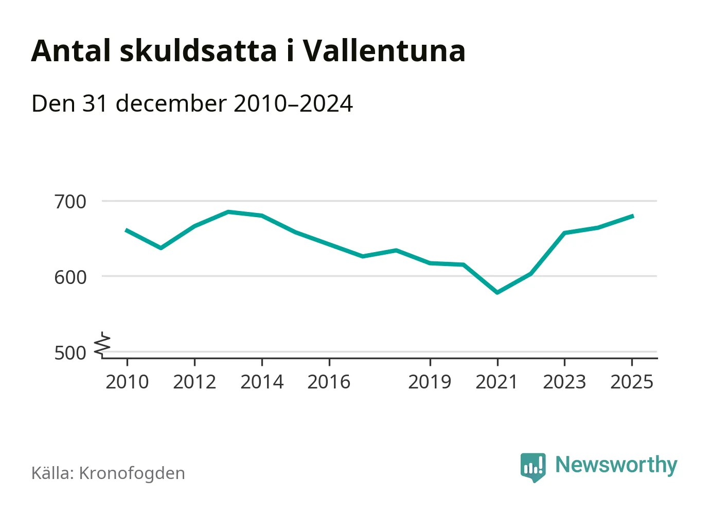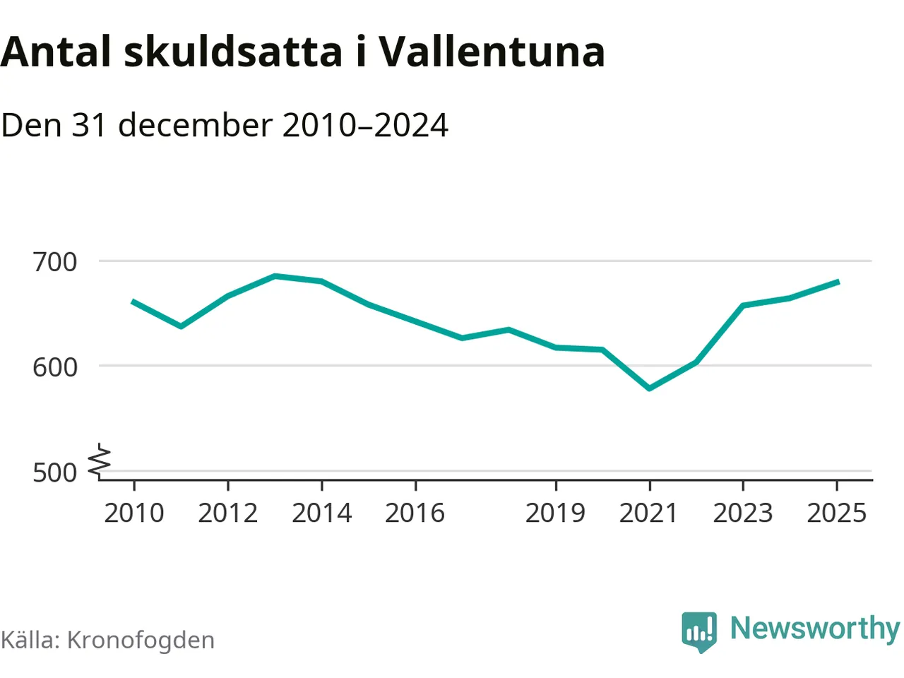 Allt fler Vallentunabor hamnar hos Kronofogden. Vid årskiftet var 679 invånare i kommunen skyldiga totalt 234,9 miljoner kronor. Det är en ökning med 15 personer – eller 2 procent – jämfört med året innan. Det är det högsta antalet sedan 2014.