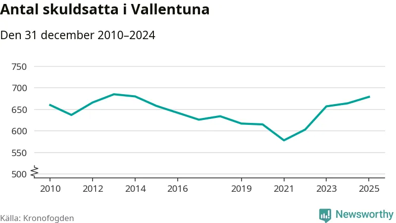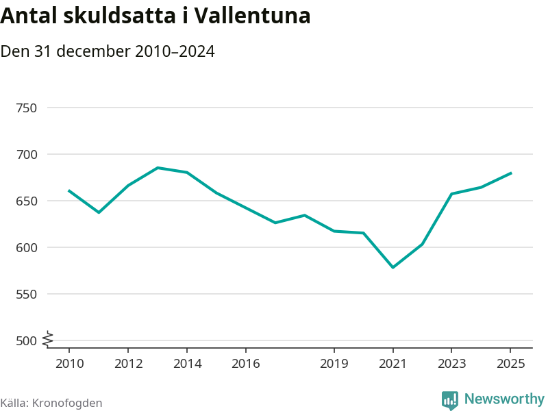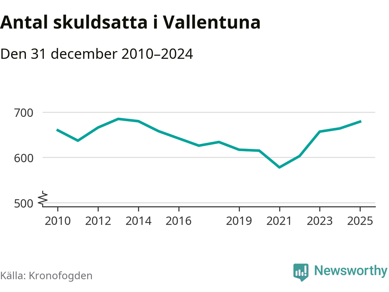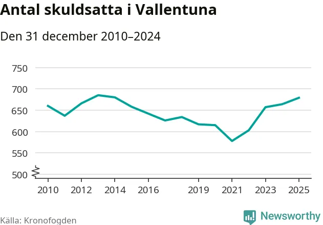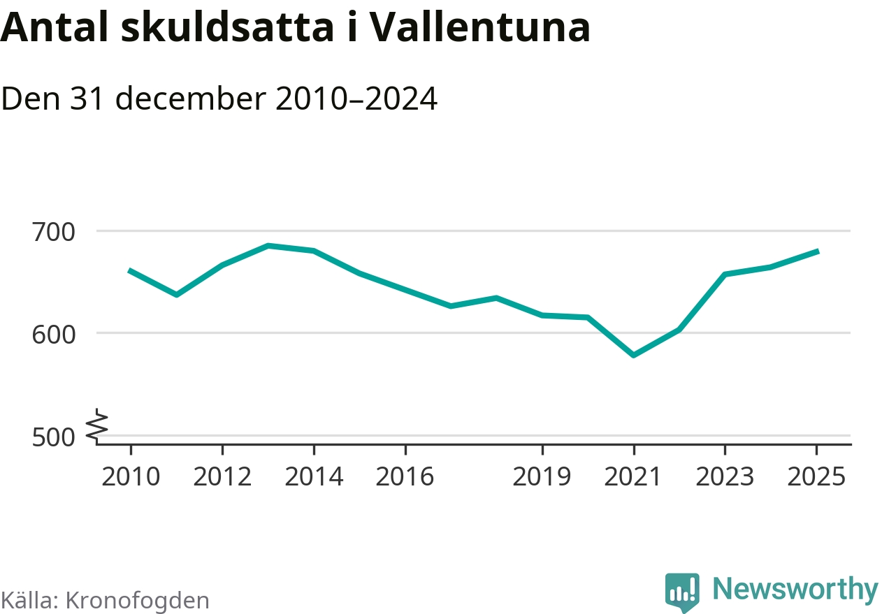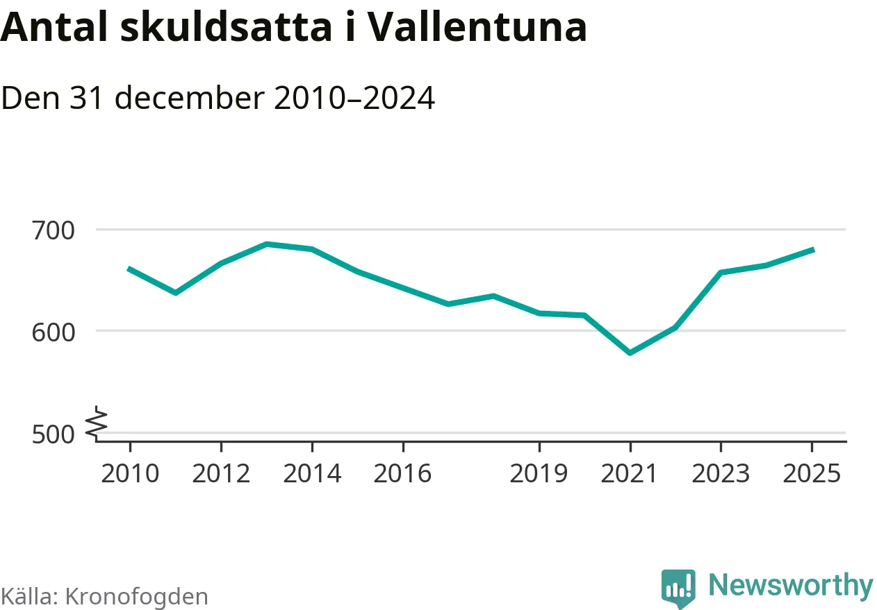 Allt fler Vallentunabor hamnar hos Kronofogden. Vid årskiftet var 679 invånare i kommunen skyldiga totalt 234,9 miljoner kronor. Det är en ökning med 15 personer – eller 2 procent – jämfört med året innan. Det är det högsta antalet sedan 2014.