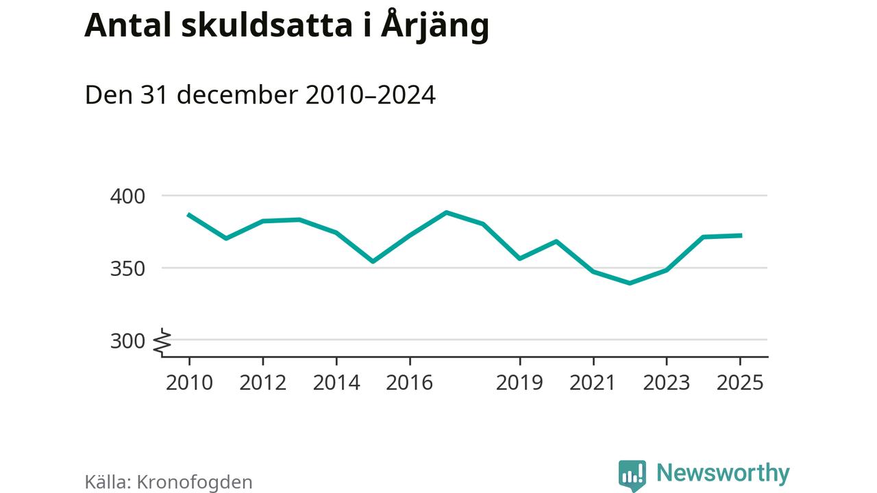 Vid årskiftet var 5 procent av alla Årjängs­bor över 18 år registrerade hos Kronofogden. Störst andel skuldsatta i länet finns i Filipstad (8 procent), medan den lägsta andelen finns på Hammarö (2 procent).