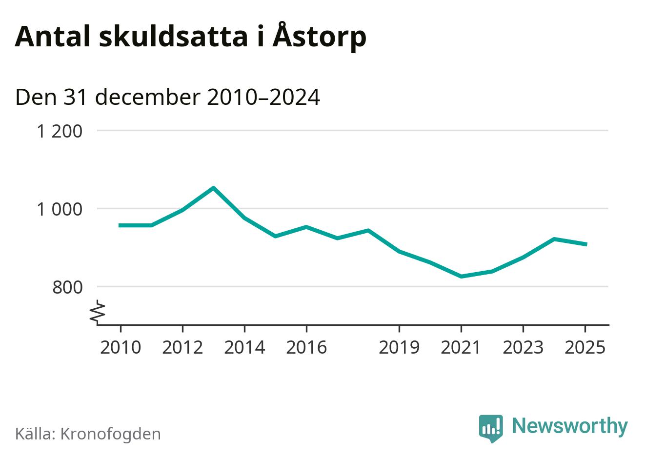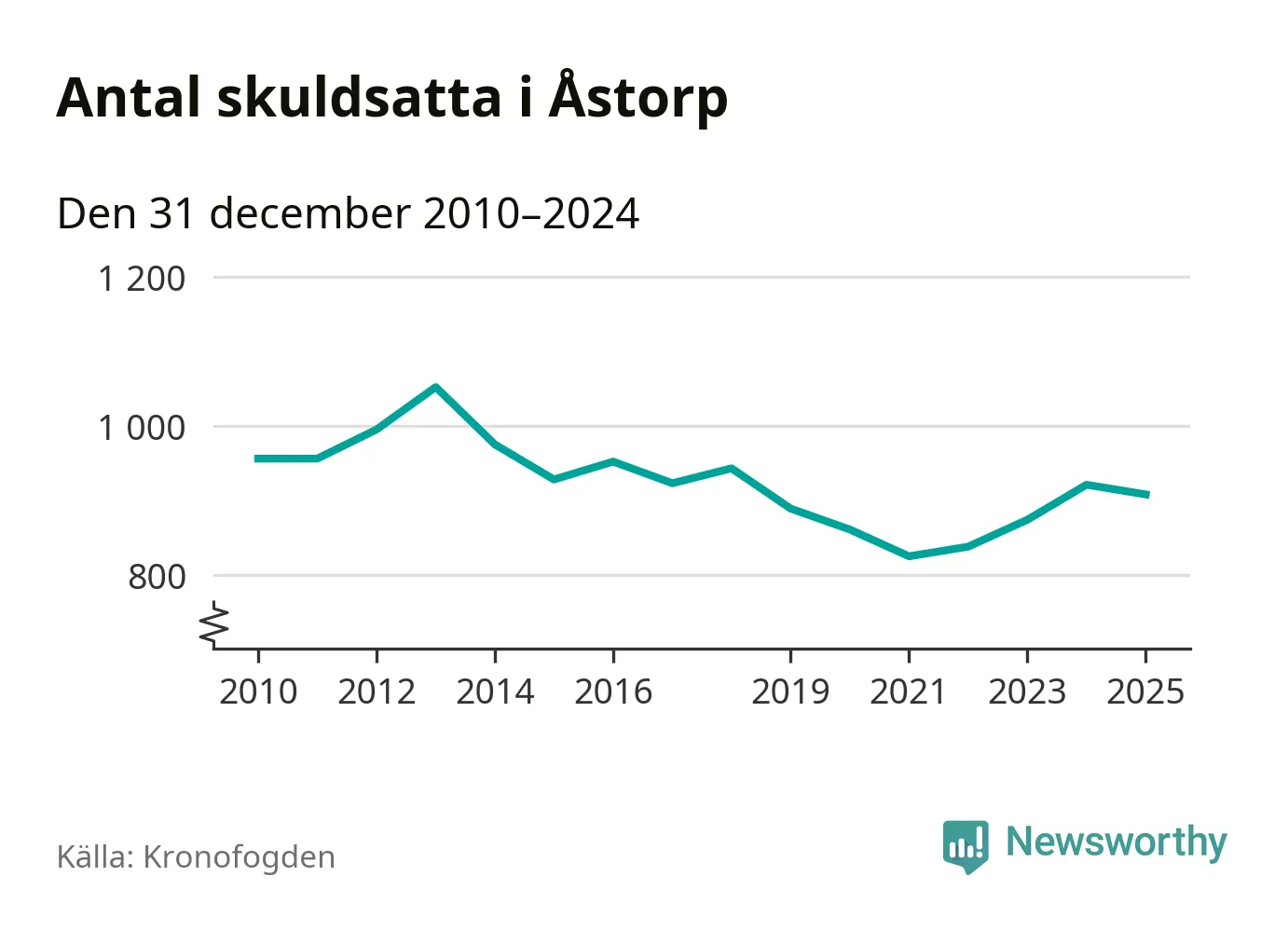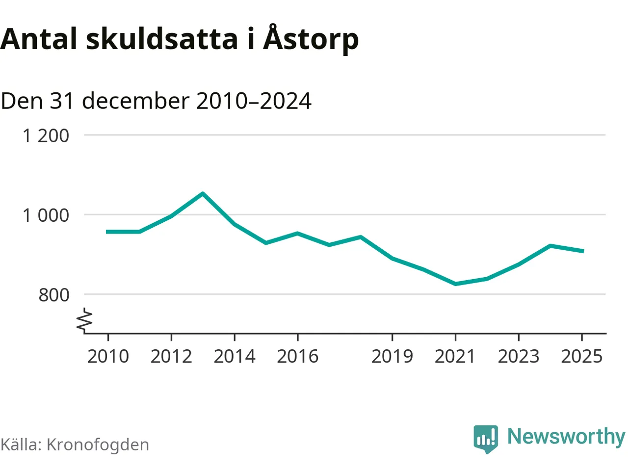 Antalet Åstorpsbor hos Kronofogden minskade i fjol. Vid årskiftet var 908 invånare i kommunen skyldiga totalt 321,7 miljoner kronor. Det är en minskning med 13 personer – eller 1 procent – jämfört med året innan.