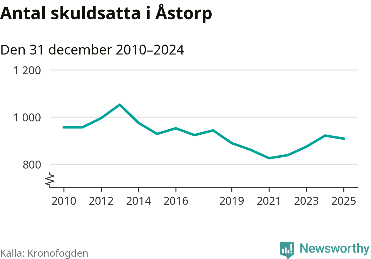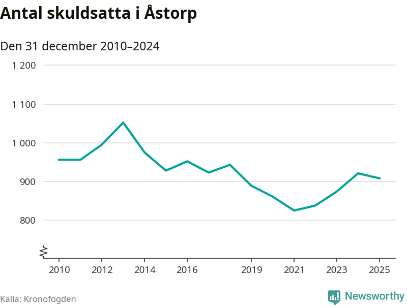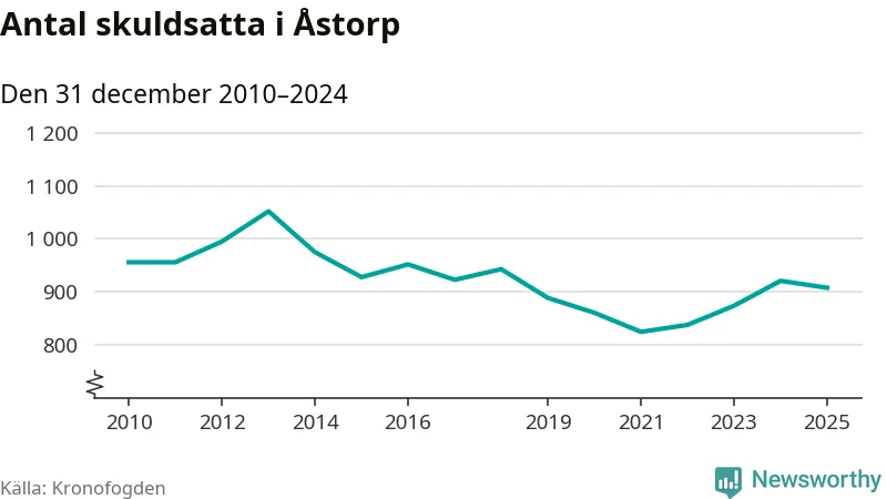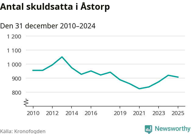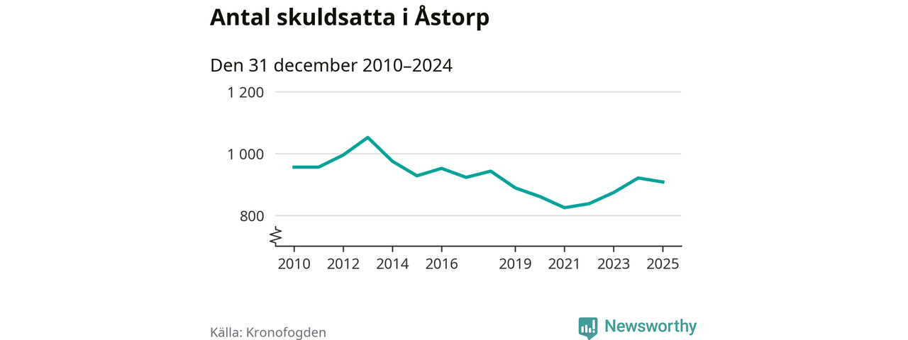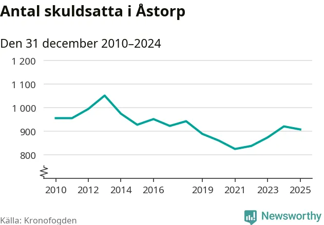 Antalet Åstorpsbor hos Kronofogden minskade i fjol. Vid årskiftet var 908 invånare i kommunen skyldiga totalt 321,7 miljoner kronor. Det är en minskning med 13 personer – eller 1 procent – jämfört med året innan.
