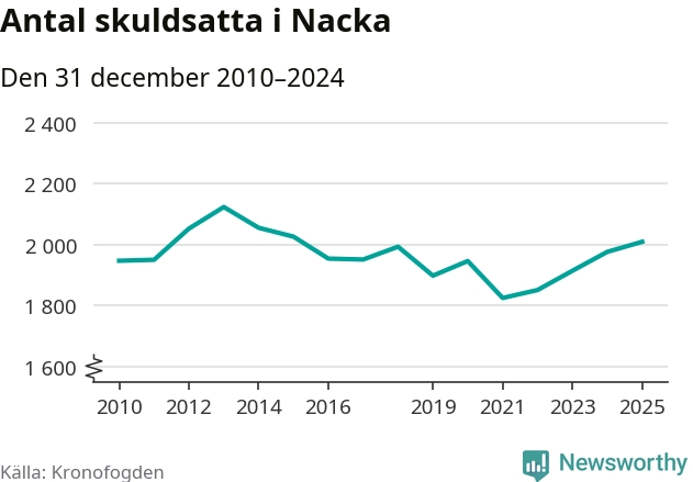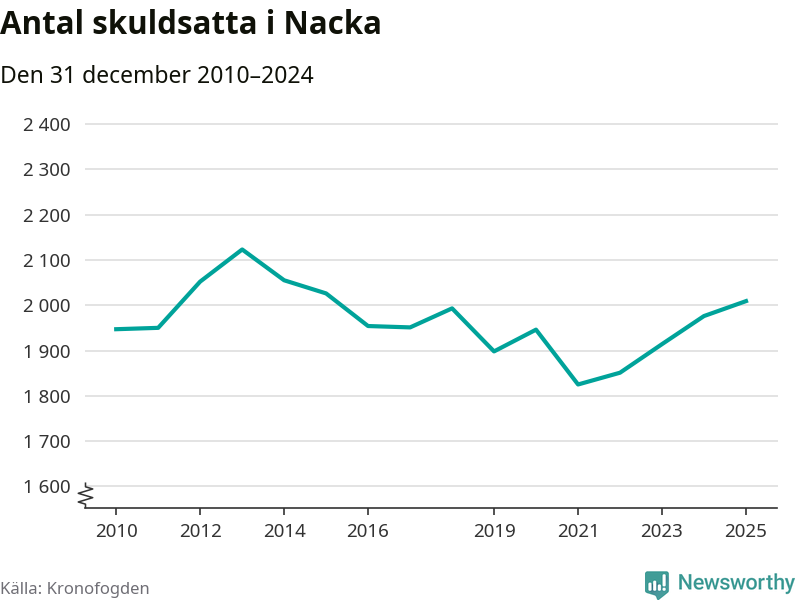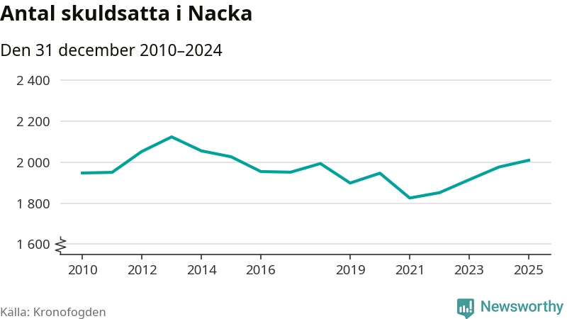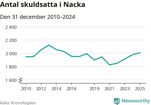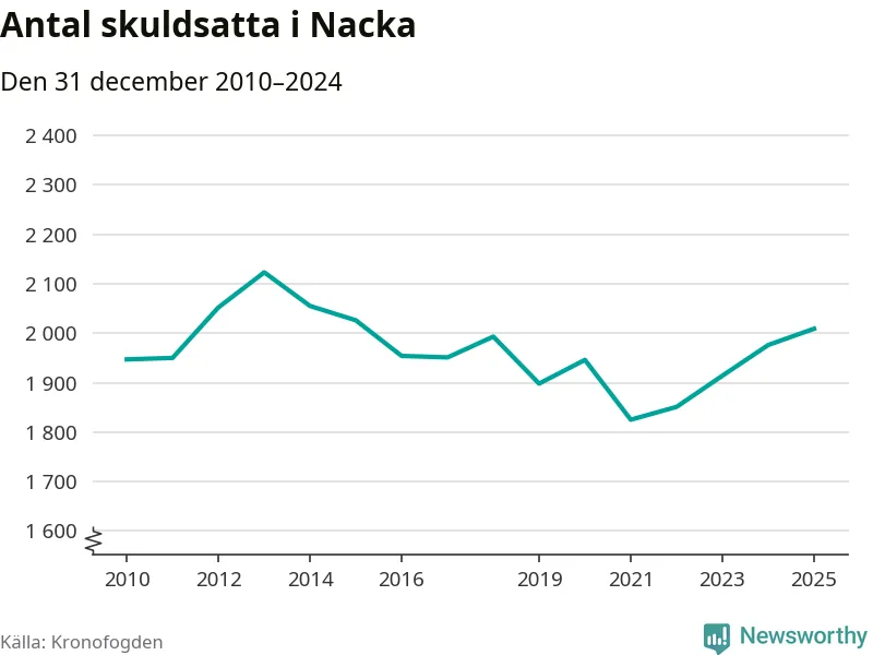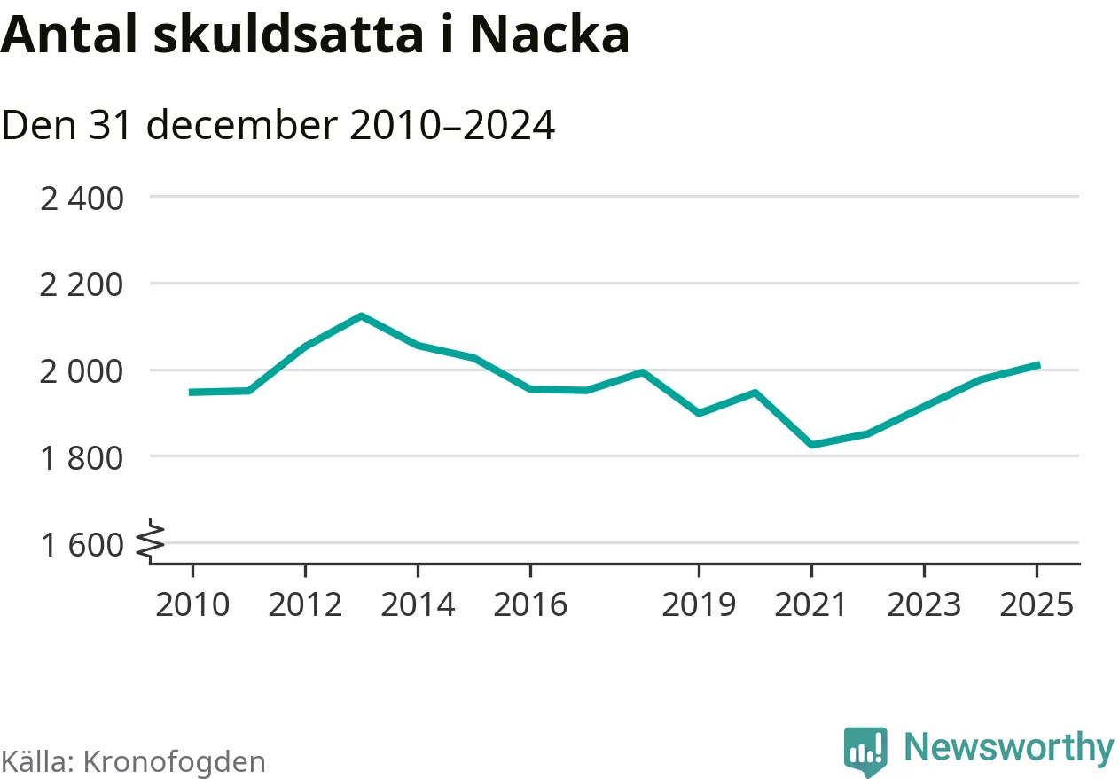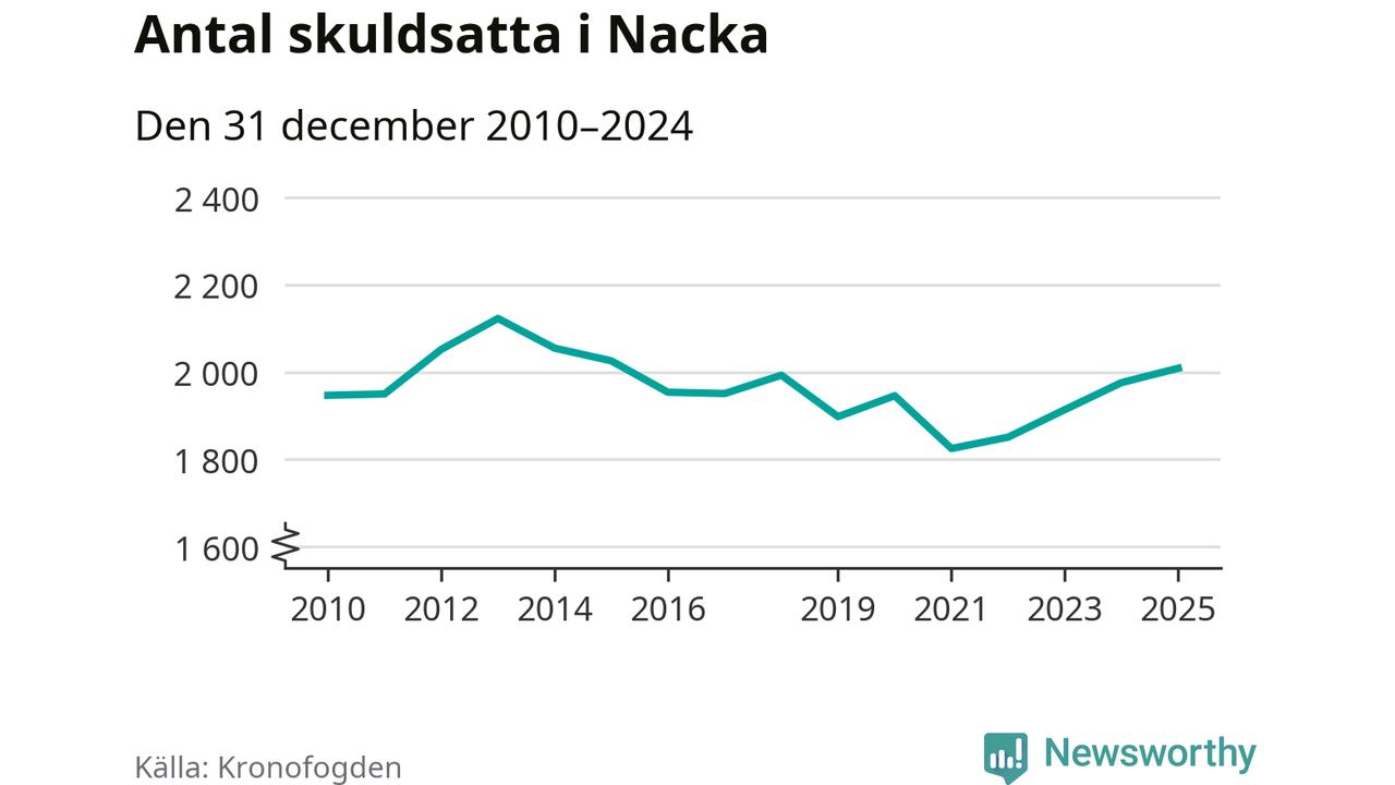 Allt fler Nackabor hamnar hos Kronofogden. Vid årskiftet var 2 009 invånare i kommunen skyldiga totalt 1,9 miljarder kronor. Det är en ökning med 33 personer – eller 2 procent – jämfört med året innan. Det är det högsta antalet sedan 2015.
