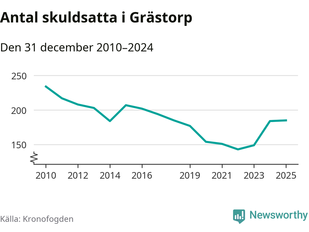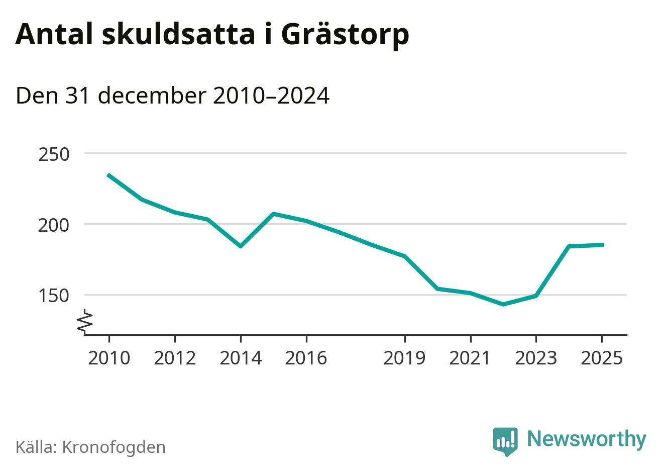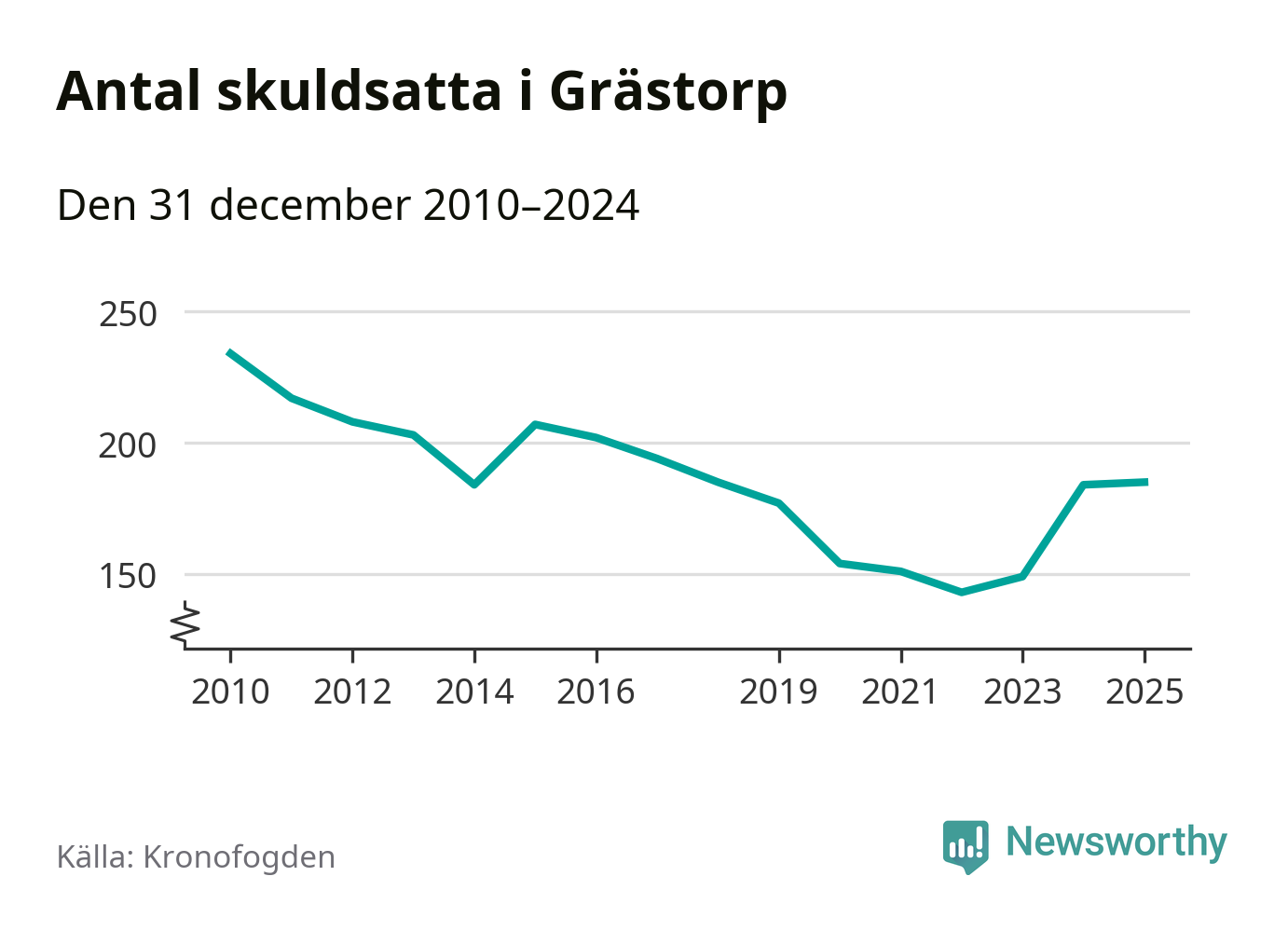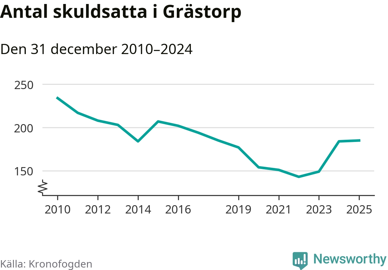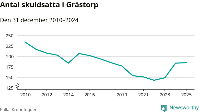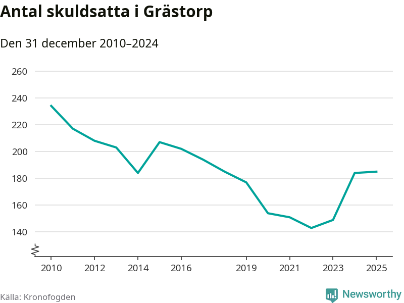 Vid årskiftet var 4 procent av alla Grästorpsbor över 18 år registrerade hos Kronofogden. Störst andel skuldsatta i länet finns i Färgelanda (7 procent), medan den lägsta andelen finns på Öckerö (2 procent).
