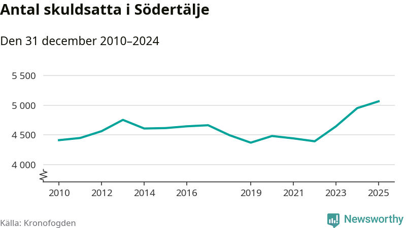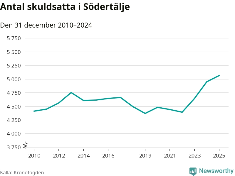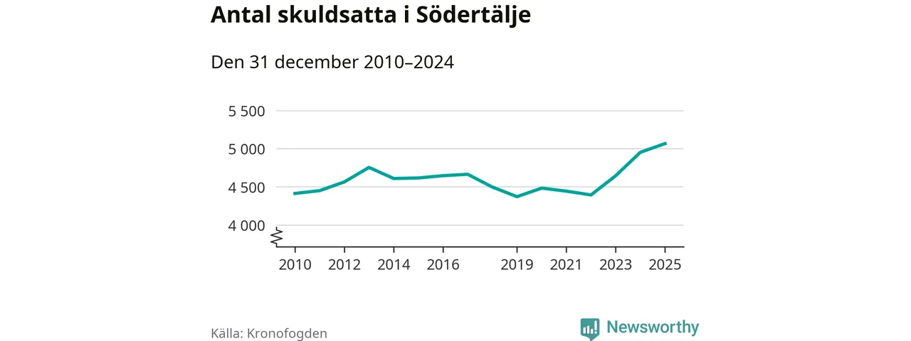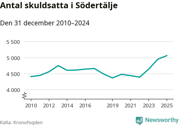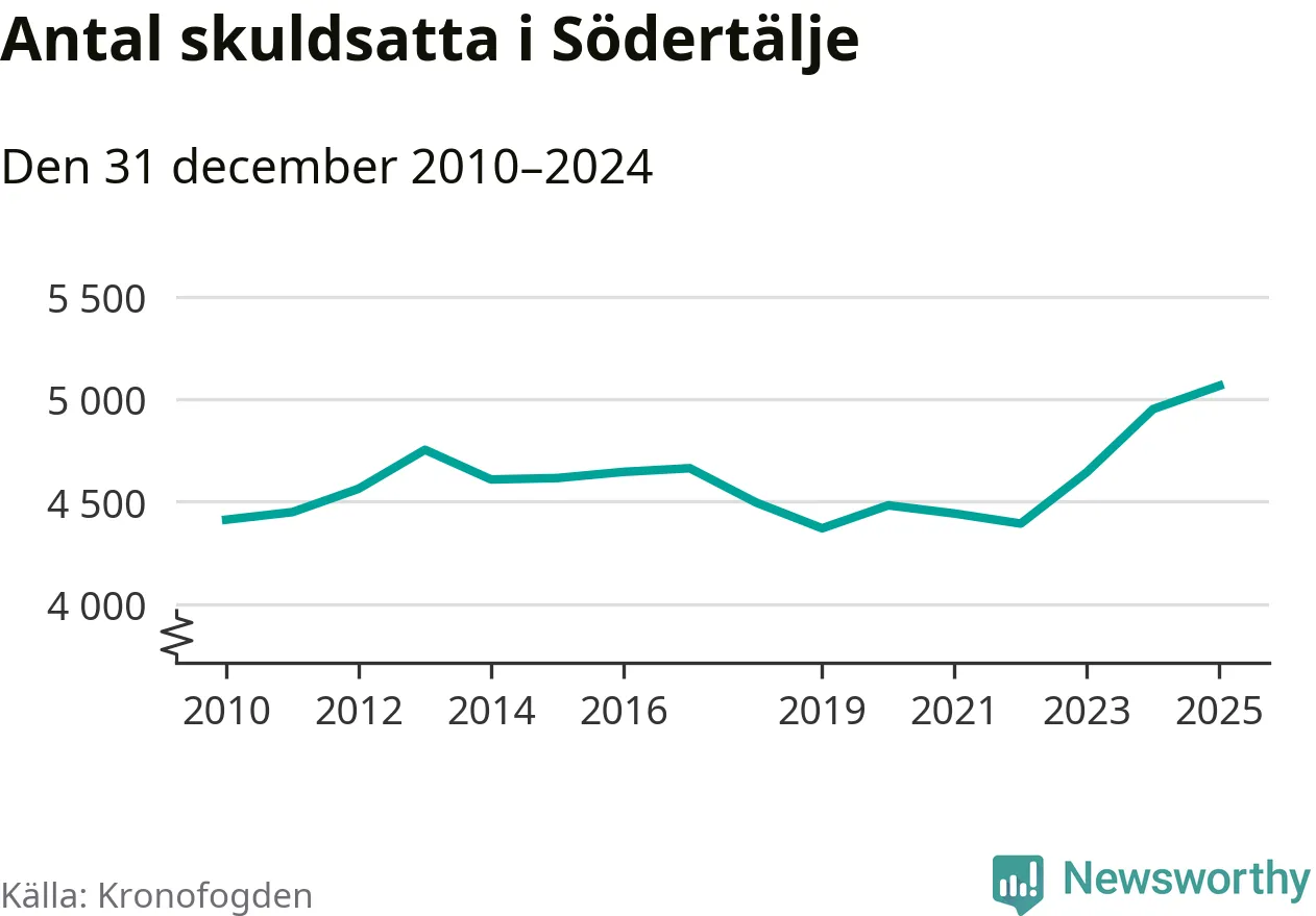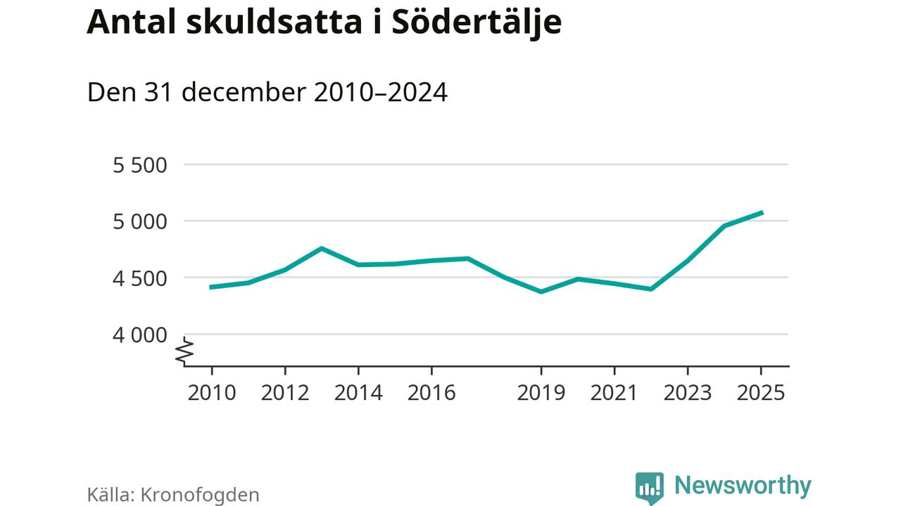 Inte sedan åtminstone 2010 har så många Södertäljebor hamnat hos Kronofogden. Vid årskiftet var 5 065 invånare i kommunen skyldiga totalt 2,1 miljarder kronor. Det är en ökning med 114 personer – eller 2 procent – jämfört med året innan.