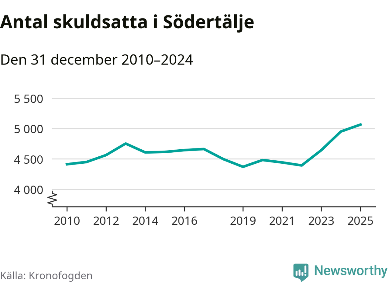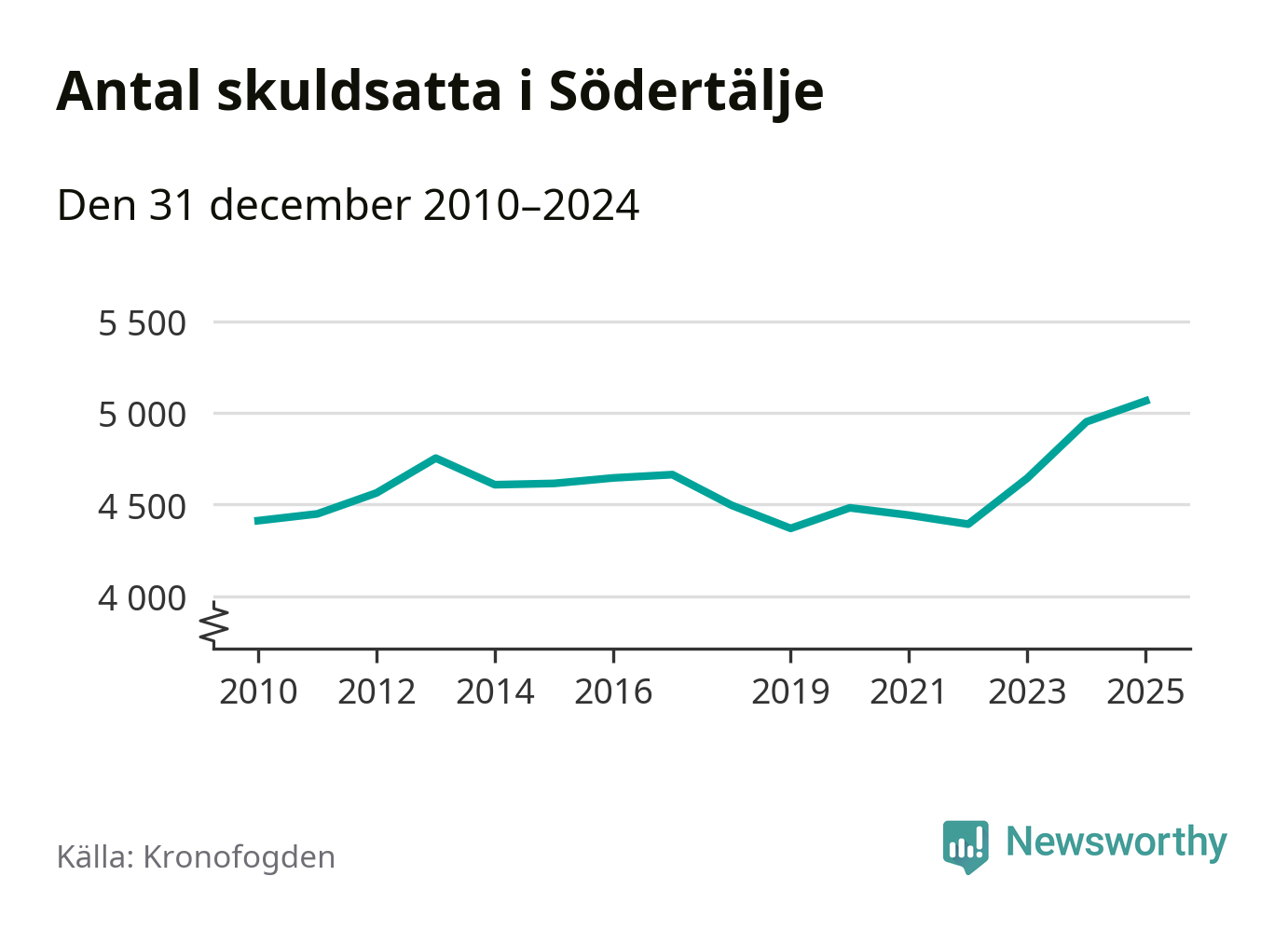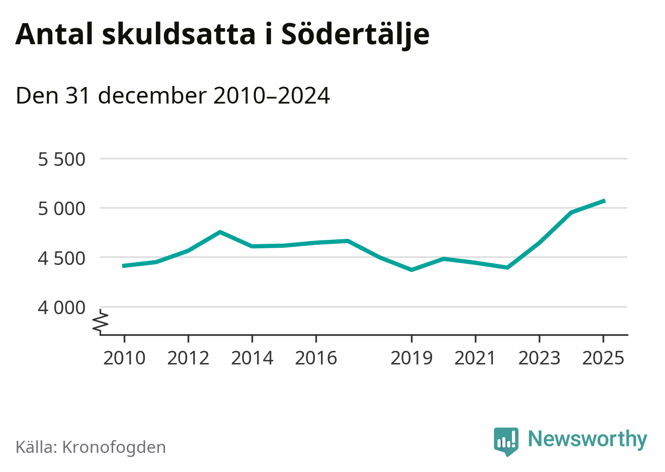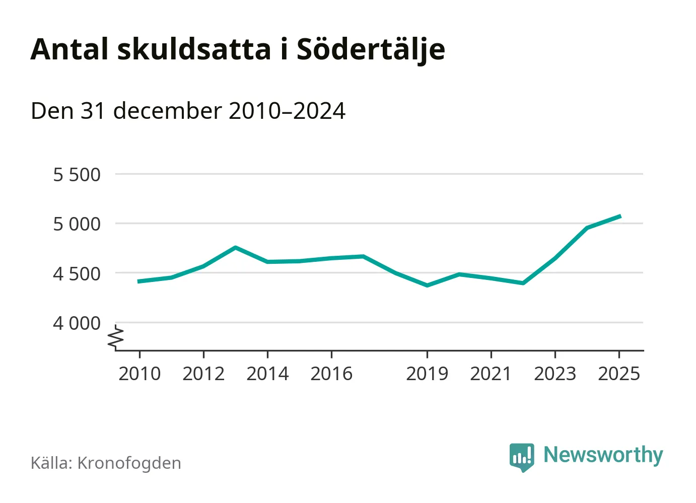 Inte sedan åtminstone 2010 har så många Södertäljebor hamnat hos Kronofogden. Vid årskiftet var 5 065 invånare i kommunen skyldiga totalt 2,1 miljarder kronor. Det är en ökning med 114 personer – eller 2 procent – jämfört med året innan.