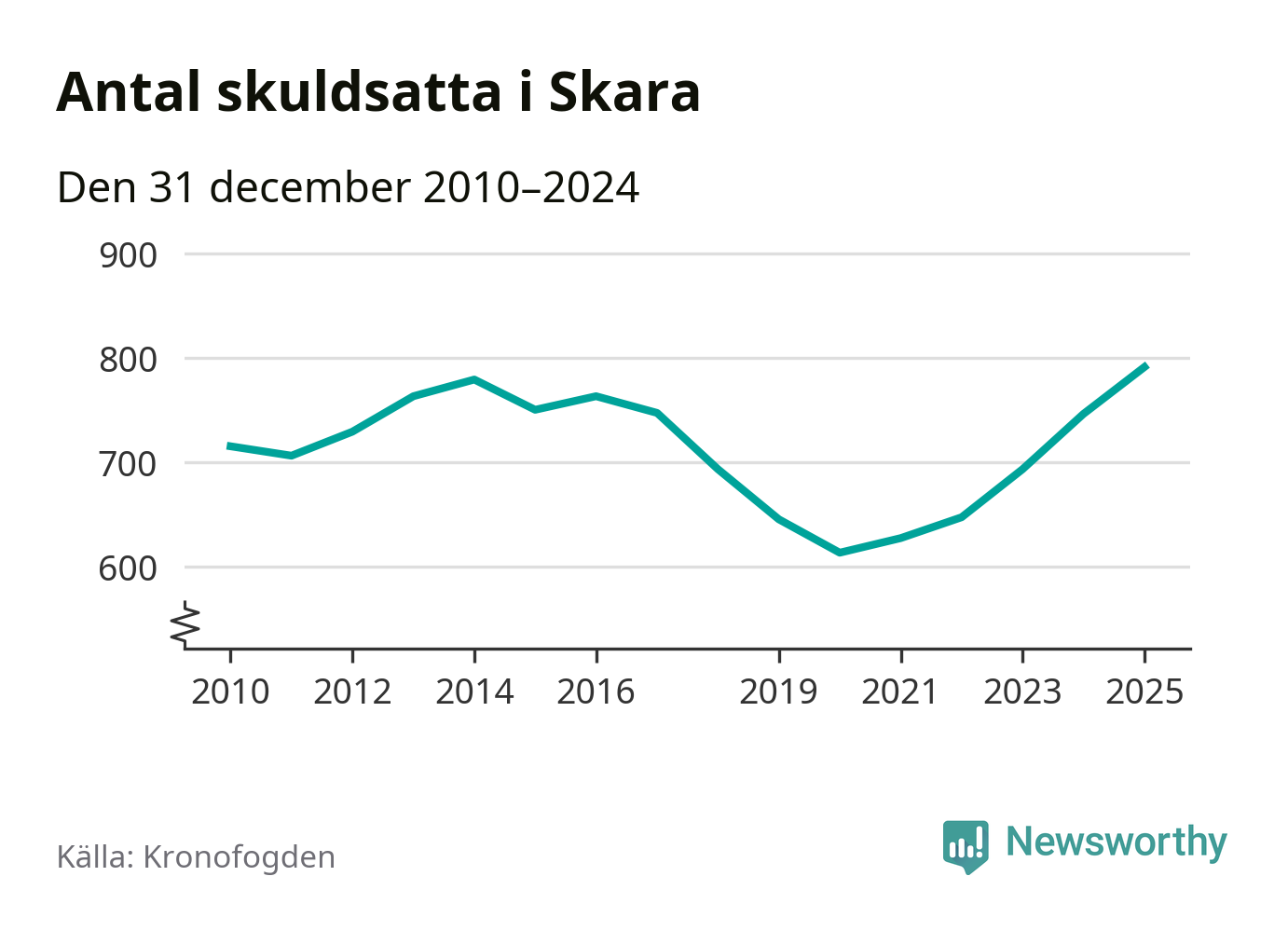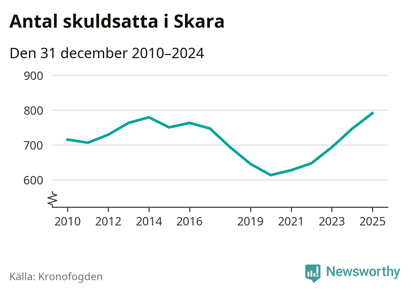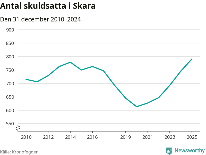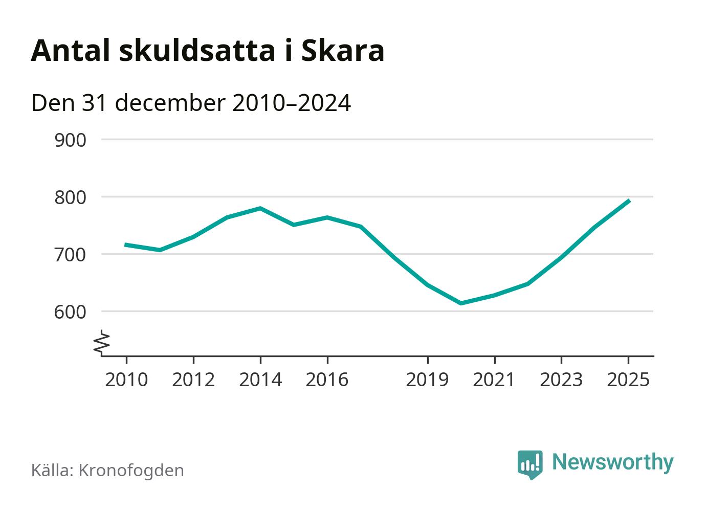 Inte sedan åtminstone 2010 har så många Skara­bor hamnat hos Kronofogden. Vid årskiftet var 791 invånare i kommunen skyldiga totalt 274,3 miljoner kronor. Det är en ökning med 45 personer – eller 6 procent – jämfört med året innan.