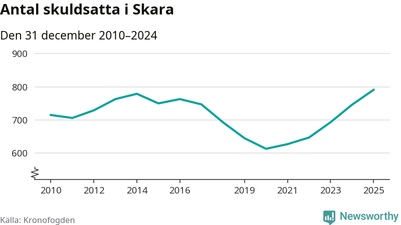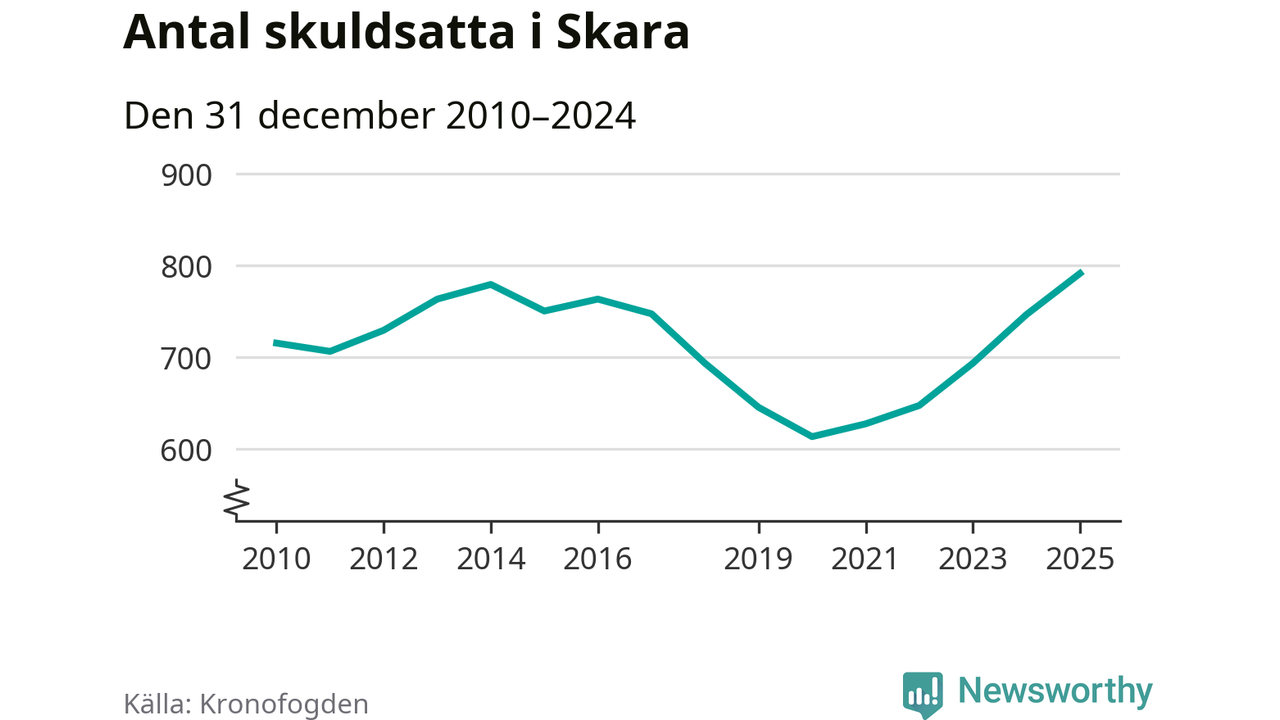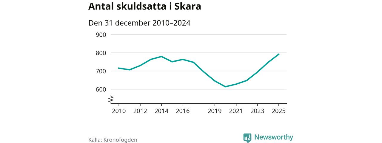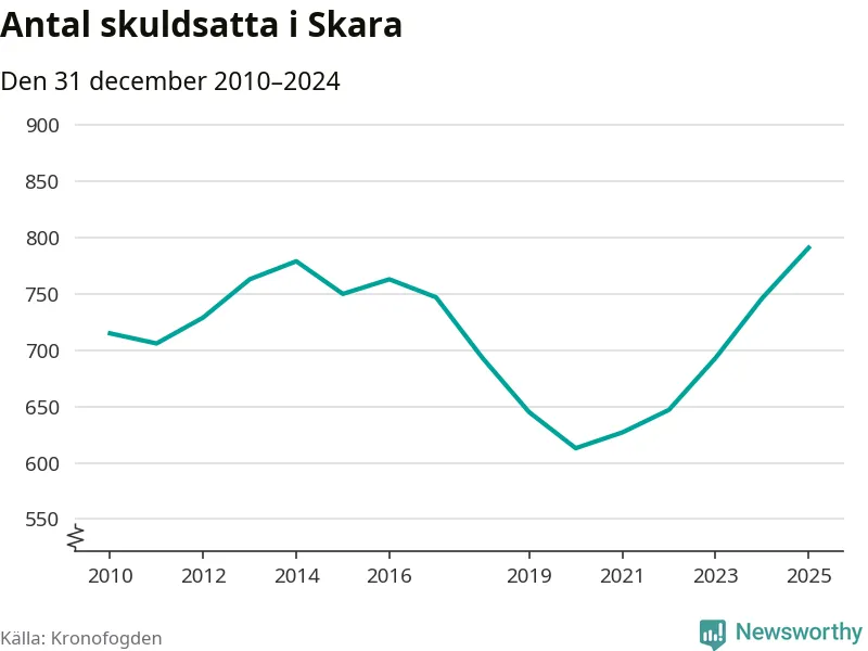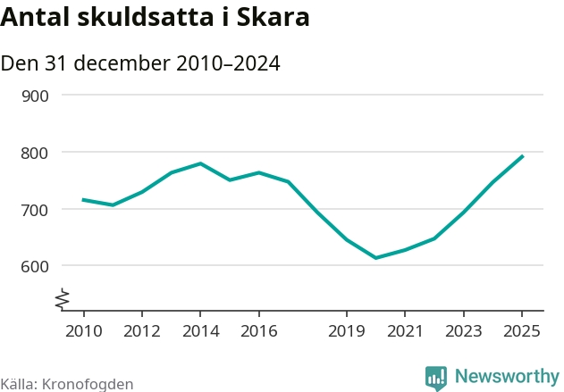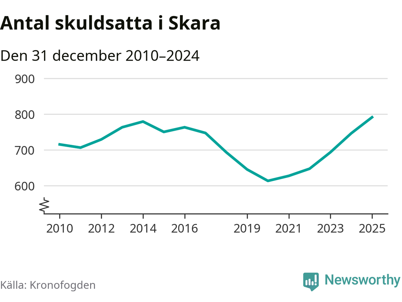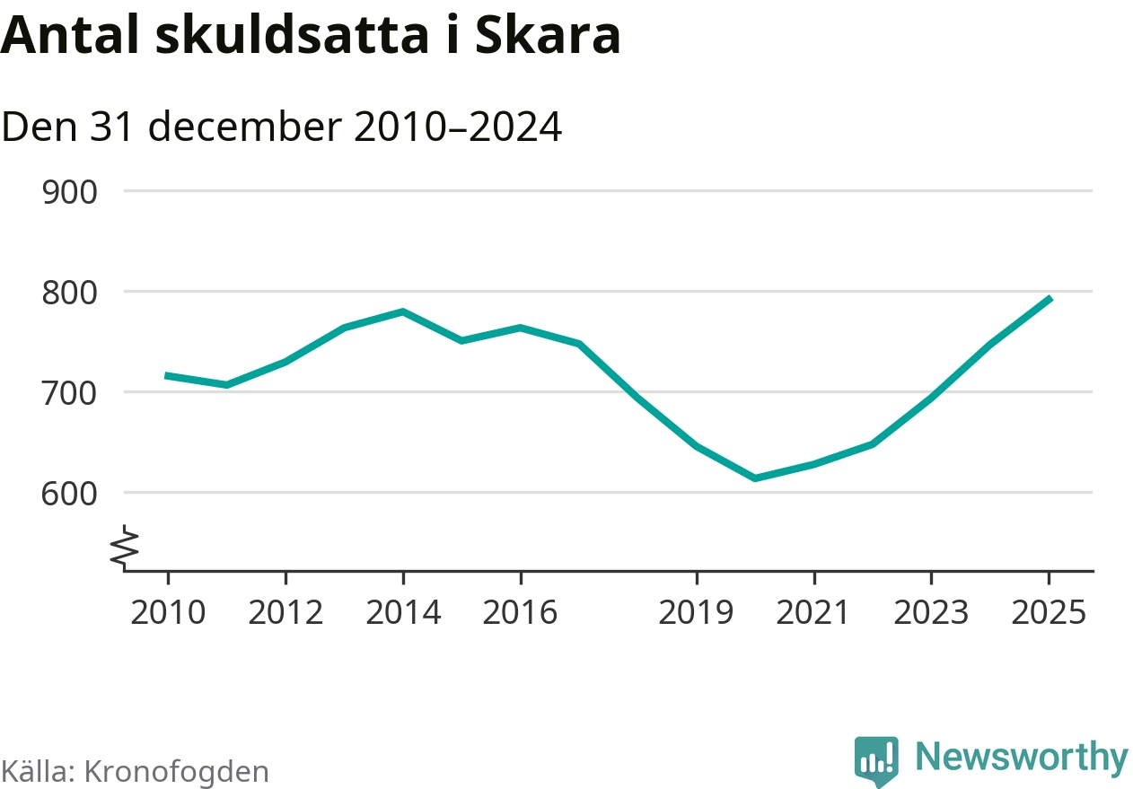 Inte sedan åtminstone 2010 har så många Skara­bor hamnat hos Kronofogden. Vid årskiftet var 791 invånare i kommunen skyldiga totalt 274,3 miljoner kronor. Det är en ökning med 45 personer – eller 6 procent – jämfört med året innan.