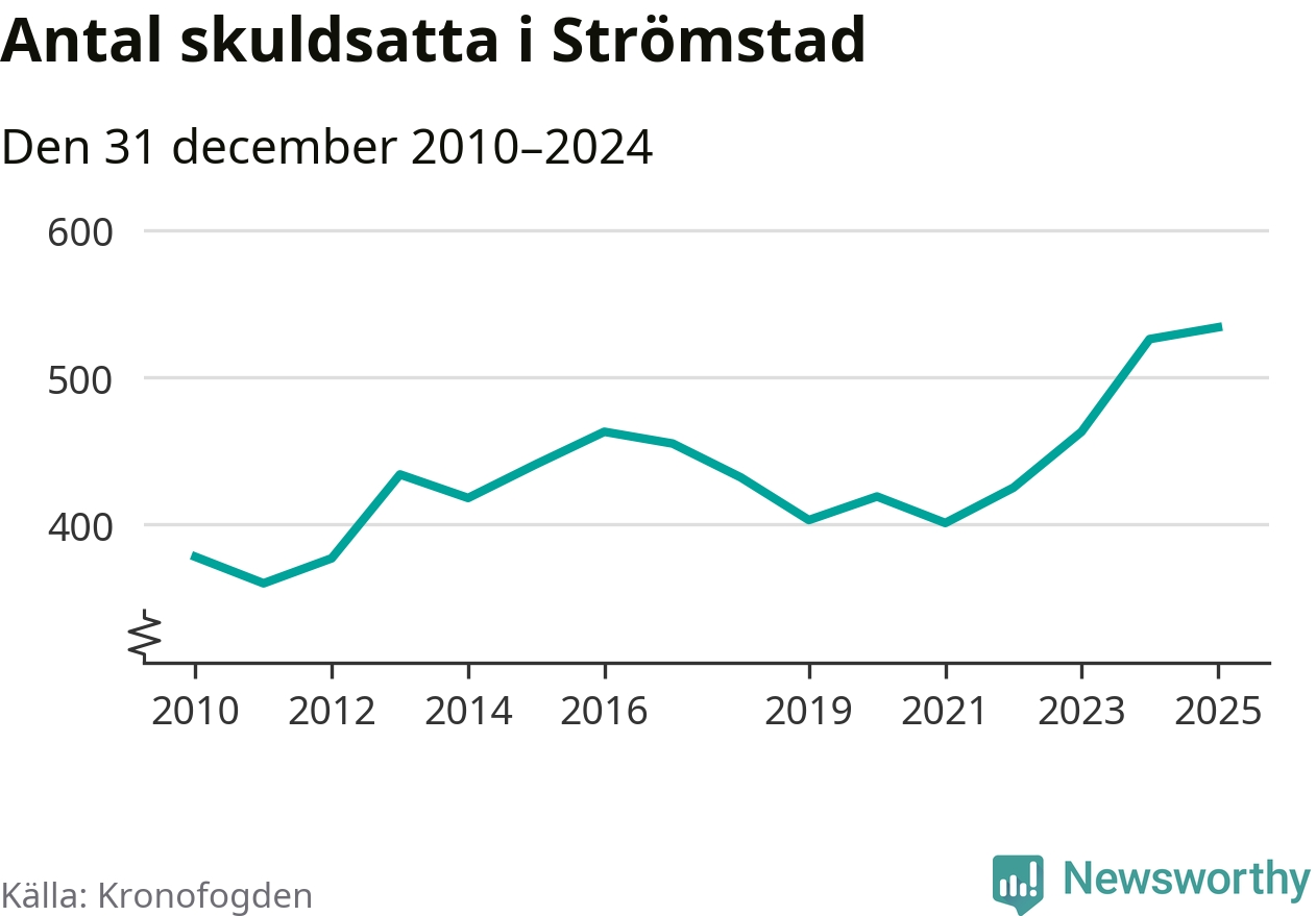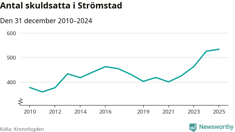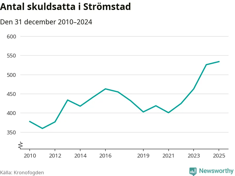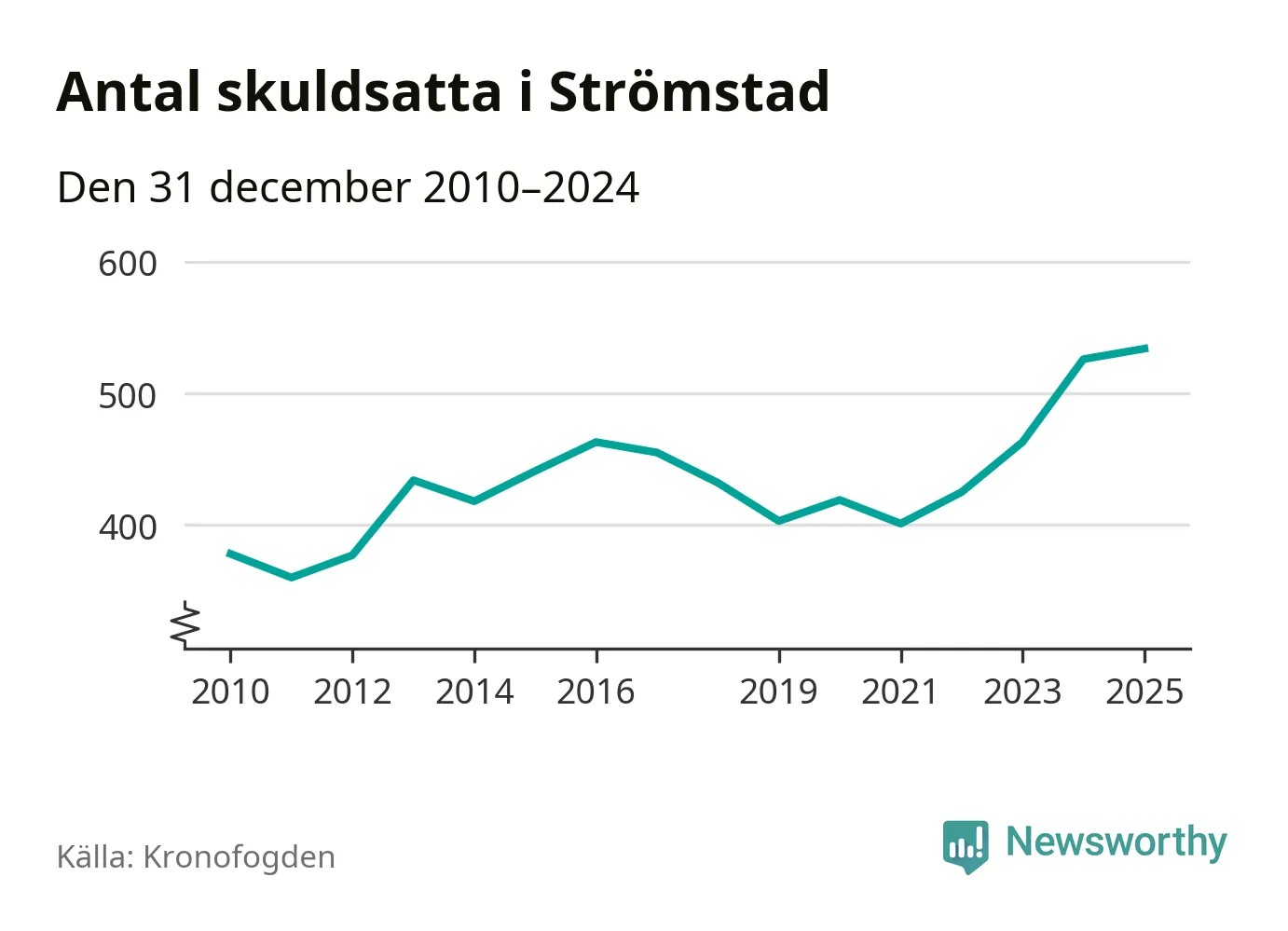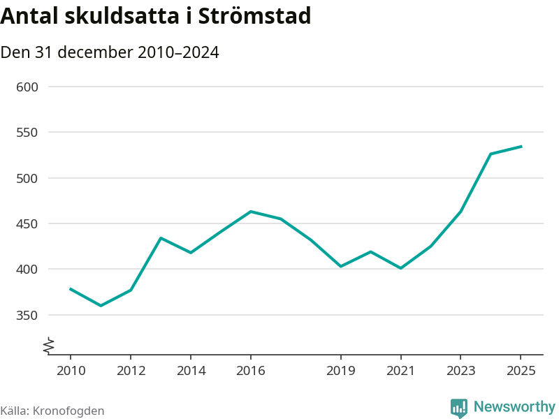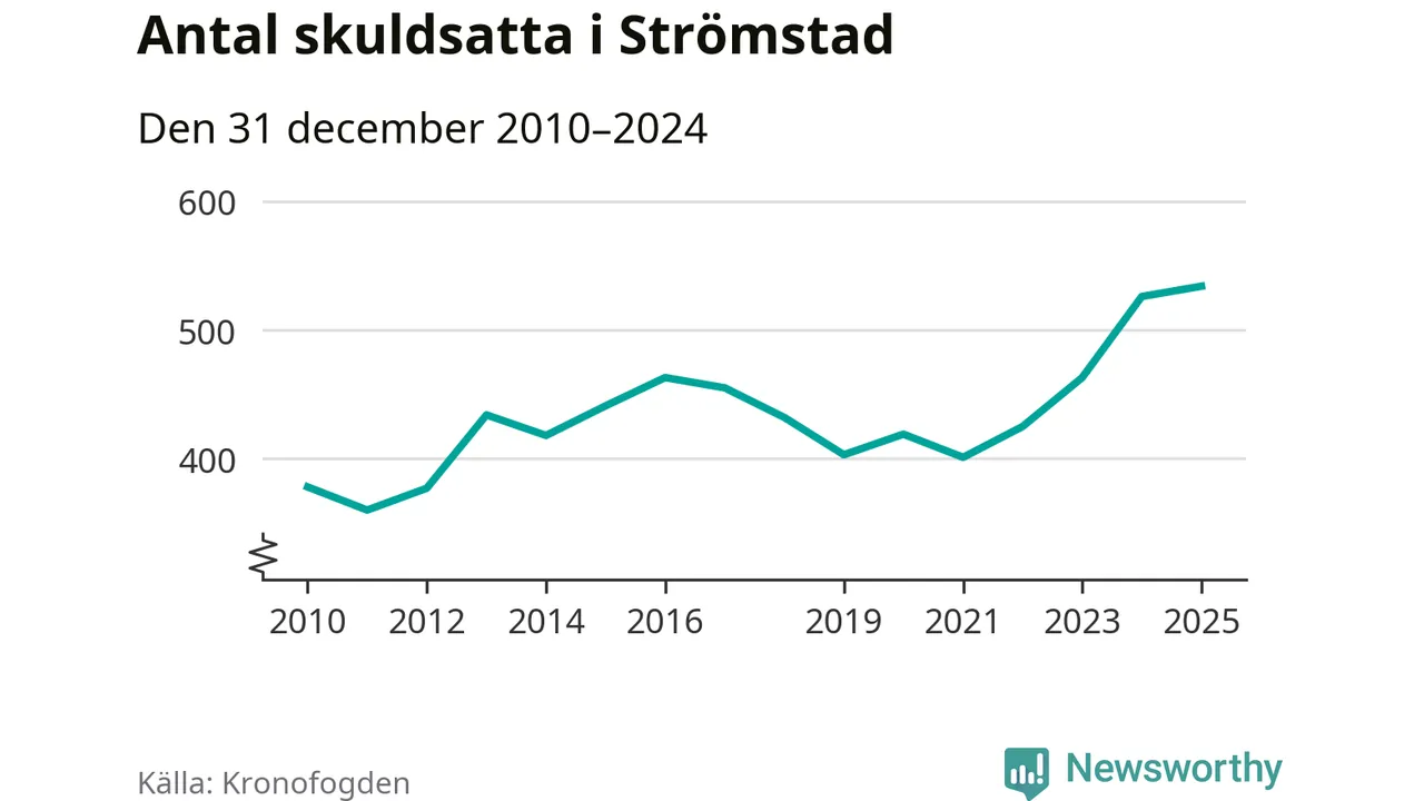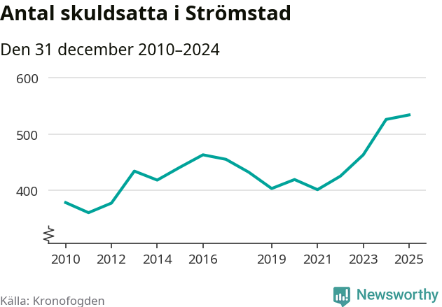 Inte sedan åtminstone 2010 har så många Strömstadsbor hamnat hos Kronofogden. Vid årskiftet var 534 invånare i kommunen skyldiga totalt 320,3 miljoner kronor. Det är en ökning med åtta personer jämfört med året innan.