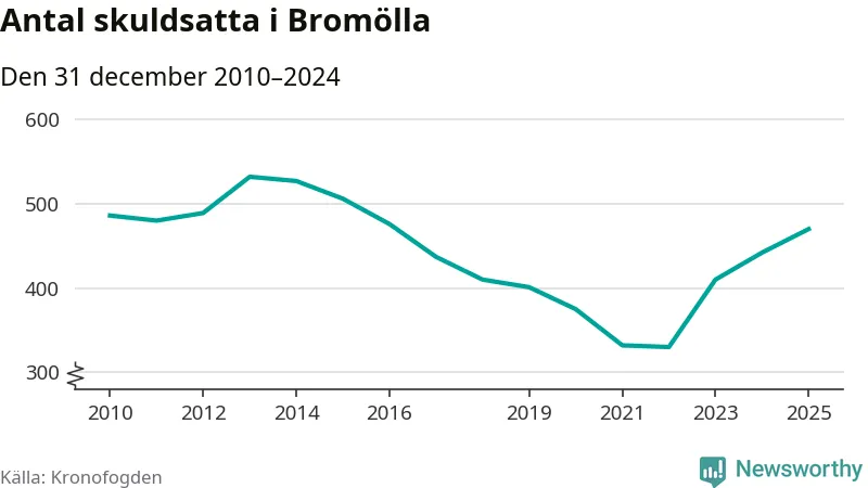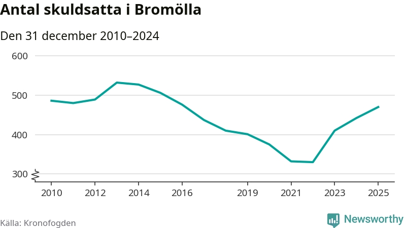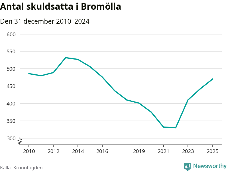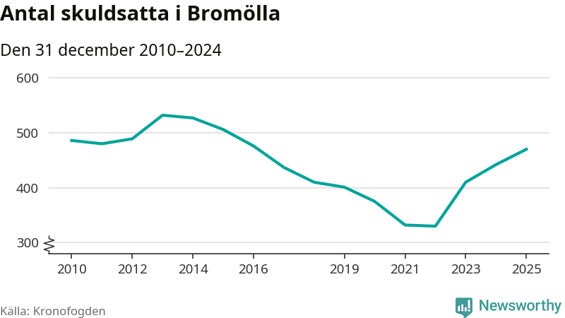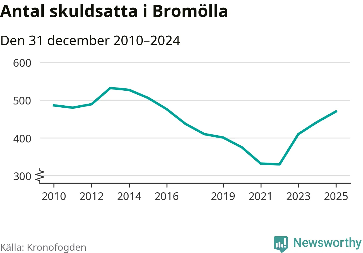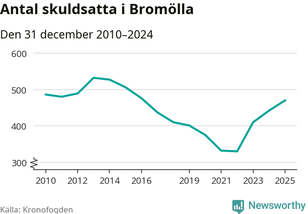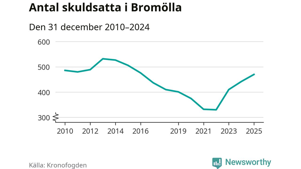 Allt fler Bromöllabor hamnar hos Kronofogden. Vid årskiftet var 470 invånare i kommunen skyldiga totalt 146,3 miljoner kronor. Det är en ökning med 28 personer – eller 6 procent – jämfört med året innan. Det är det högsta antalet sedan 2016.