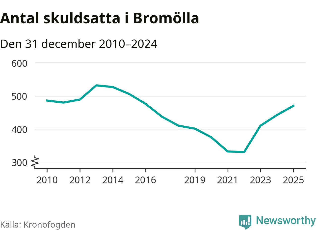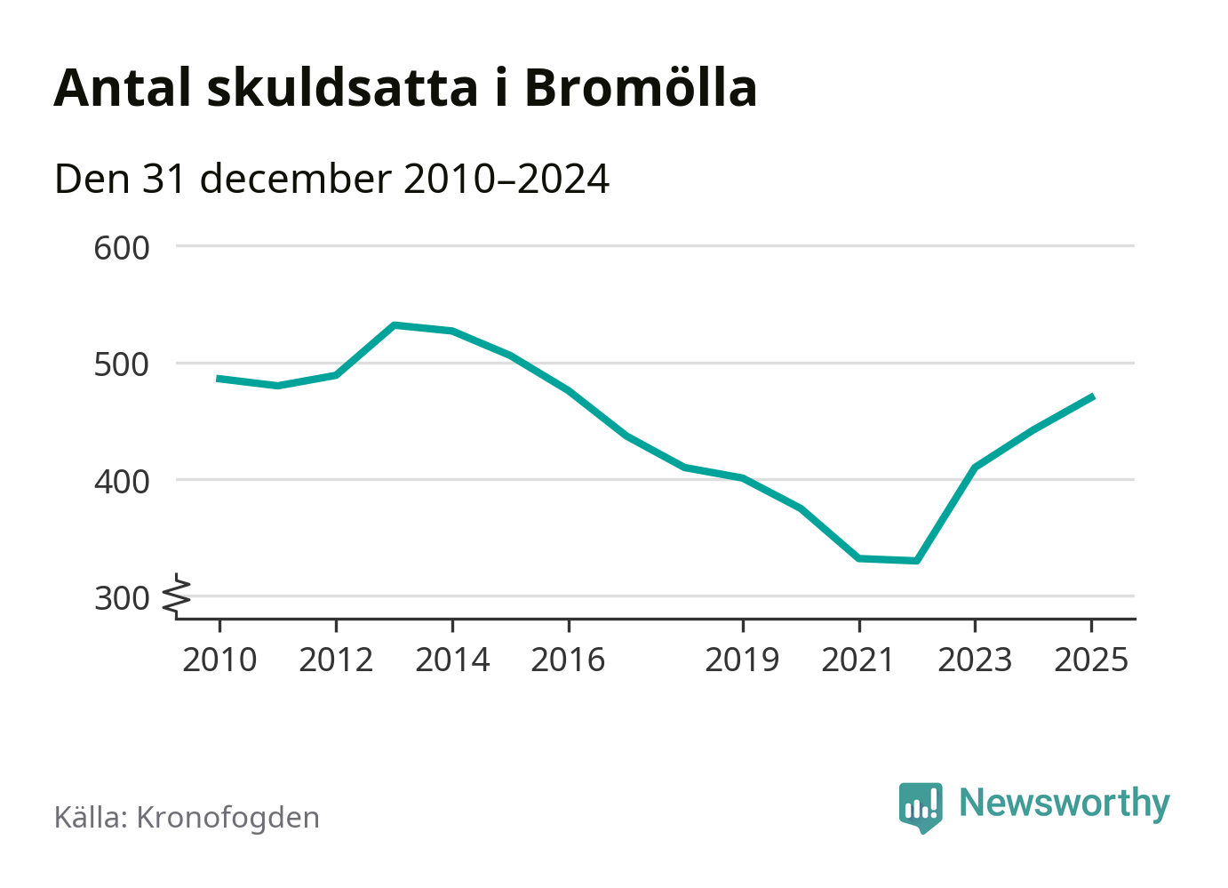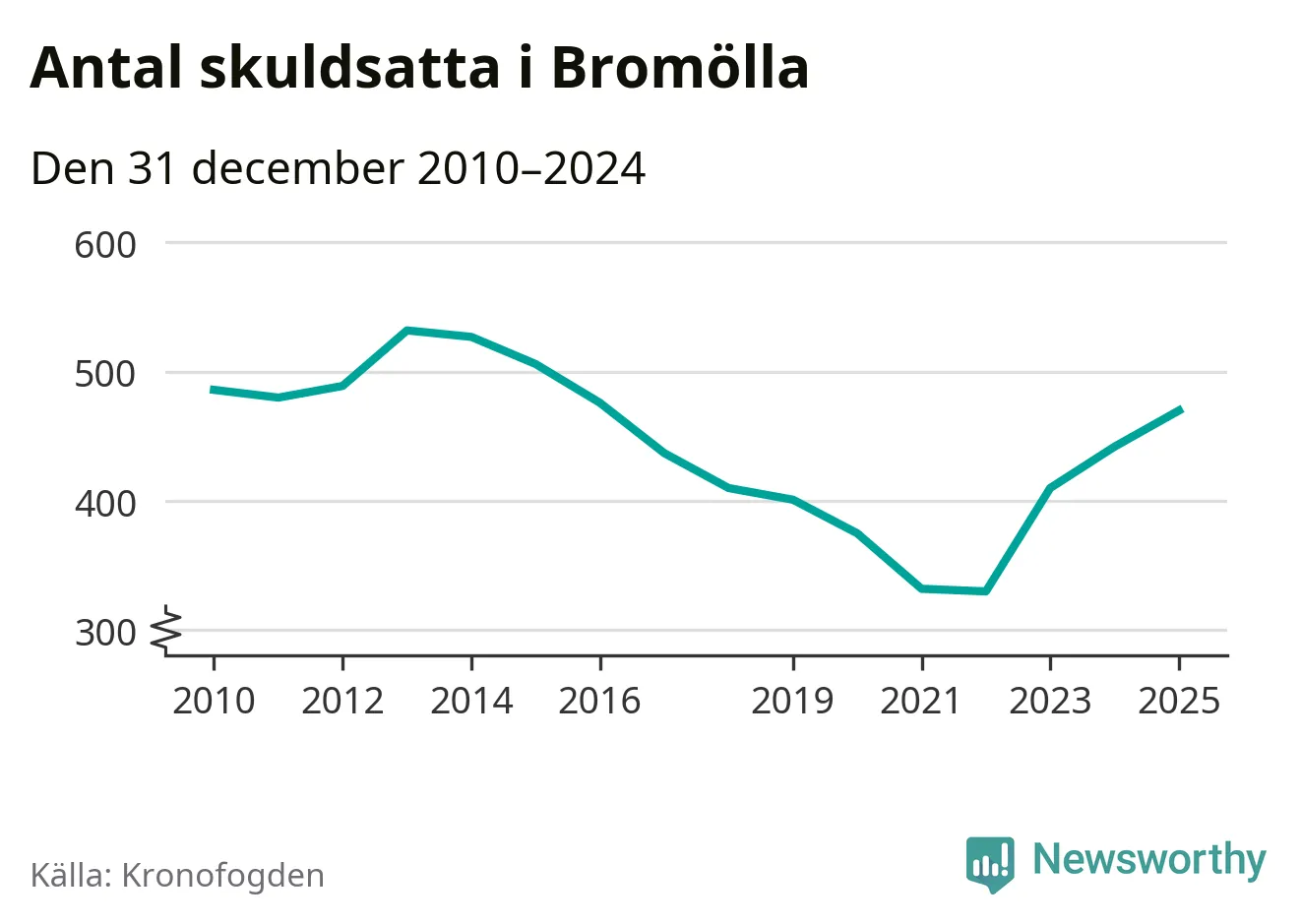 Allt fler Bromöllabor hamnar hos Kronofogden. Vid årskiftet var 470 invånare i kommunen skyldiga totalt 146,3 miljoner kronor. Det är en ökning med 28 personer – eller 6 procent – jämfört med året innan. Det är det högsta antalet sedan 2016.