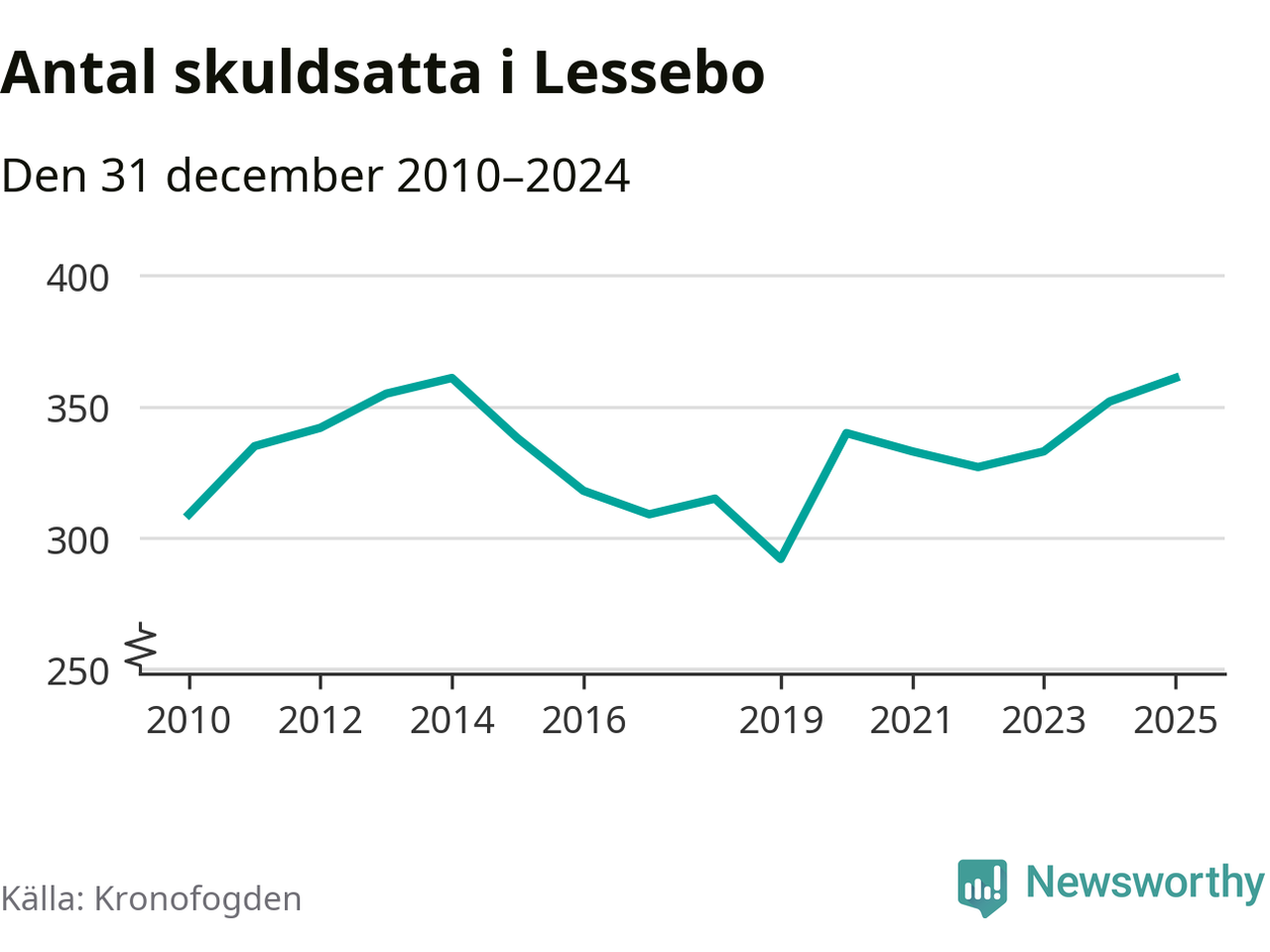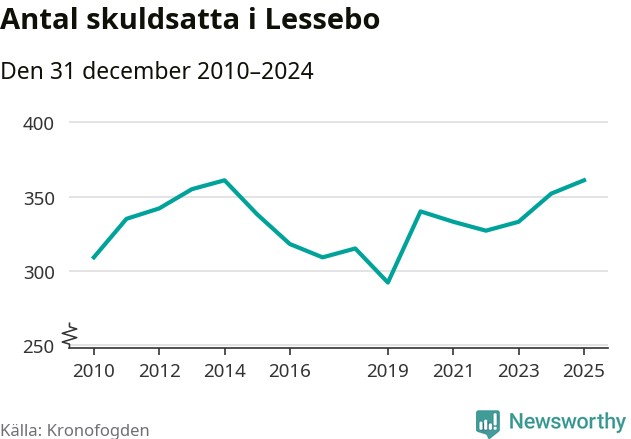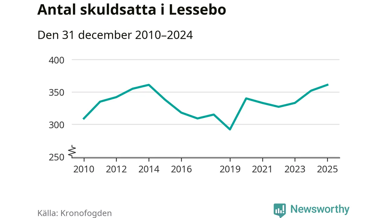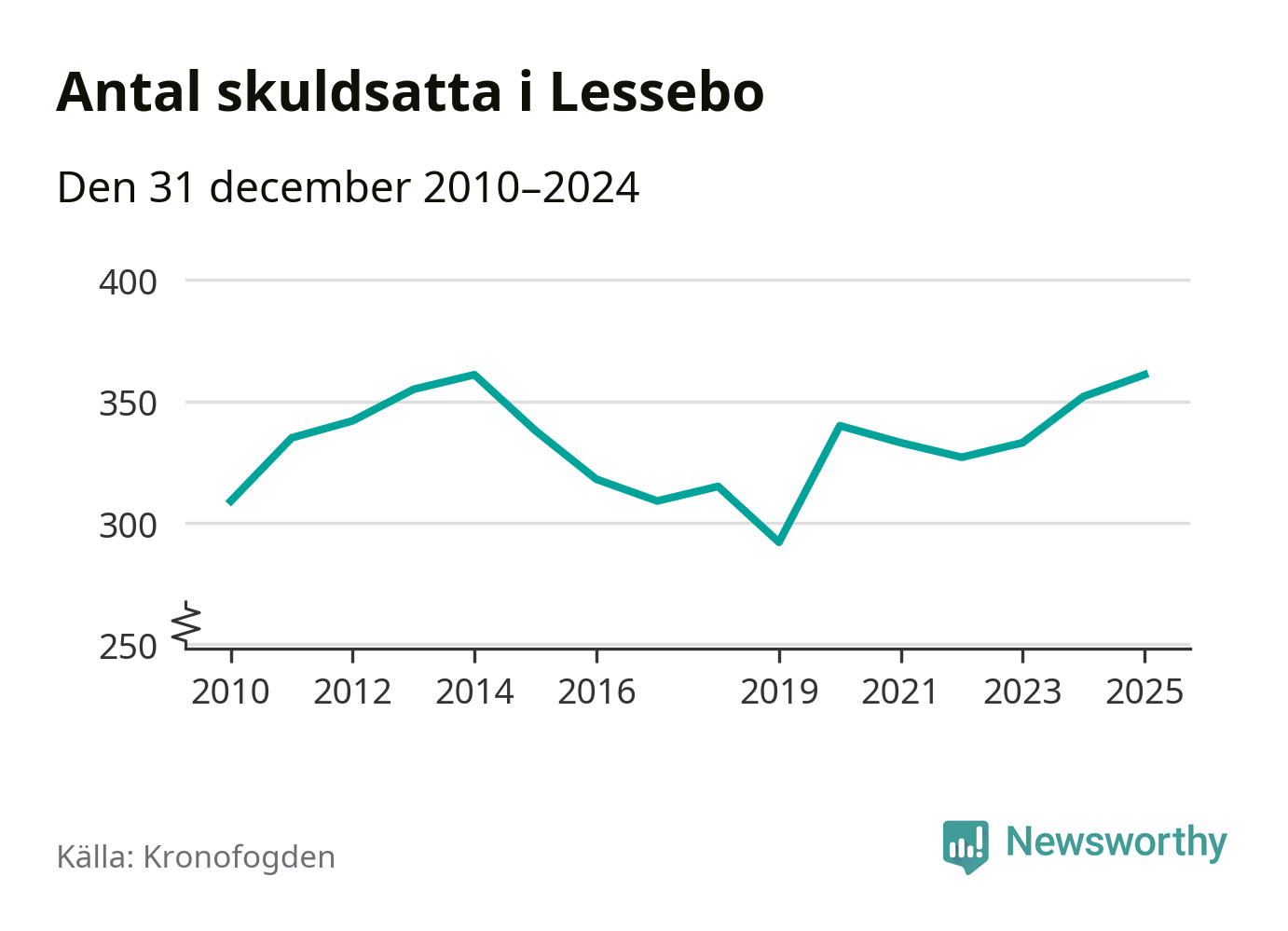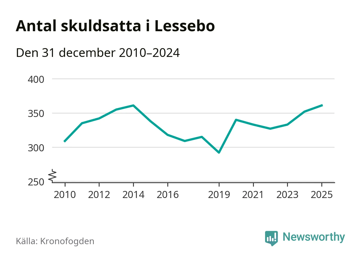 Allt fler Lessebo­bor hamnar hos Kronofogden. Vid årskiftet var 361 invånare i kommunen skyldiga totalt 116,5 miljoner kronor. Det är en ökning med nio personer jämfört med året innan. Det är det högsta antalet sedan 2014.