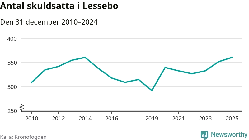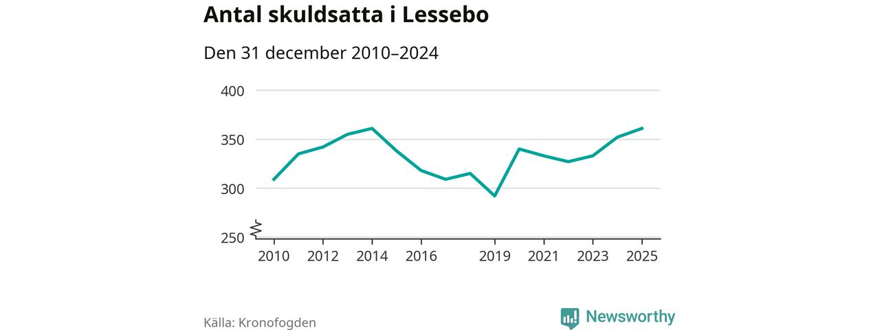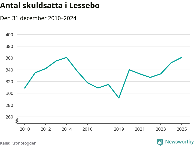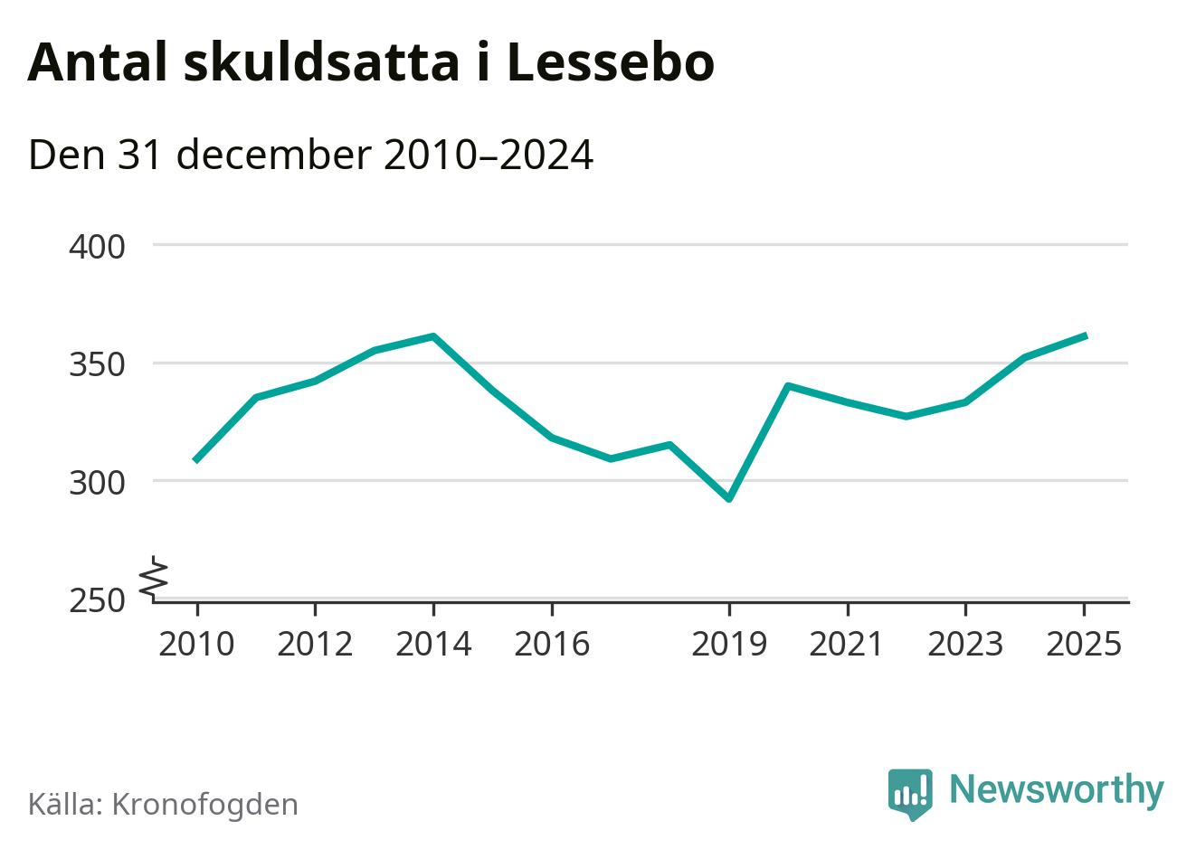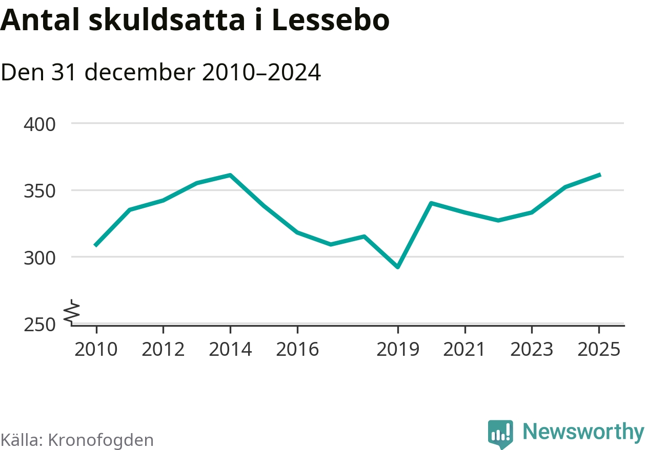 Allt fler Lessebo­bor hamnar hos Kronofogden. Vid årskiftet var 361 invånare i kommunen skyldiga totalt 116,5 miljoner kronor. Det är en ökning med nio personer jämfört med året innan. Det är det högsta antalet sedan 2014.