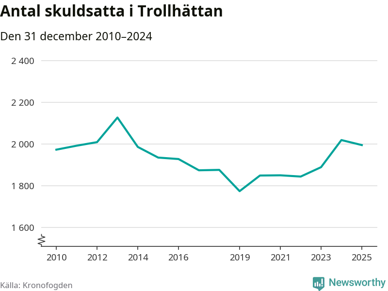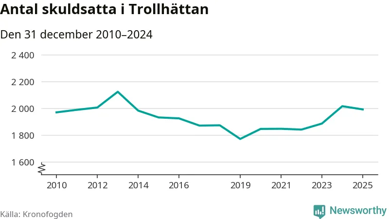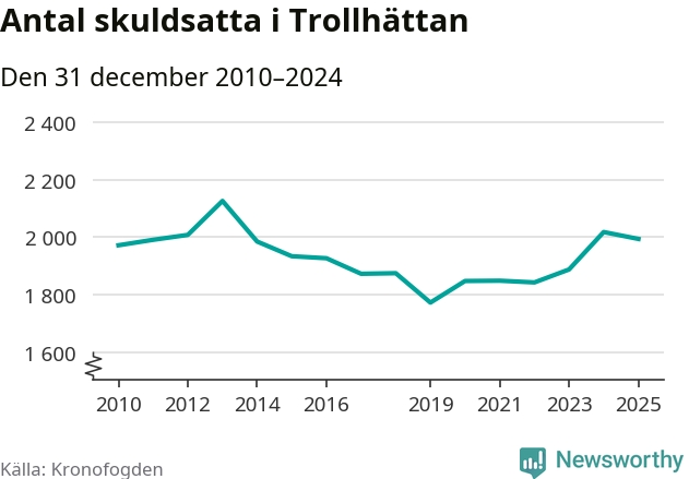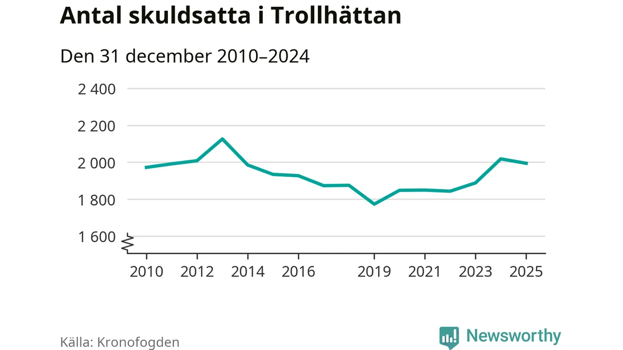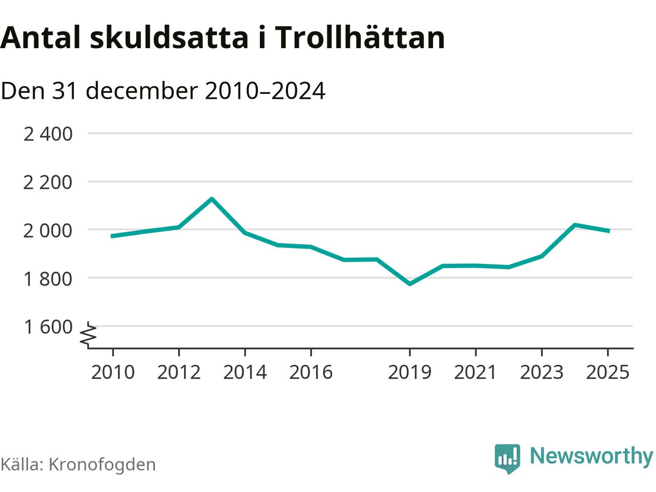 Vid årskiftet var 4 procent av alla Trollhättebor över 18 år registrerade hos Kronofogden. Störst andel skuldsatta i länet finns i Färgelanda (7 procent), medan den lägsta andelen finns på Öckerö (2 procent).