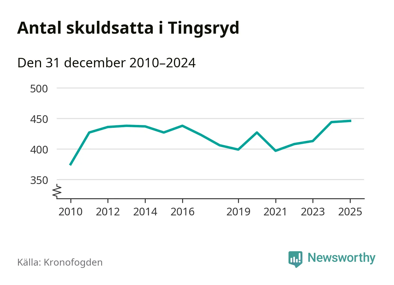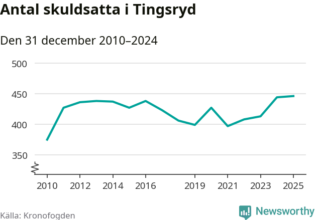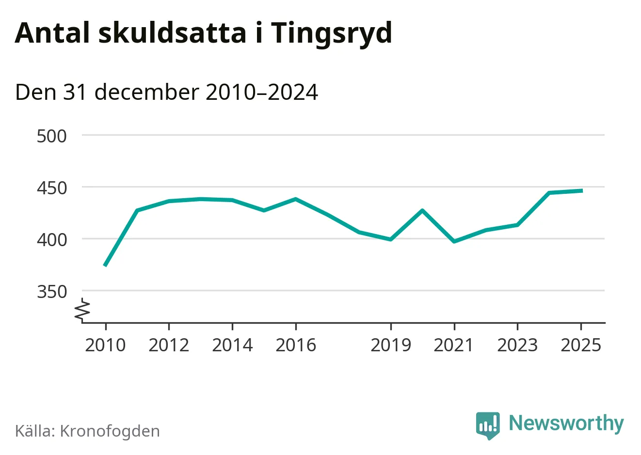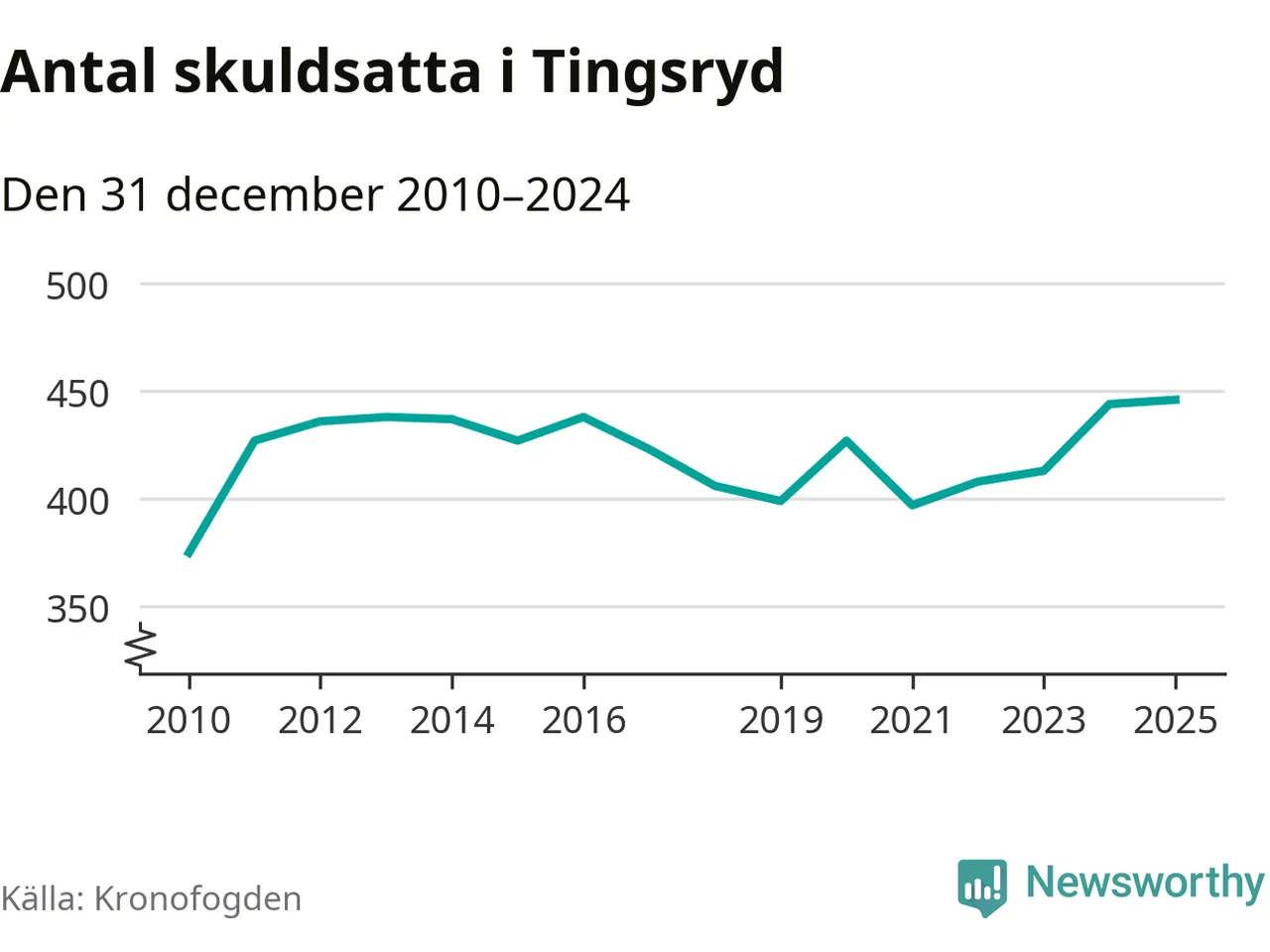 Inte sedan åtminstone 2010 har så många Tingsrydsbor hamnat hos Kronofogden. Vid årskiftet var 446 invånare i kommunen skyldiga totalt 118,4 miljoner kronor.