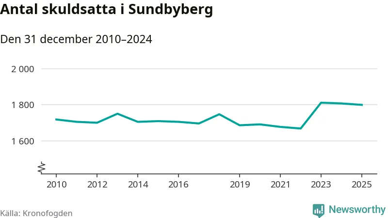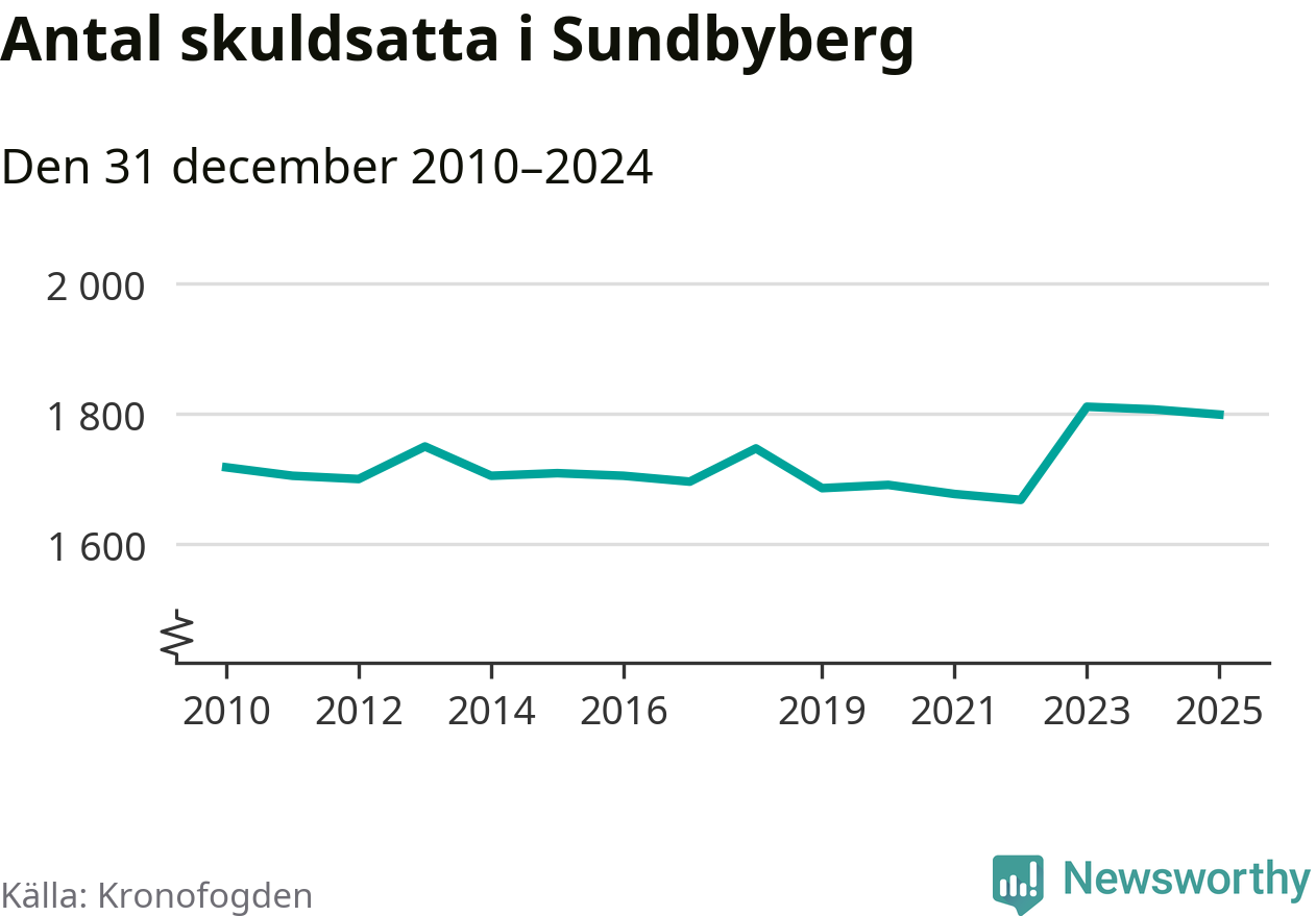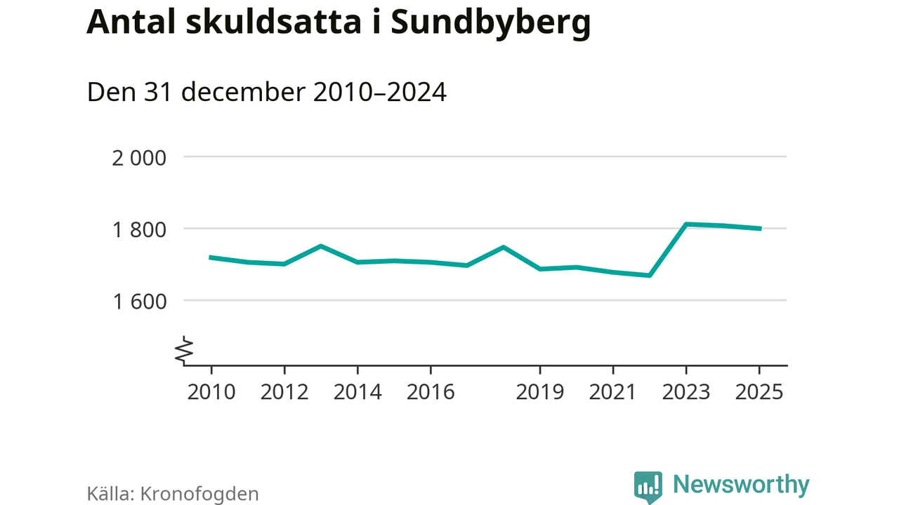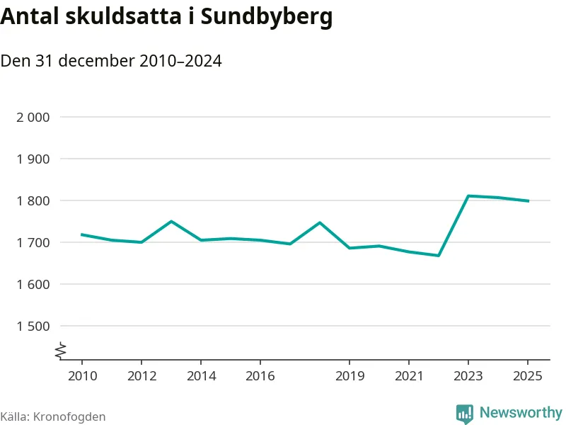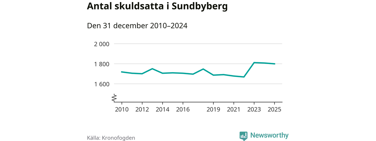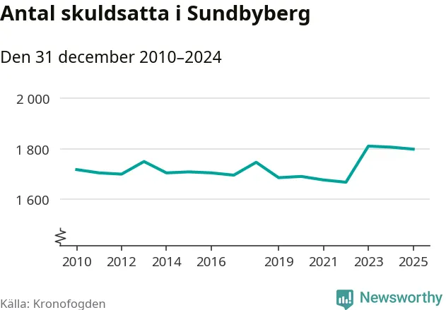 Vid årskiftet var 4 procent av alla Sundbybergs­bor över 18 år registrerade hos Kronofogden. Störst andel skuldsatta i länet finns i Botkyrka (6 procent), medan den lägsta andelen finns i Danderyd (1 procent).